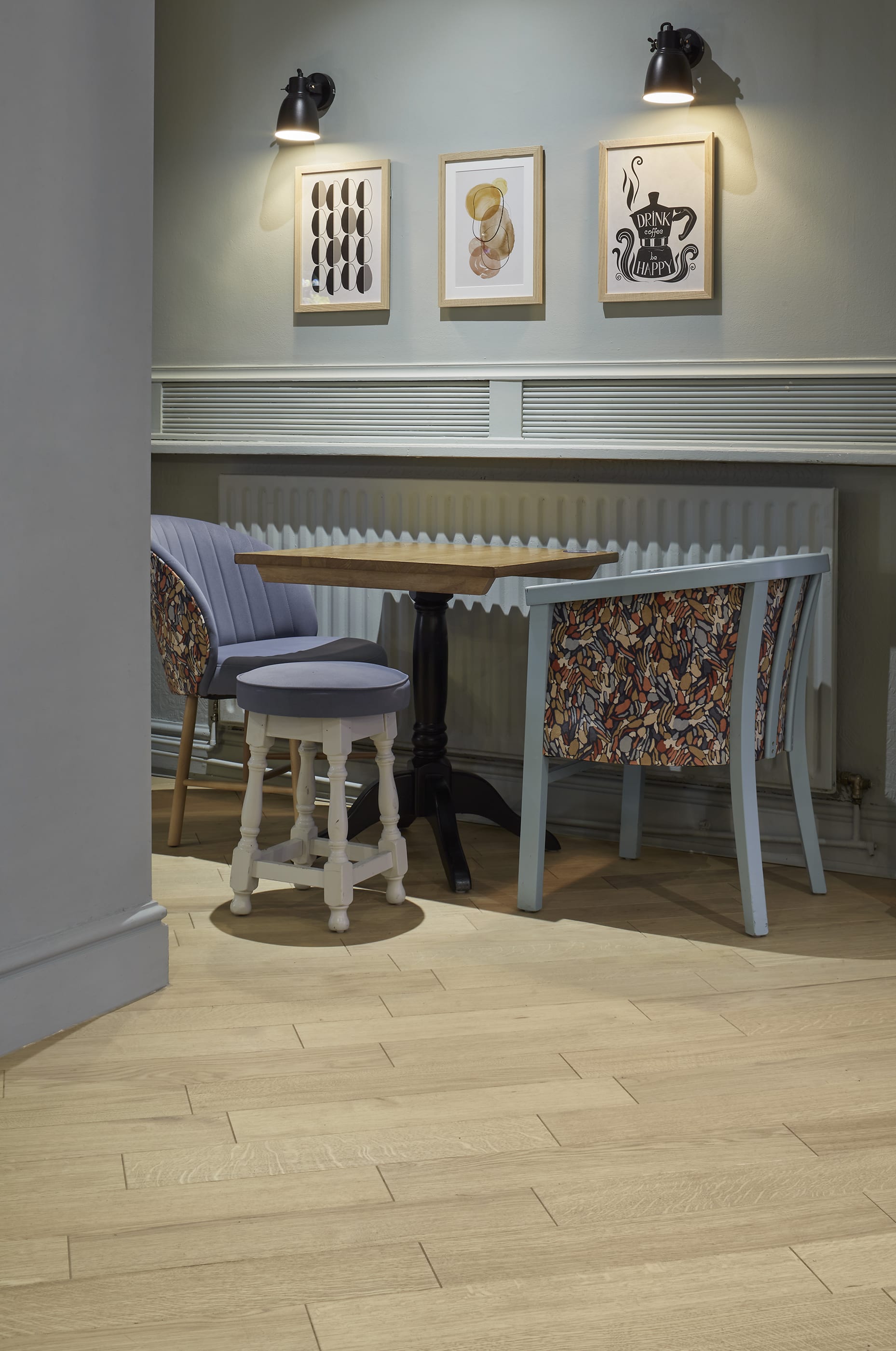 One of the key elements of The Fox's renovation was the use of sustainable flooring from Havwoods. Two products from Havwoods were chosen for the bar and restaurant: the first one was an FSC® (FSC-COO9500) Certified Amalgama from The Italian Collection, and the second was Amazon Prime (Cradle to Cradle Certified Bronze) from Venture Plank collection.