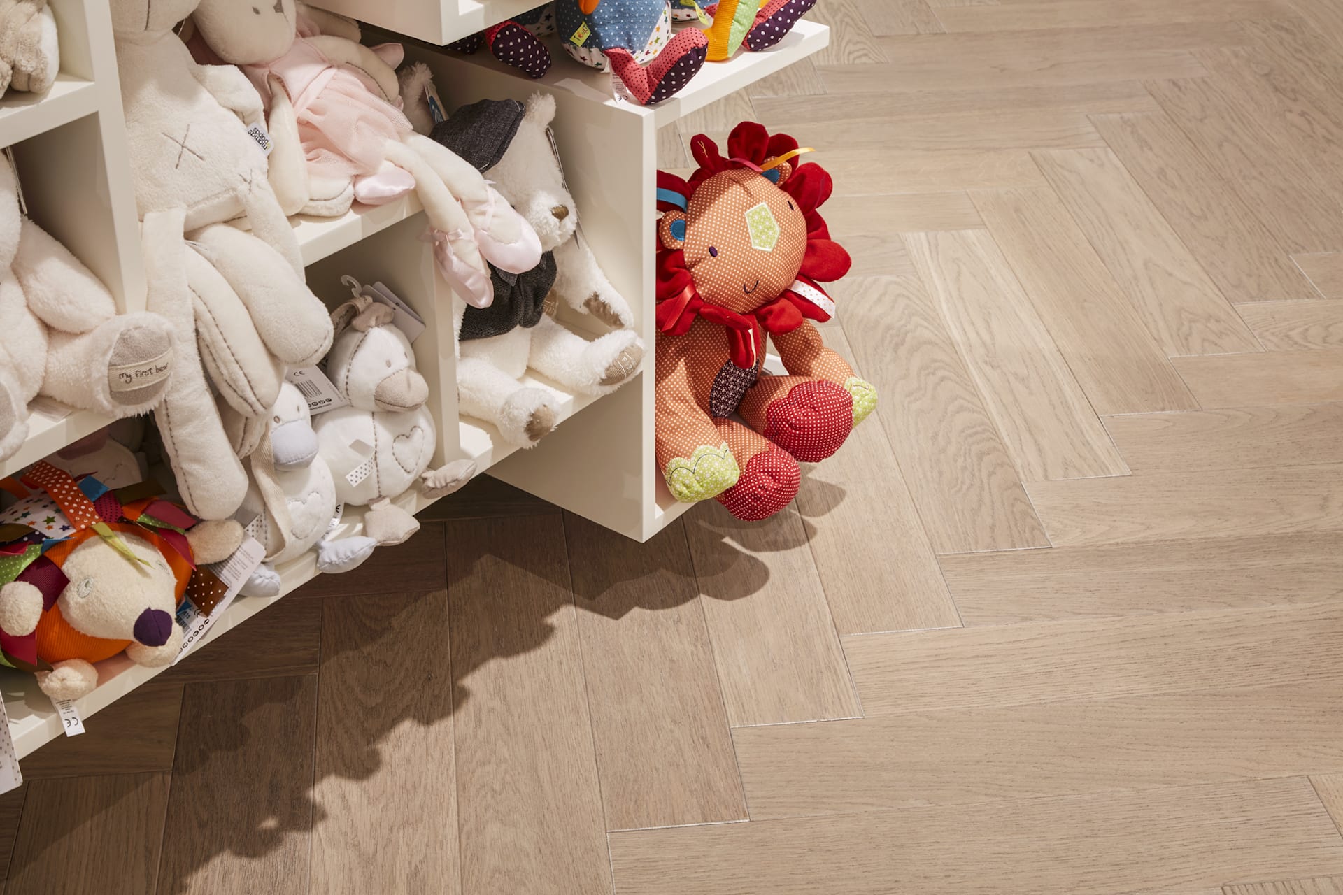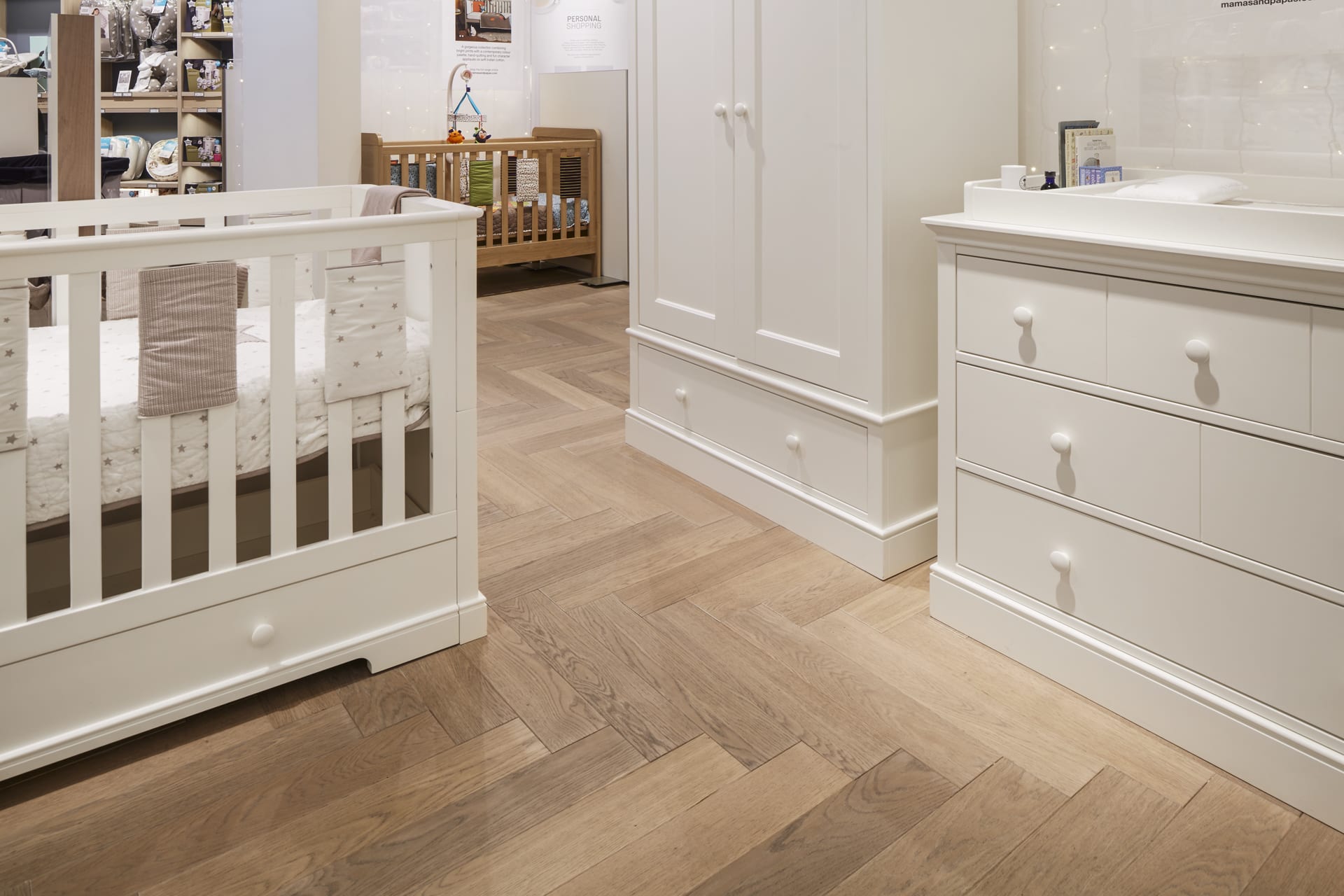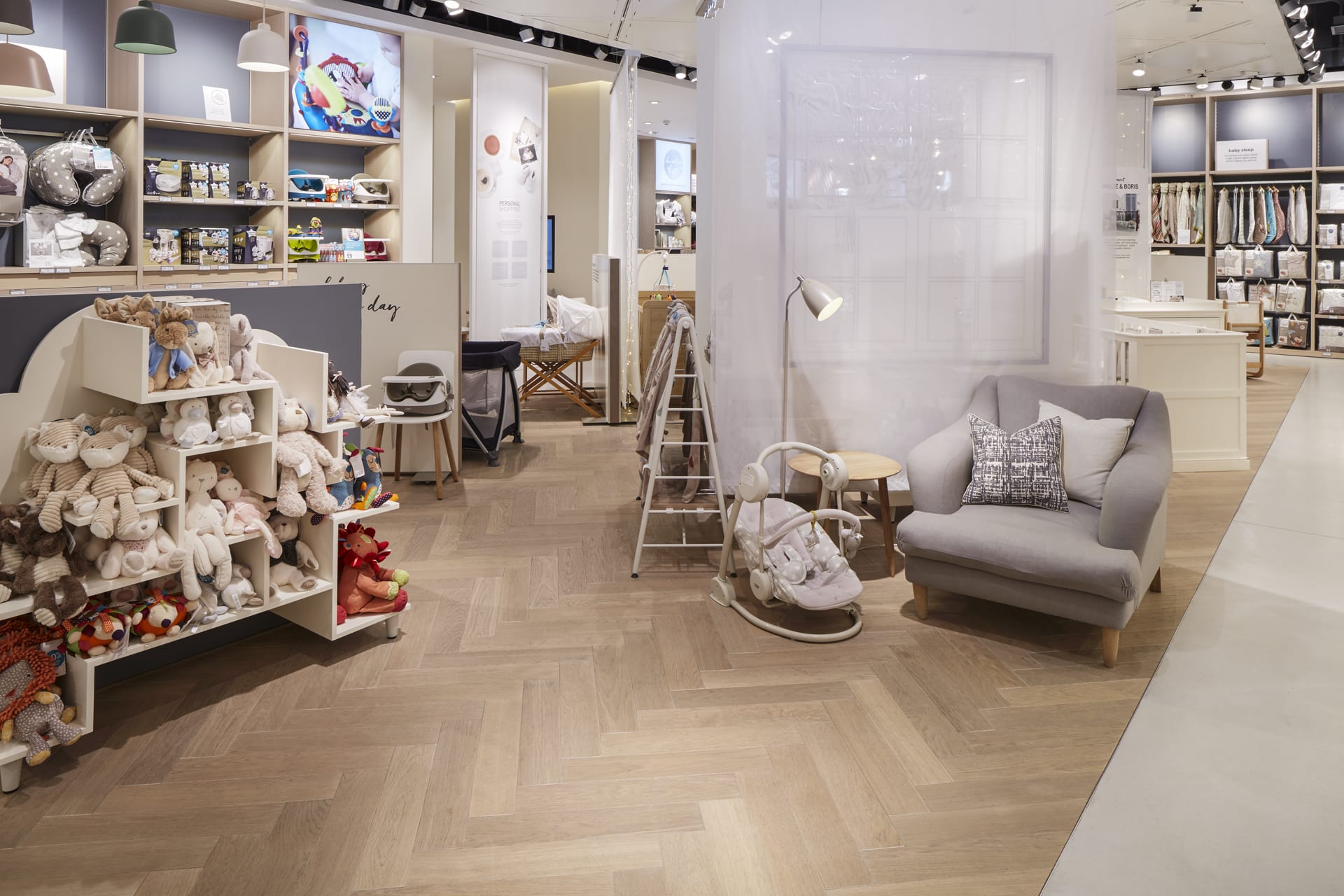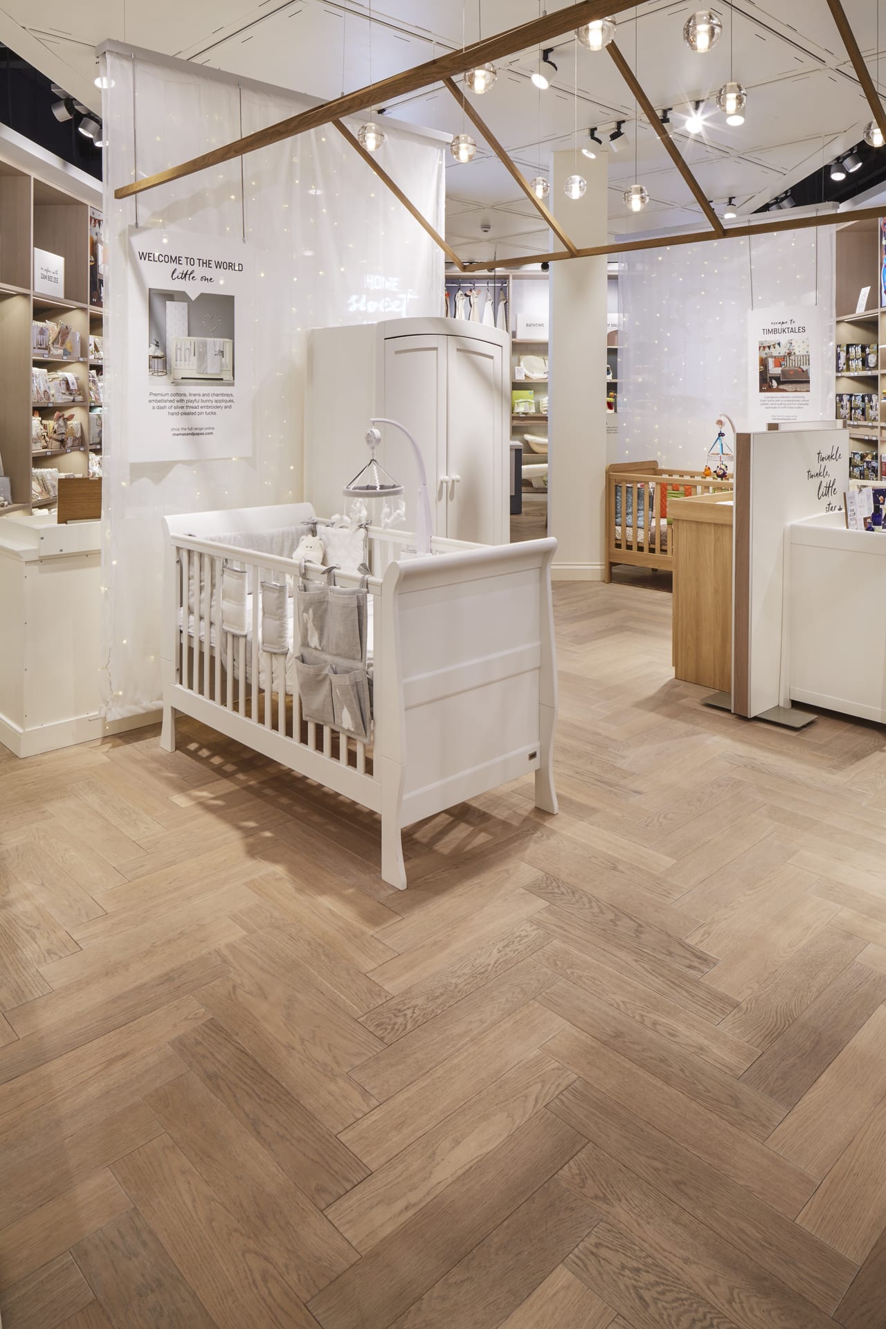 The company had a very clear idea of the type of wood floor they wanted for the focus areas and sent a photograph for us to match to. Fendi herringbone was chosen for this category A store in the Westfield Shopping Centre, with a special order Par-ky veneer as an alternative for category B stores.
