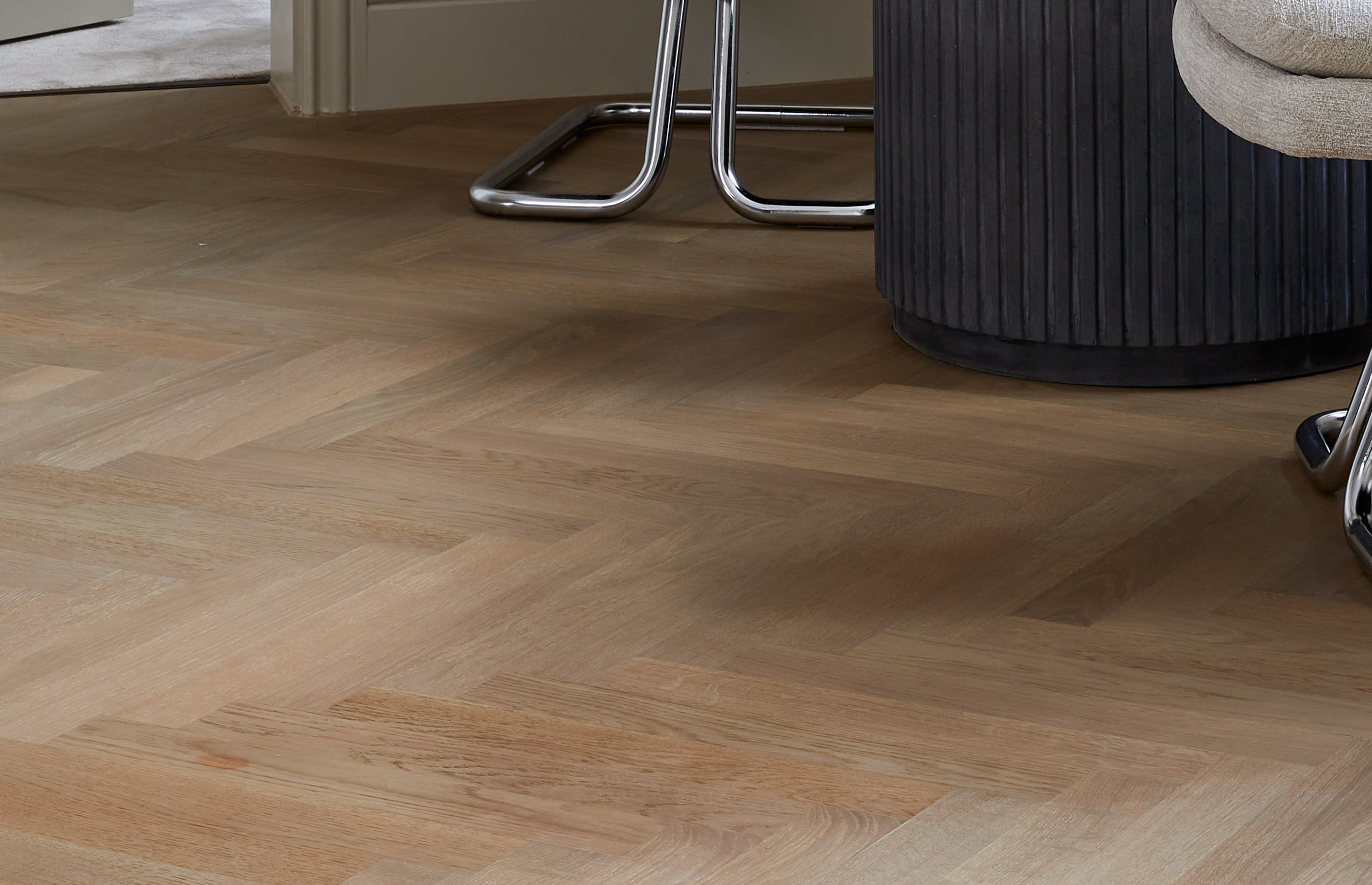 A traditional meets contemporary style, Havwoods’ Ferro Select 70mm herringbone was chosen for the hallway, kitchen, utility room, landing and home office – allowing for a cohesive final look that blends seamlessly from one floor to the next.
