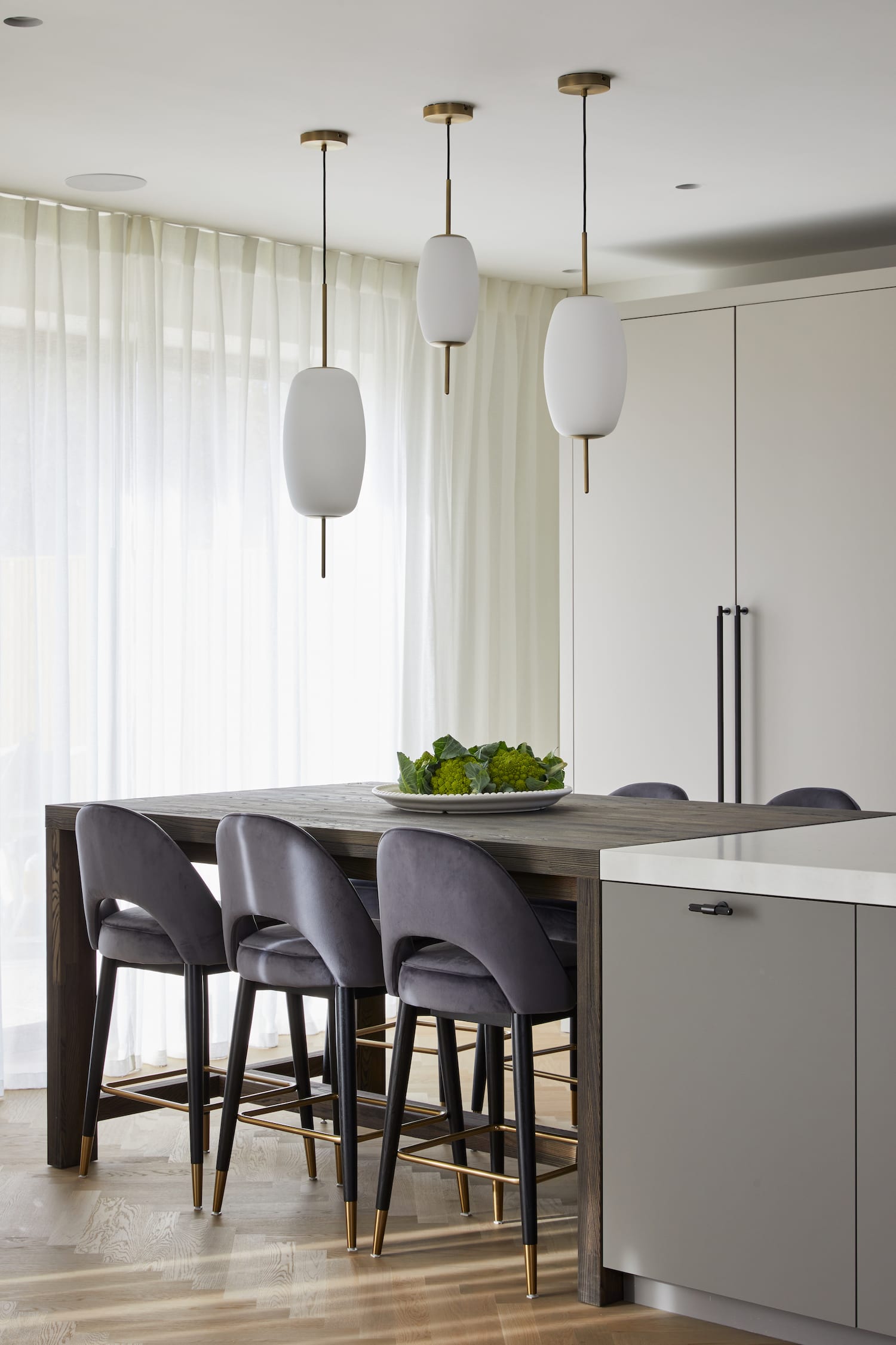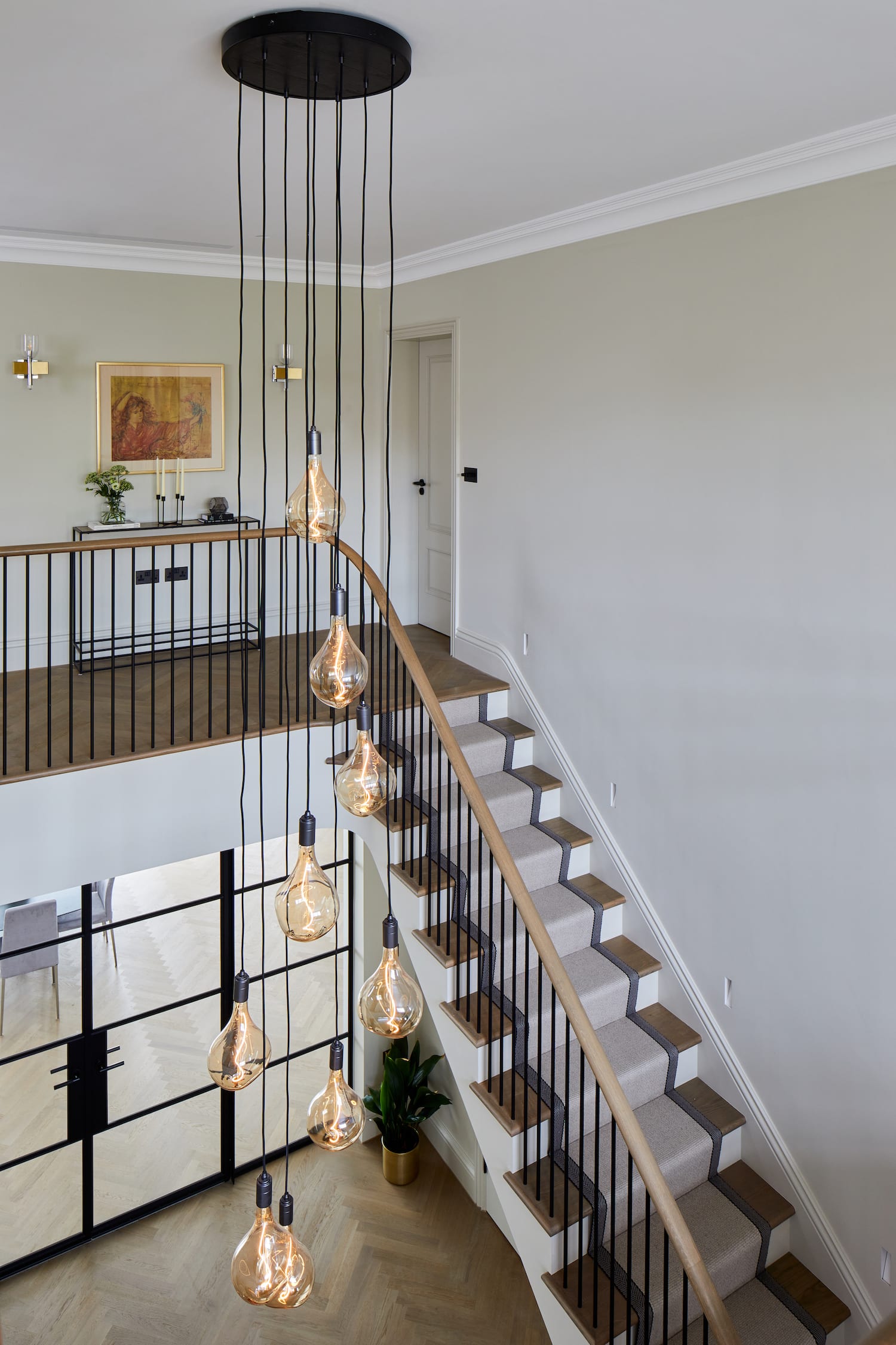 Both functional and aesthetically striking, the planks inject character into the home. The warm undertones of the planks sit beautifully against the minimalistic nature of the interiors, complemented with brass and black detailing such as the stunning staircase and pendant light in the hallway.