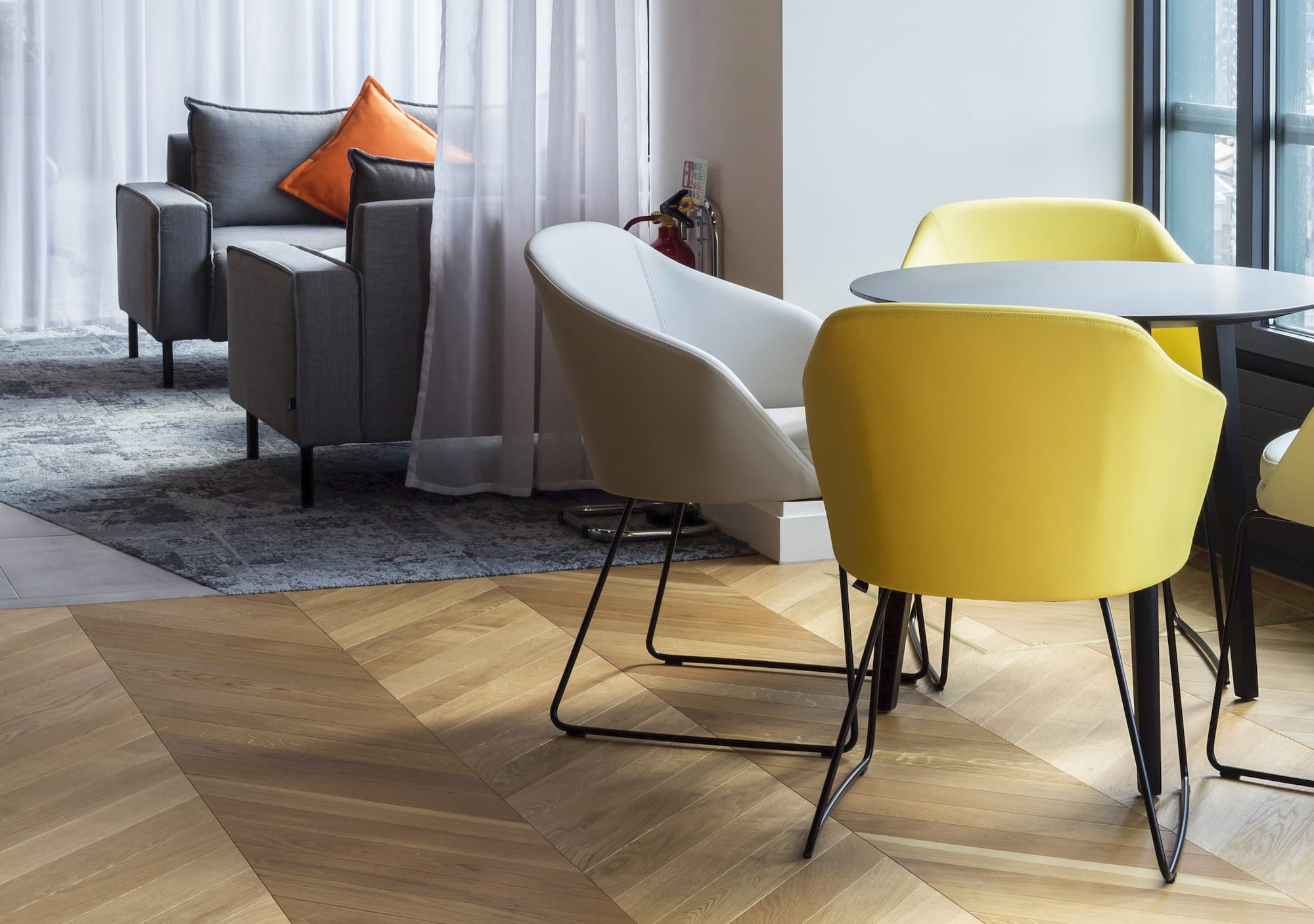 The design brief for this contemporary office was to create a more mature appeal with suspended ceiling rafts and acoustic slats that provide a feeling of openness. Havwoods provided its exceptionally crafted Neutro Chevron board for the large staff area, a narrow board that provides a thinner composition – creating a spacious flow across every area of the office. The décor is further complemented by planting and shelving throughout, ensuring a modern finish to this high tech office.