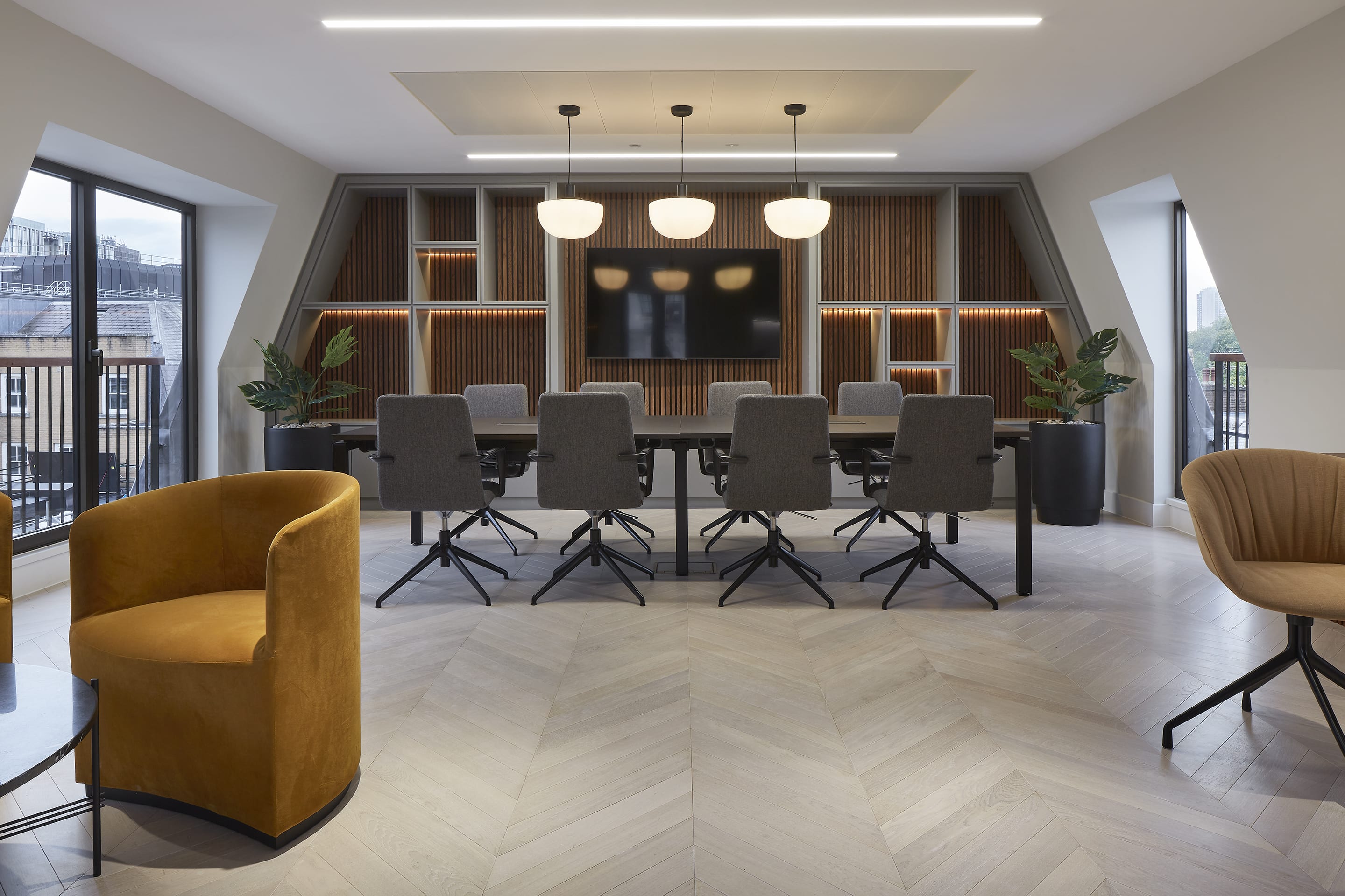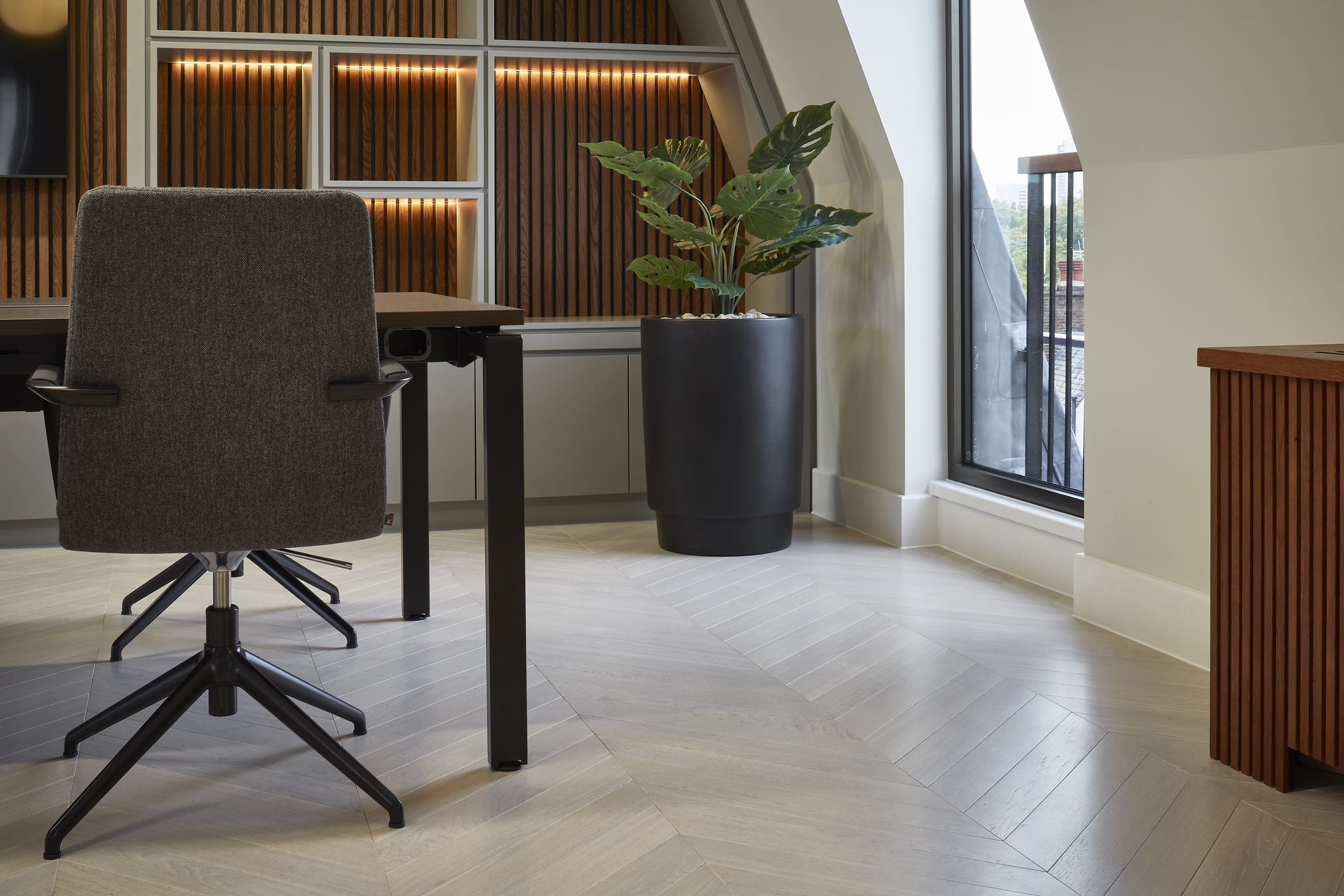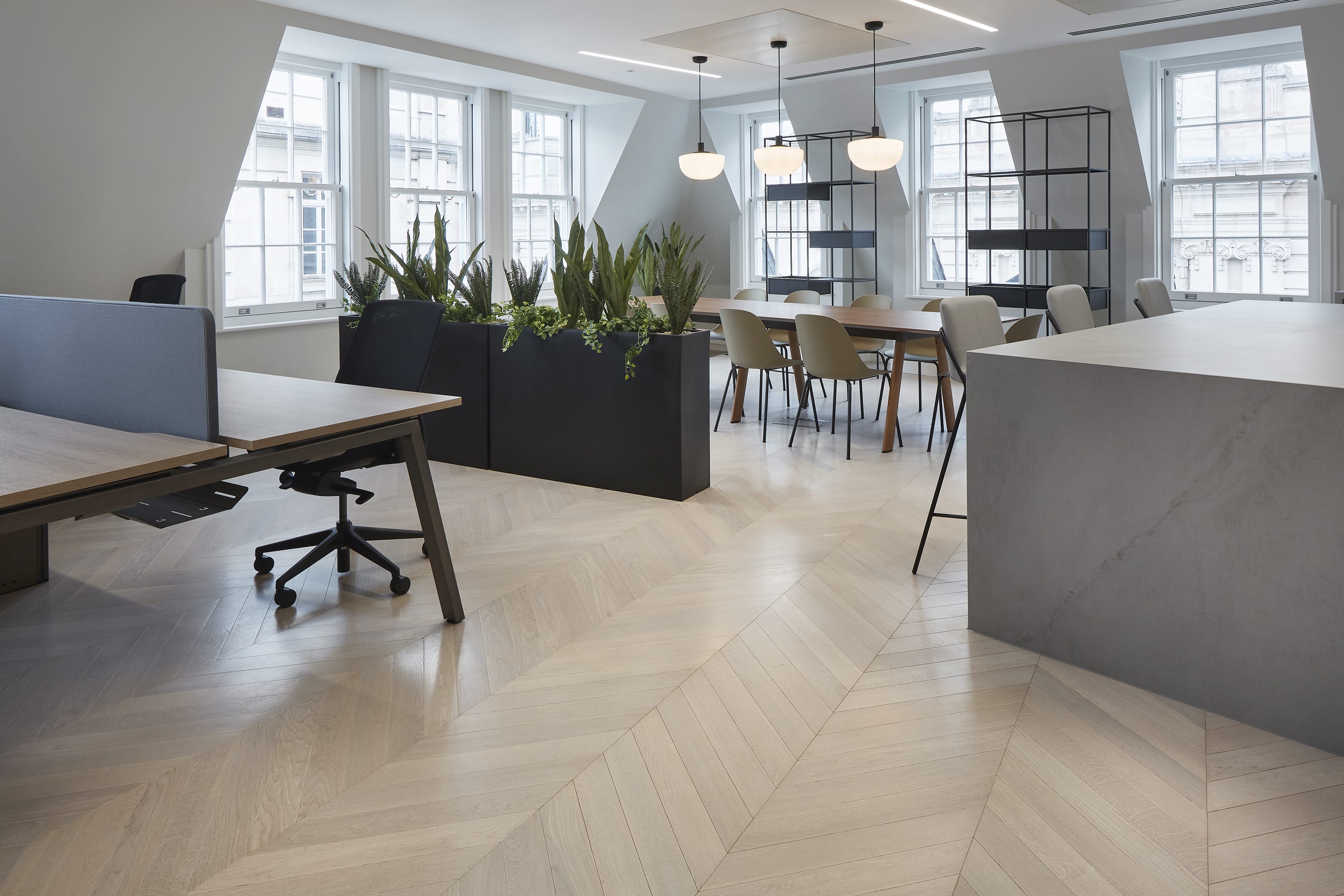Flowing beautifully throughout the main working area and meeting room, Havwoods’ Alabastro Chevron flooring has been used to create an open and spacious look and feel.