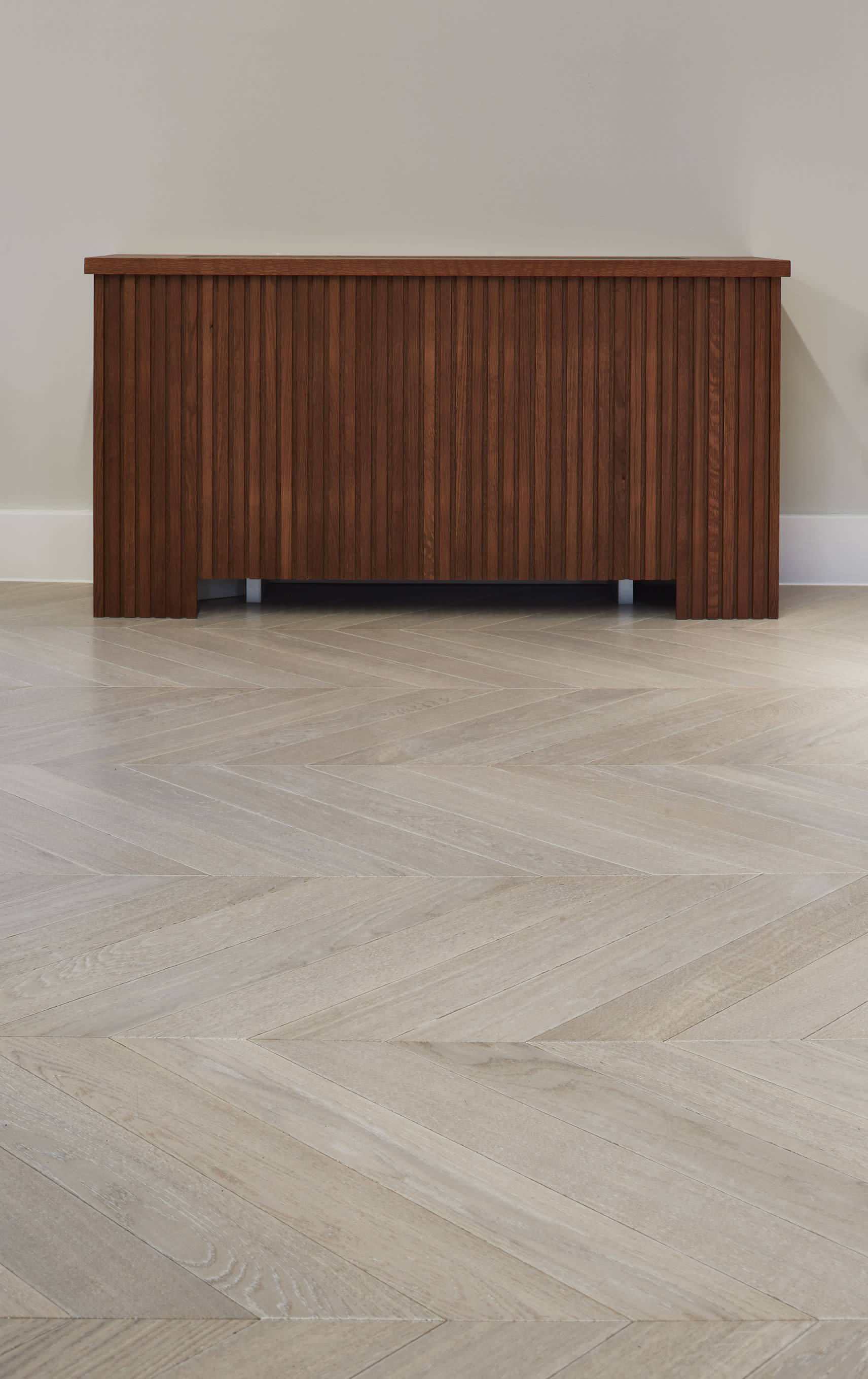 Softening the interior, the Alabastro chevron flooring sits particularly well against the dark and contemporary finishes – bringing balance and calm to the overall look.