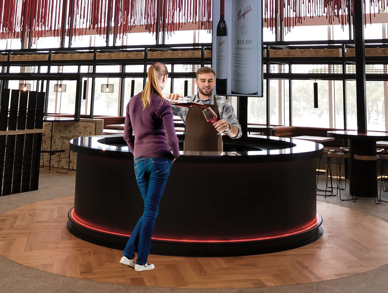 Designers Greater Group were presented with a brief to bring the Penfolds Magill Estate experience to Adelaide Airport. They answered the challenge through the design and incorporation of two distinct areas that are key to a Penfolds Estate experience, a Front Bar, and a Tasting Bar.