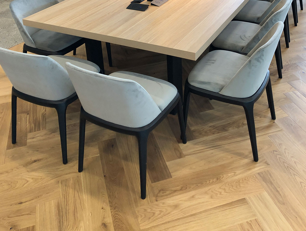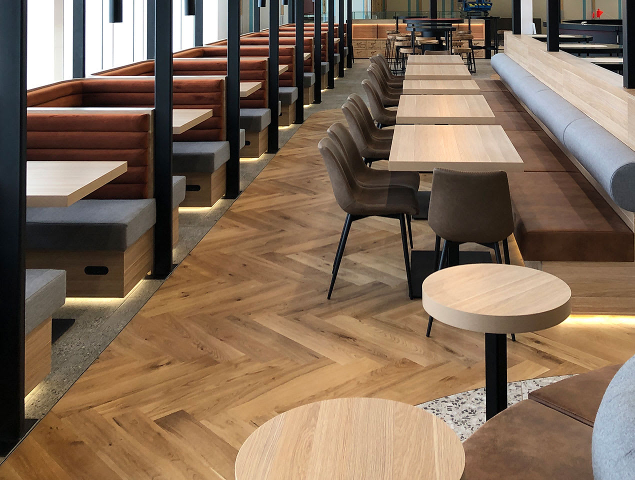Designers Polly Glaysher Pahg and Kristy Wilkinson of Greater Group, selected Havwoods Aintree herringbone engineered timber flooring from the Design From Havwoods range, to ground the design and frame the space. Aintree herringbone was selected for its premium finish and hardwearing surface, as well as for it's good slip rating, all attributes that were required in a commercial, retail and hospitality setting.