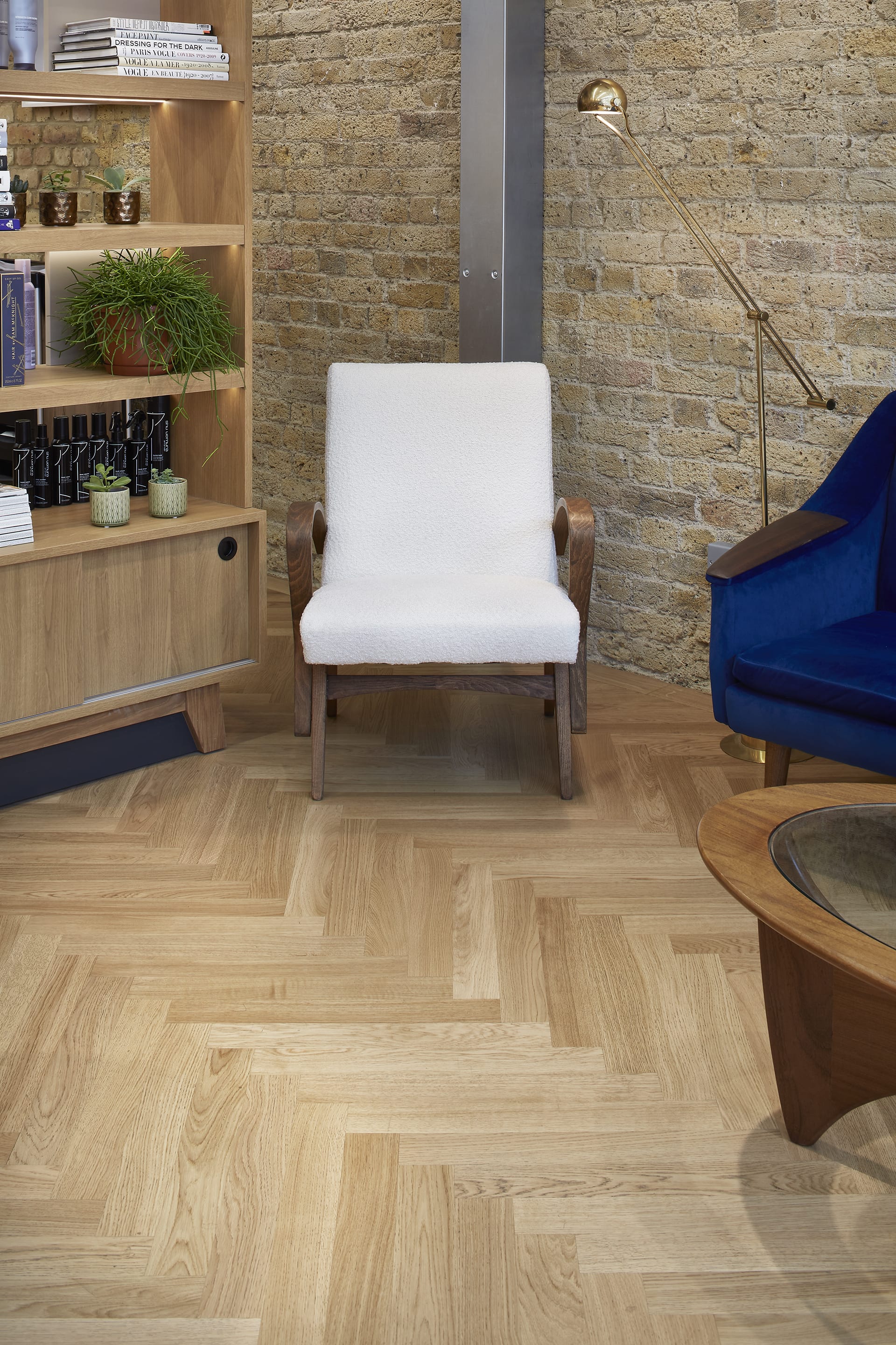 The on-trend Block pattern of the flooring is laid throughout, from the waiting area through to the studio. Adding depth and texture, the planks work seamlessly with the warm undertones of the other features including an exposed brick wall, wooden furniture and soft lighting. Creating a visually interesting look, the se carefully engineered planks pair beautifully with the retro themes and curved accents of the furniture.