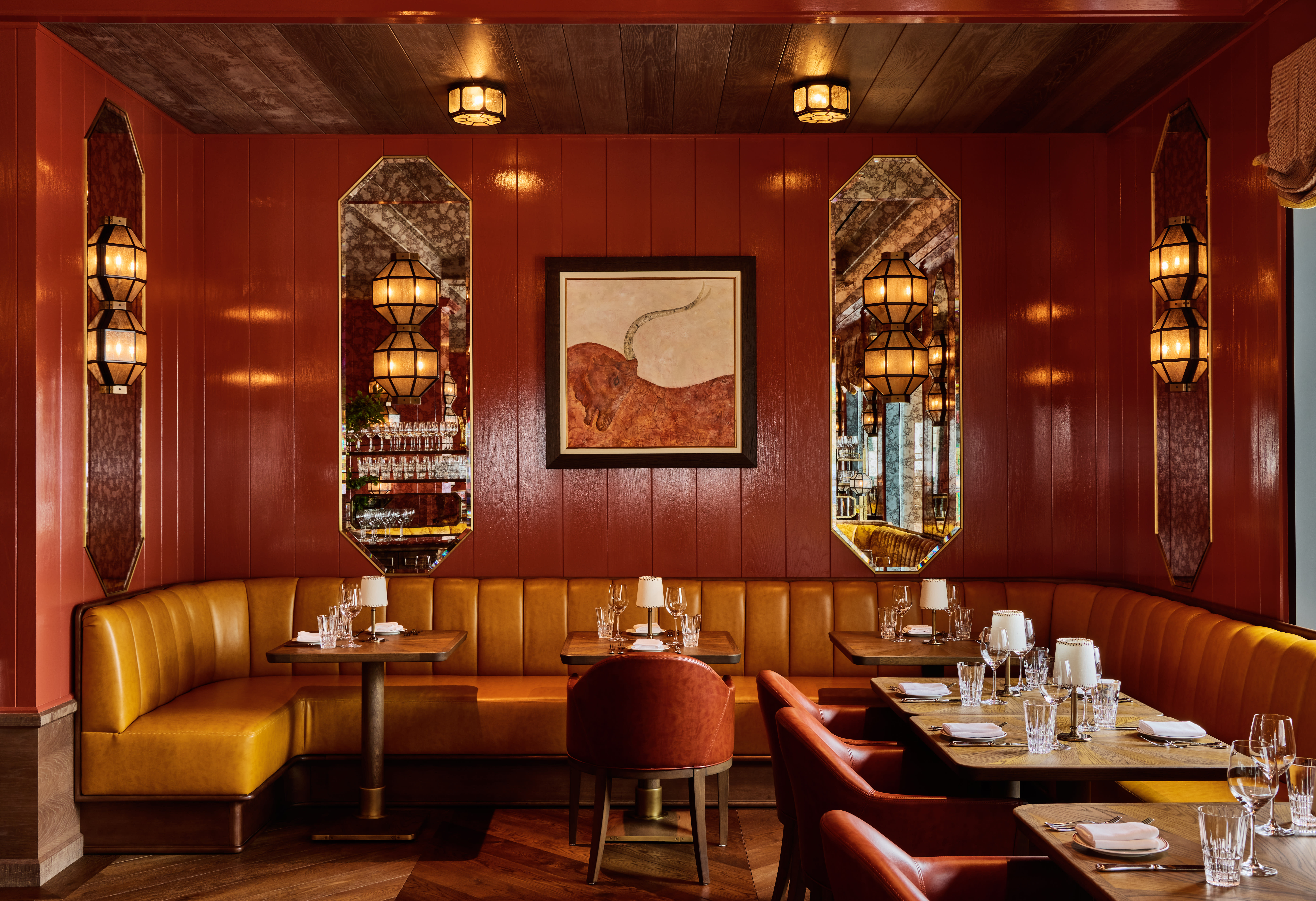 On the second floor a more glamorous aesthetic is introduced with leather upholstered banquettes in canary yellow are mixed with comfortable tub armchair seating.