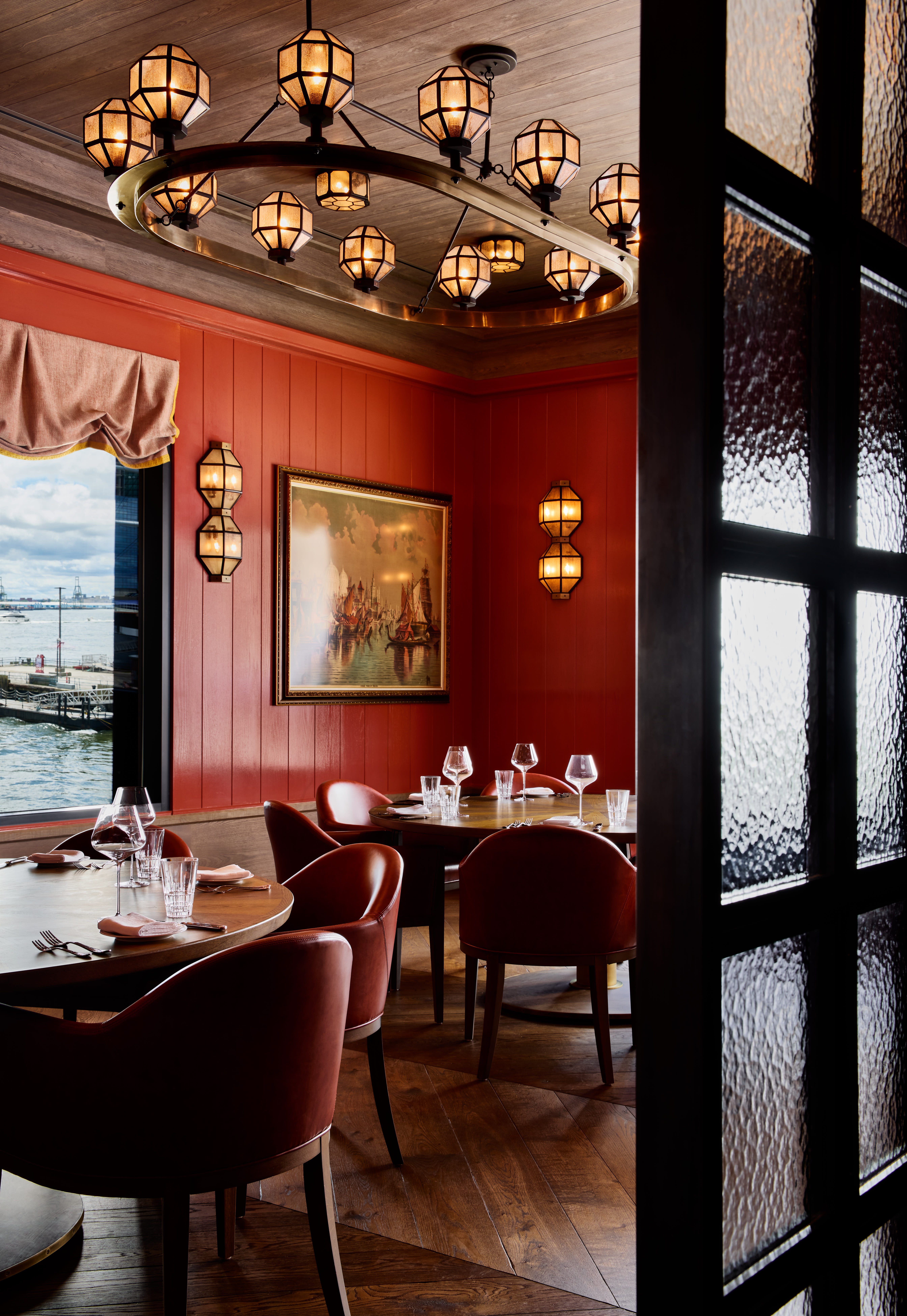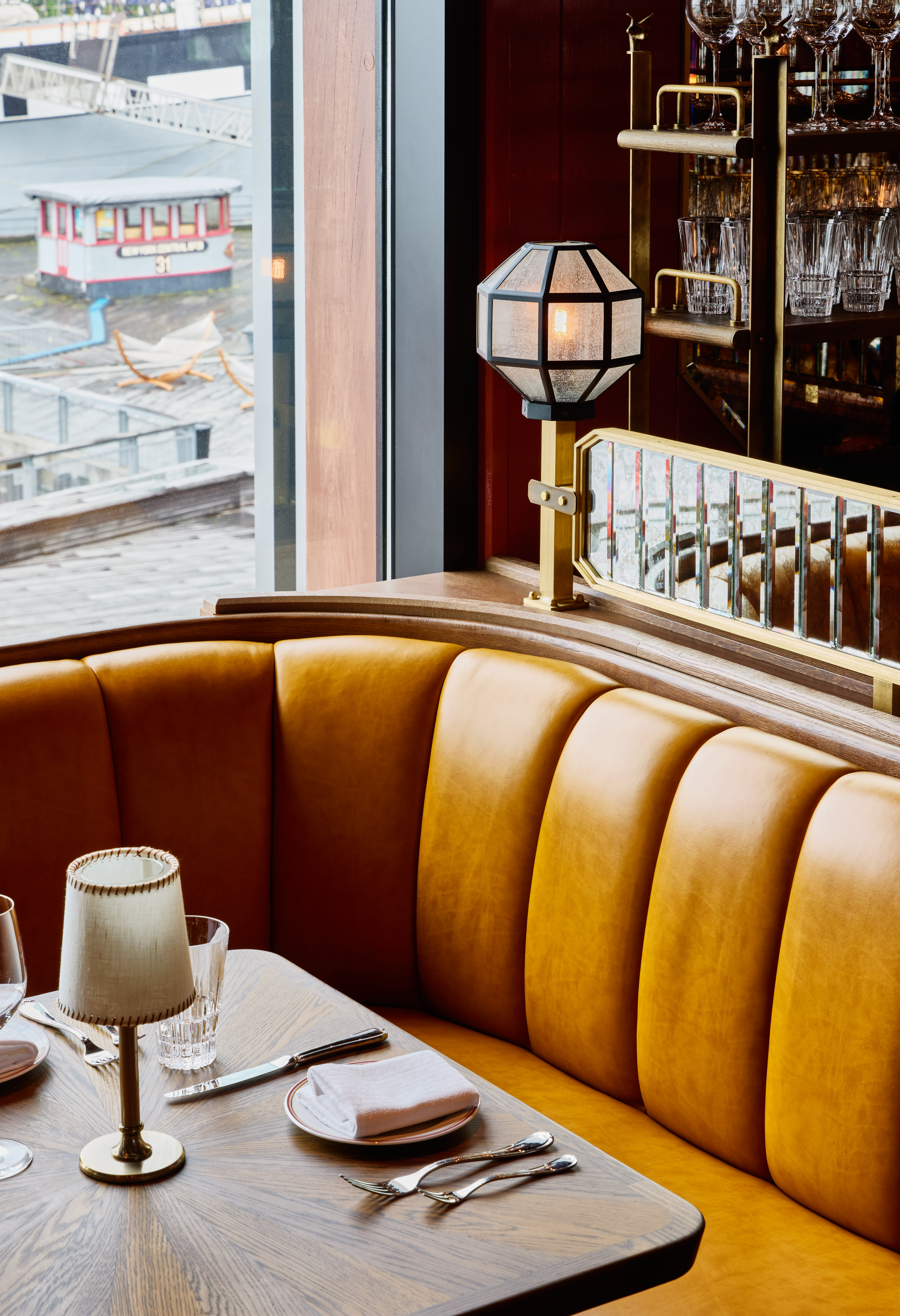 Serving steak, seafood and detailed with a custom version of Hartland from the Henley Collection, this two-story restaurant by Martin Brudnizki Design Studio offers striking views of the Manhattan waterfront and the Brooklyn Bridge.