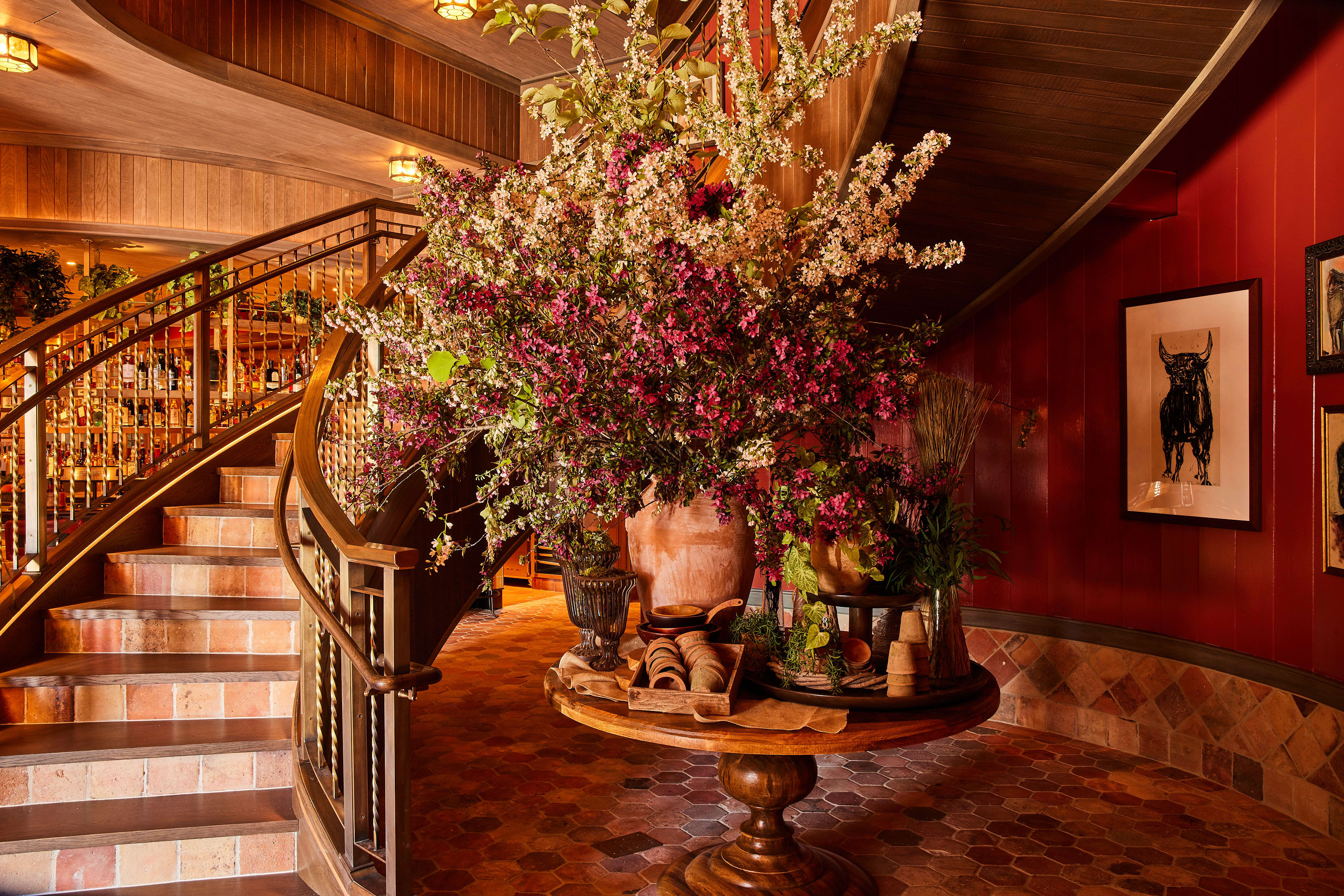 Guests are welcomed into a light-filled bar area before taking the grand, sweeping staircase up into the main dining room. Rustic terracotta floor tiles blend with a color palette of burnt orange and pale yellow whilst Venetian-inspired mirrors are accented by lantern-style lighting and large, overhead industrial chandeliers.