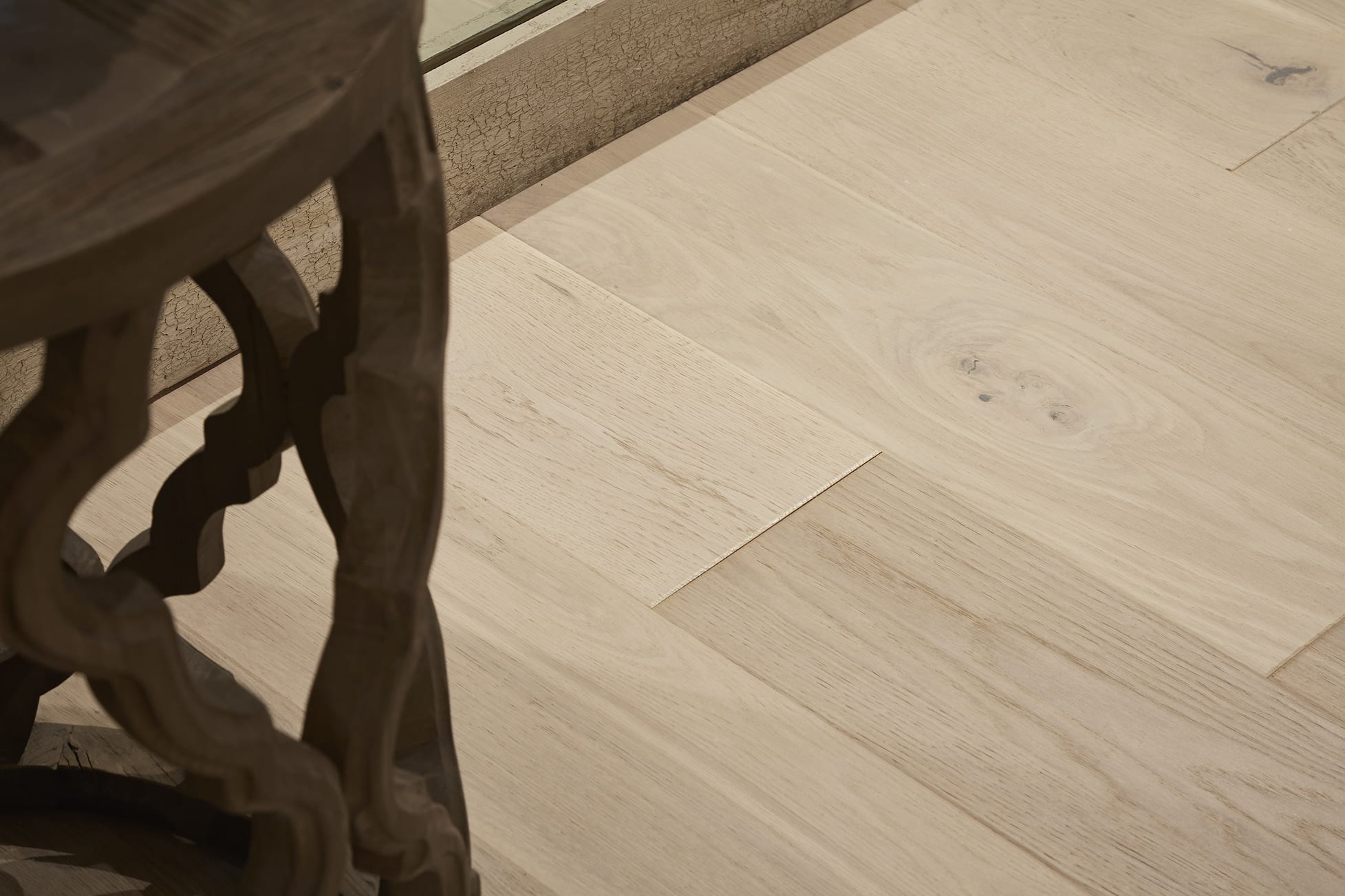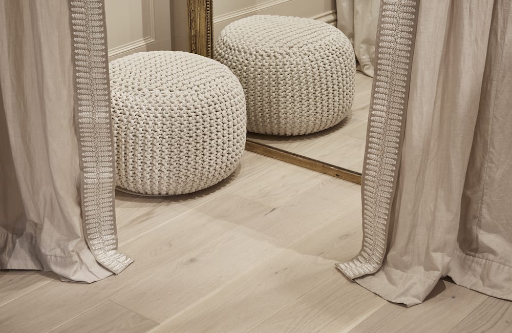 Opting for a lighter wood allows the dresses to be the main focal point, ensuring they are not overpowered. The matt lacquered finish of the planks gives the space a soft and sophisticated feel, paired with characterful wallpaper, rustic furniture and neutral walls to complement and bring the entire design scheme together.