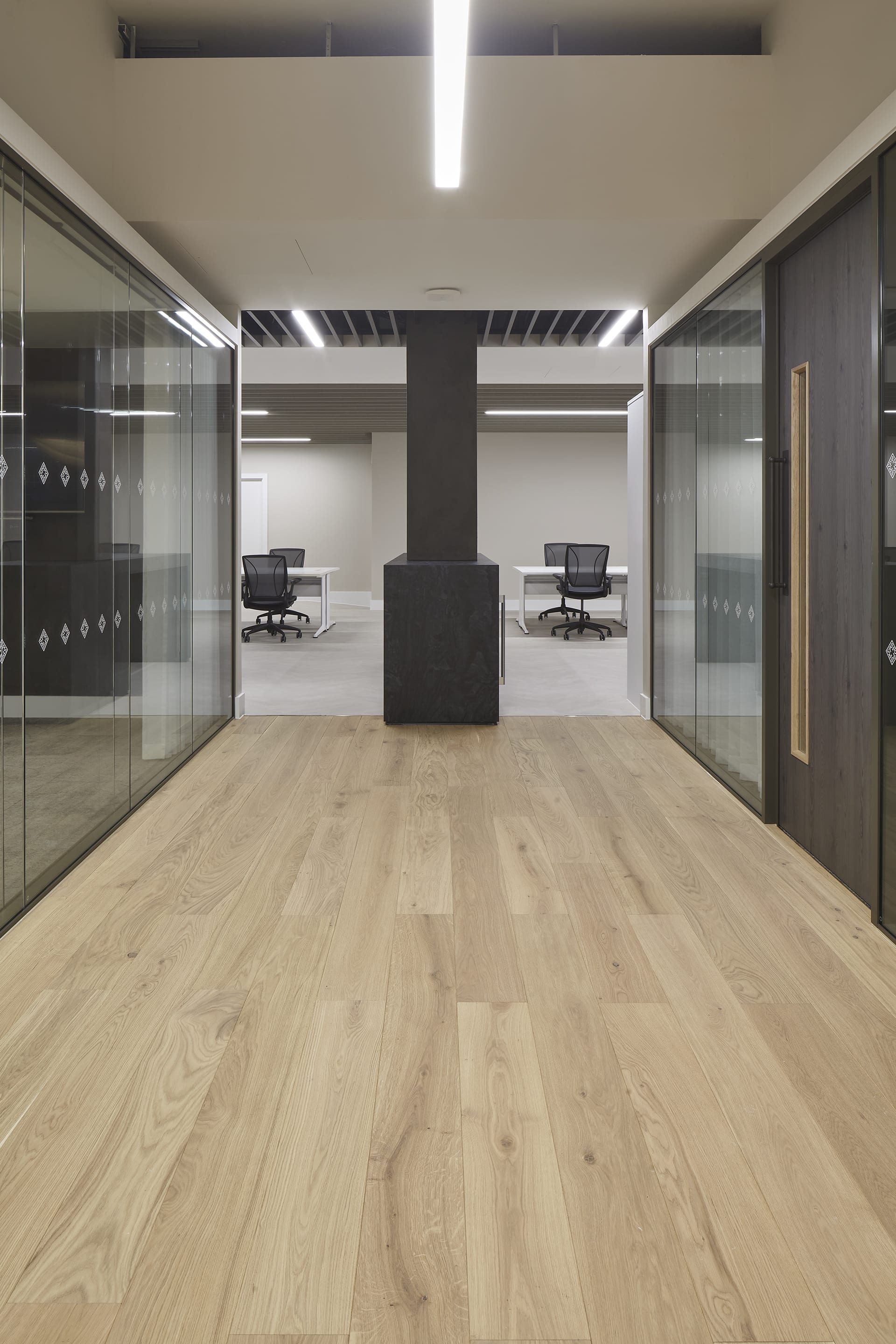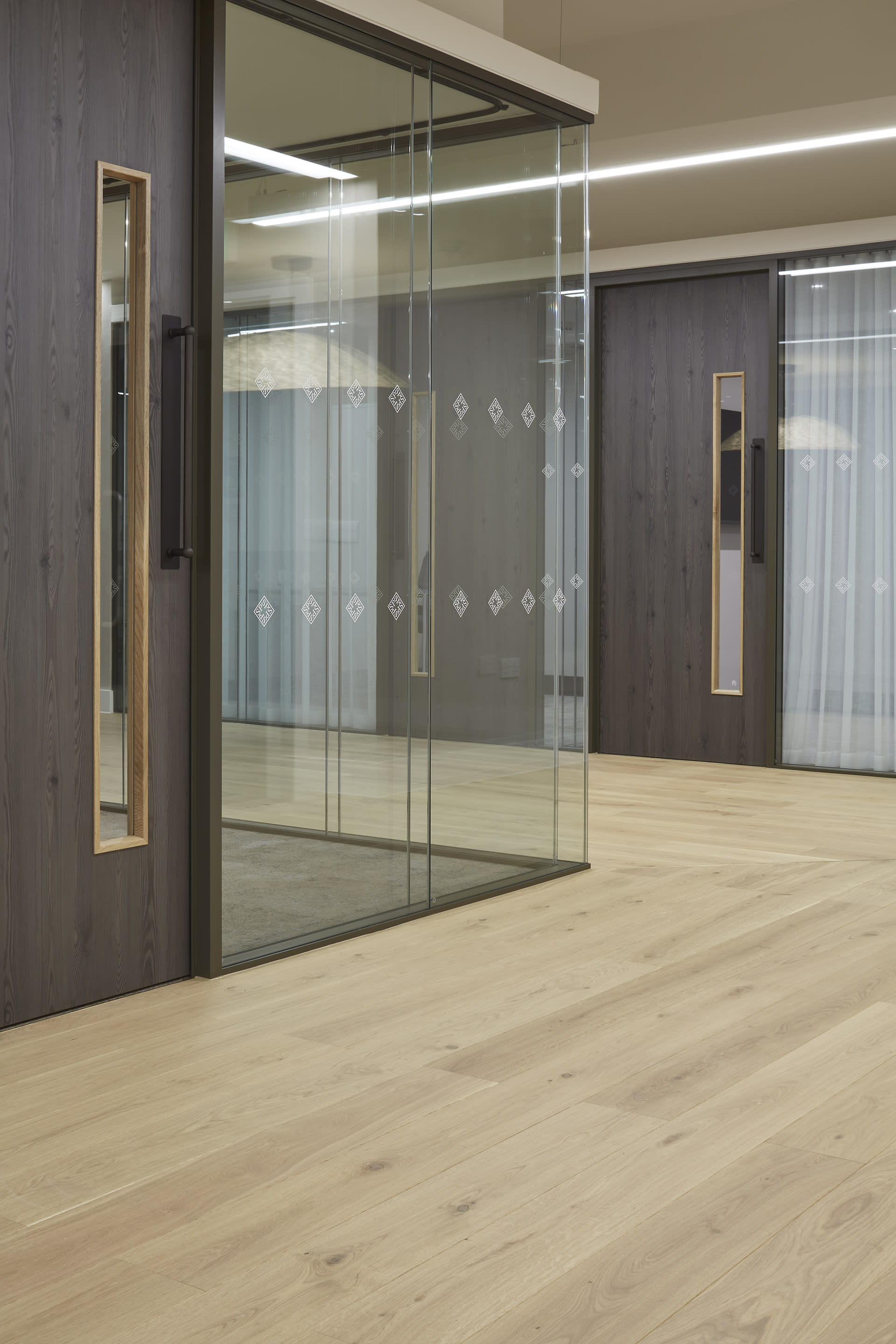 The Glass House project involved converting an empty office into four distinct zones, including a collaborative working area, two private director offices, a meeting space and a retail showroom. The design brief required each space to feel connected while serving specific purposes.