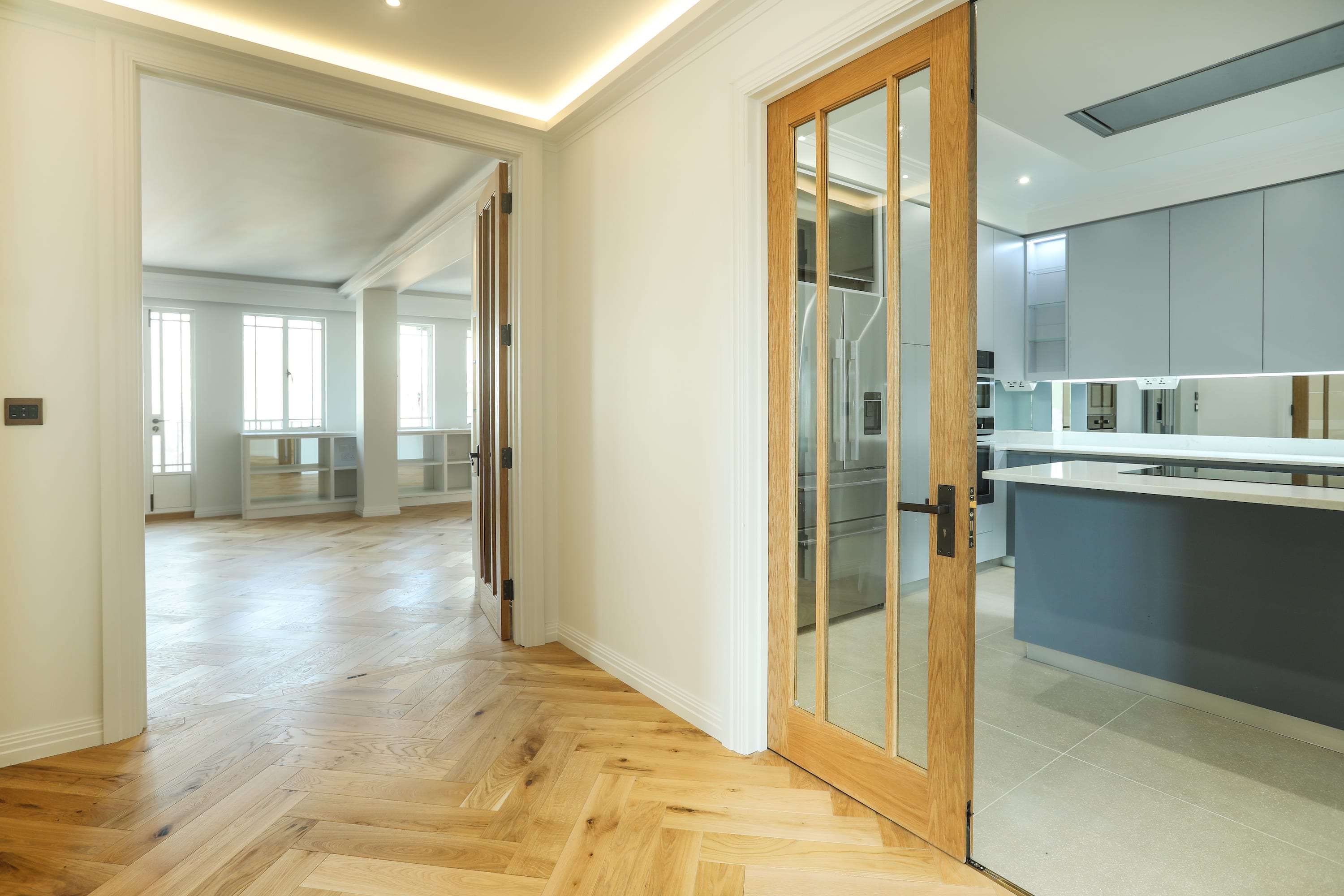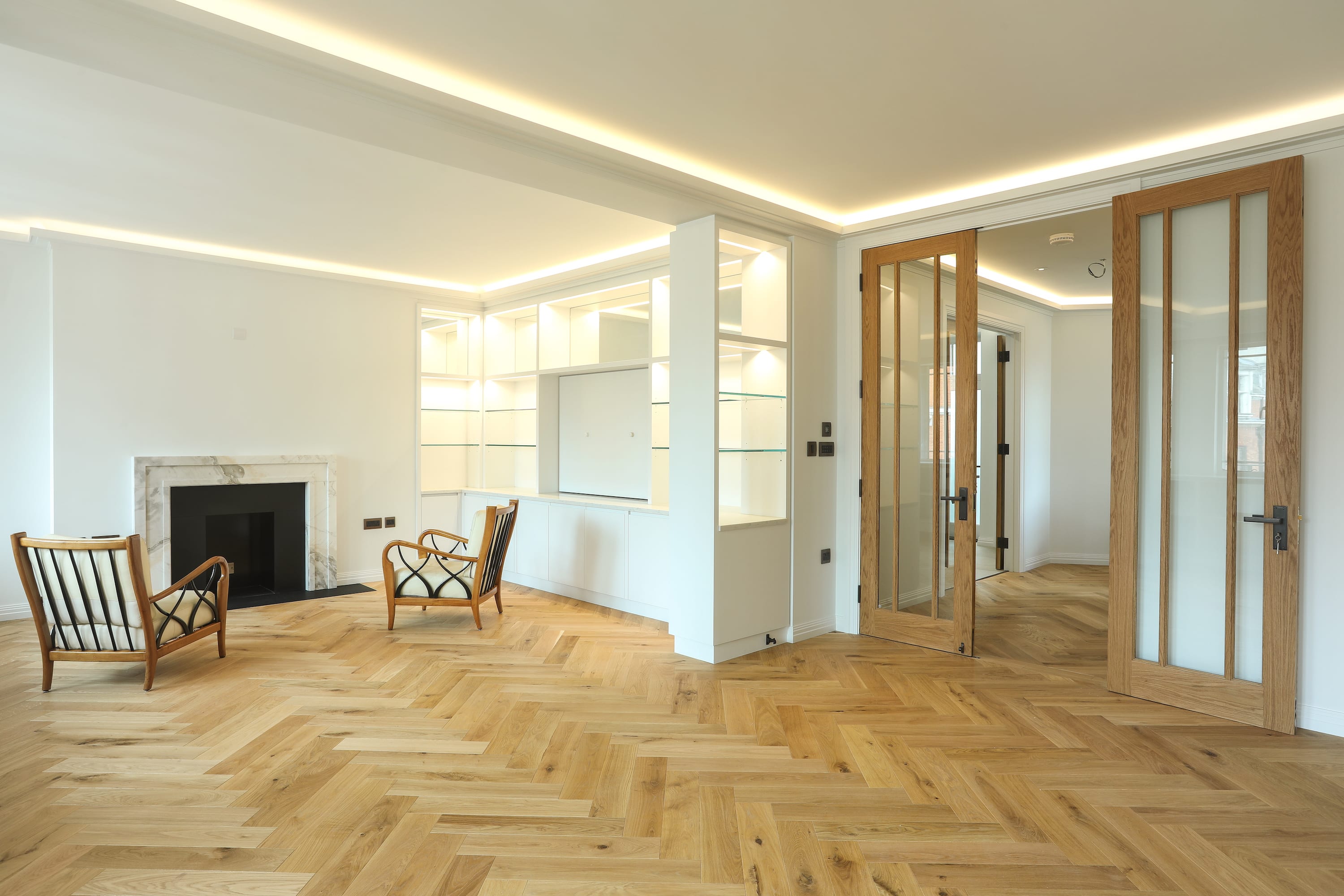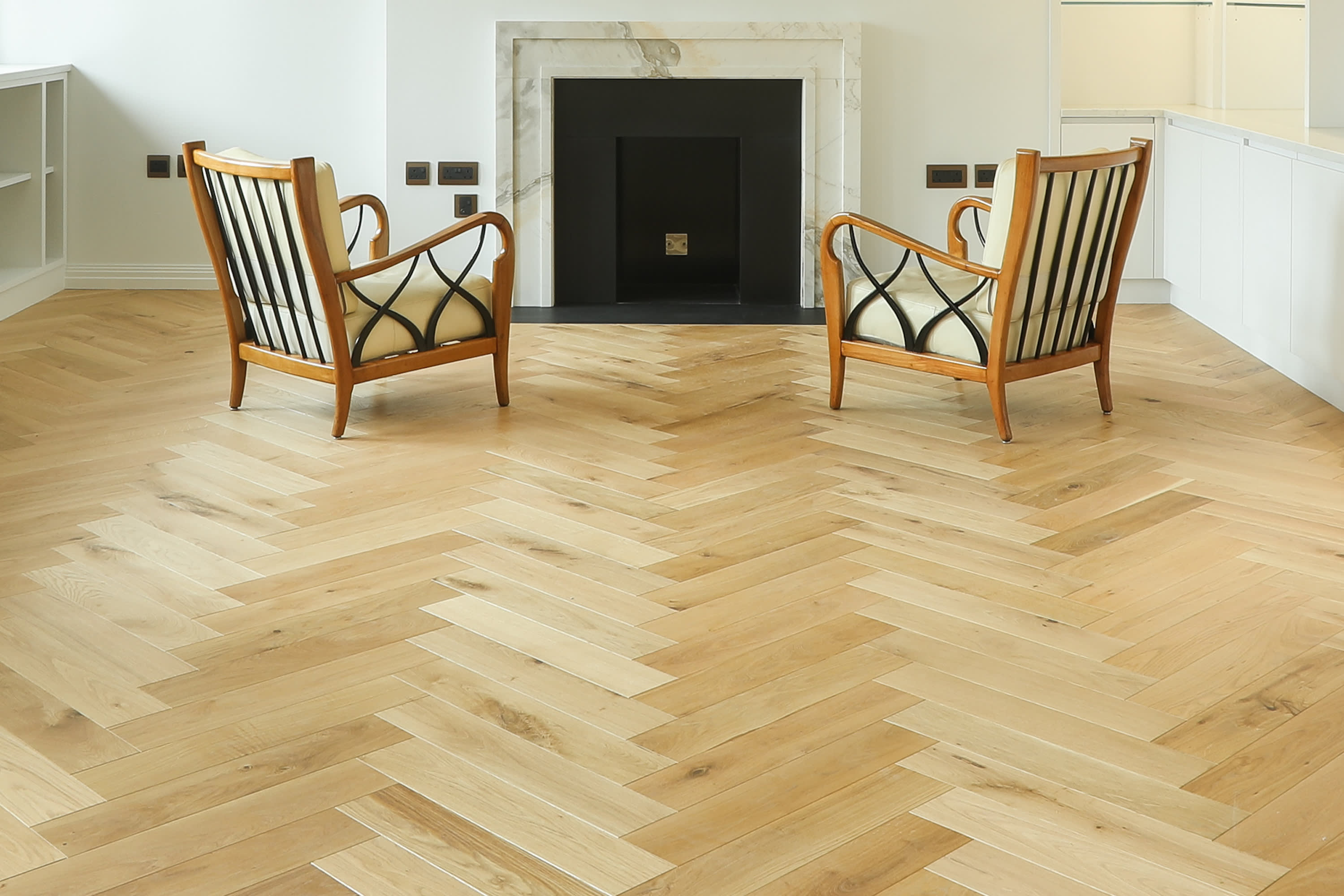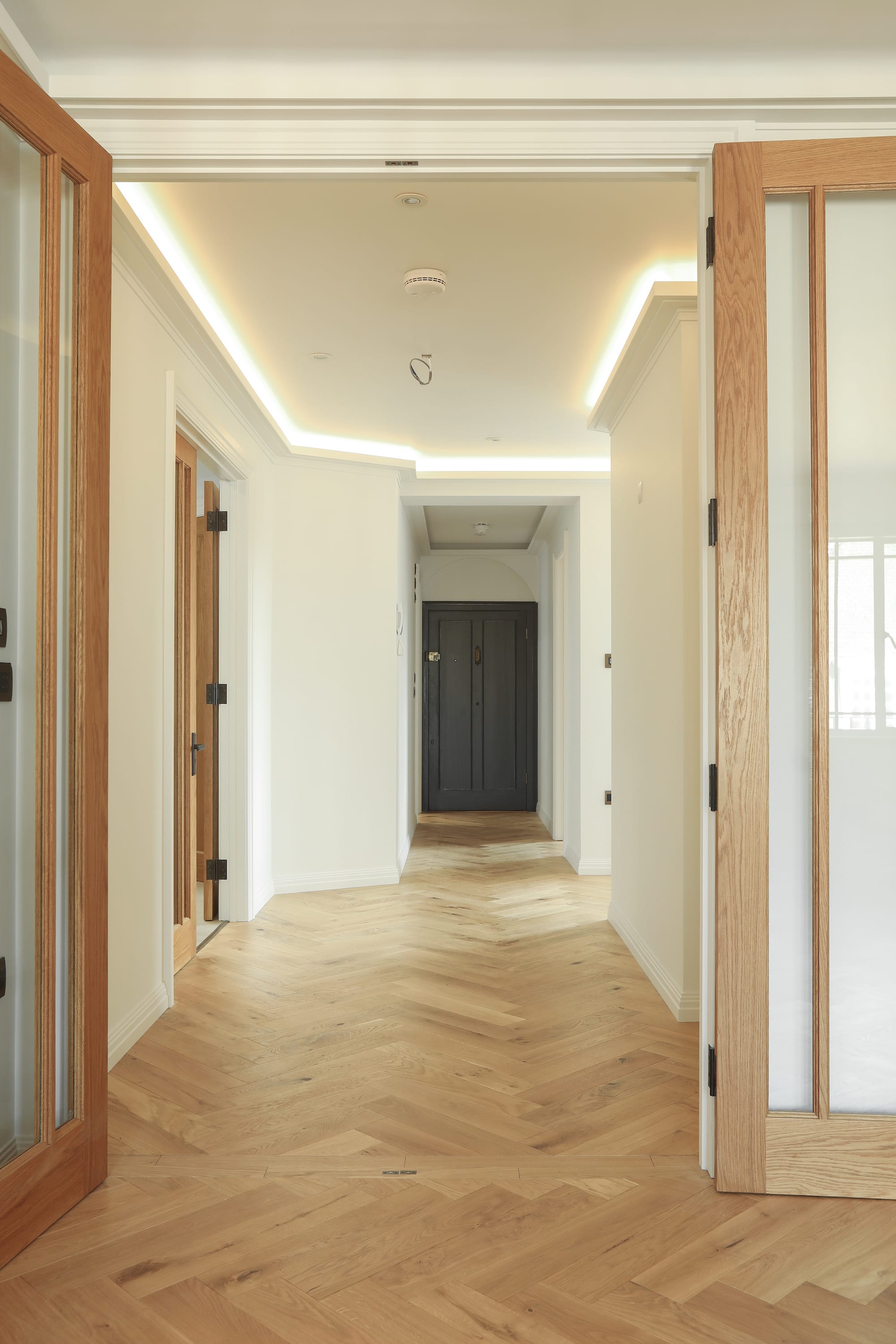The varied honey hues of the boards complement classic features, such as the statement marble fireplace in the centre of the living room, whilst also adding rustic detailing to the space. The result is an interior that will remain timeless and durable for years to come.