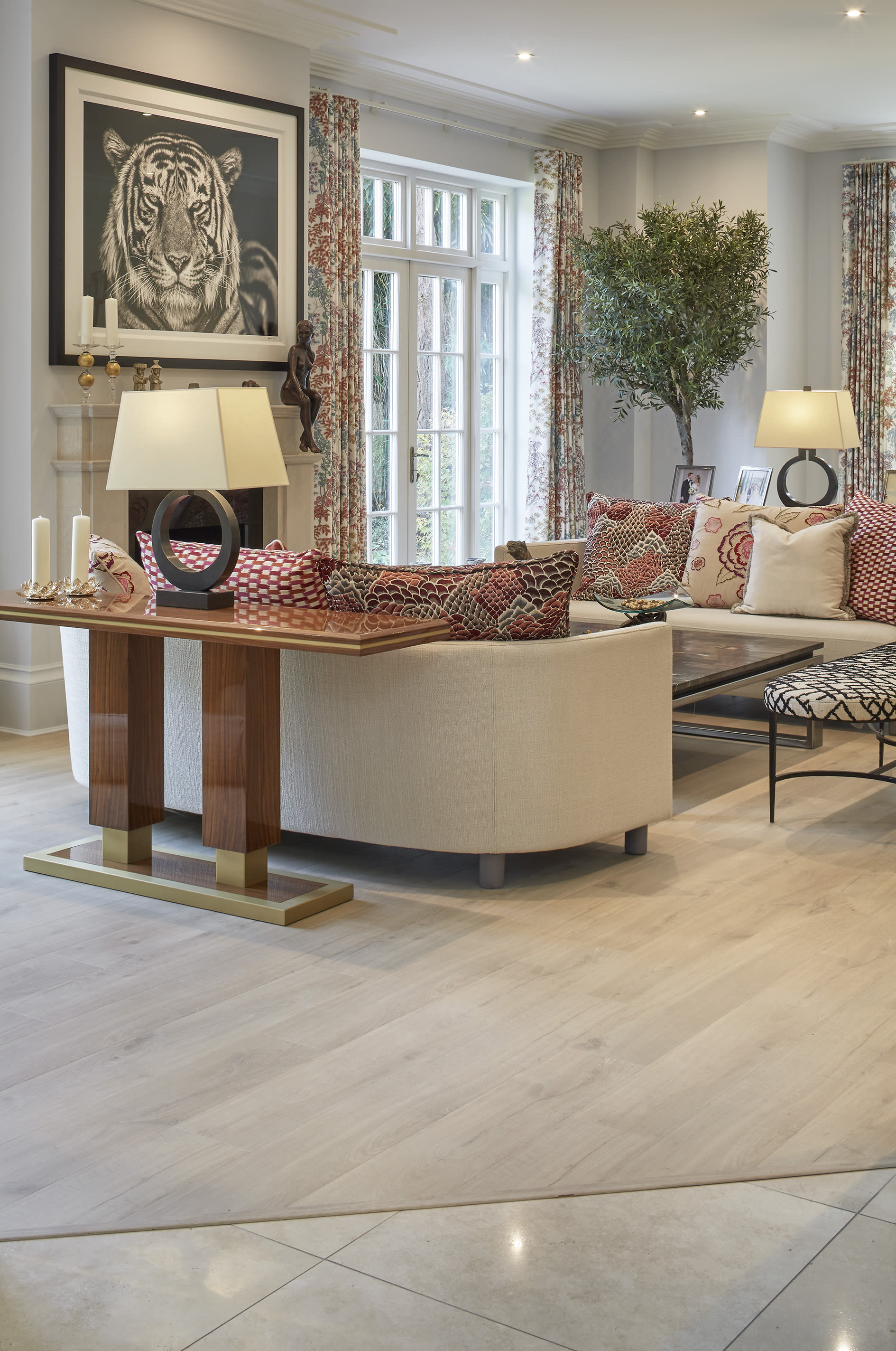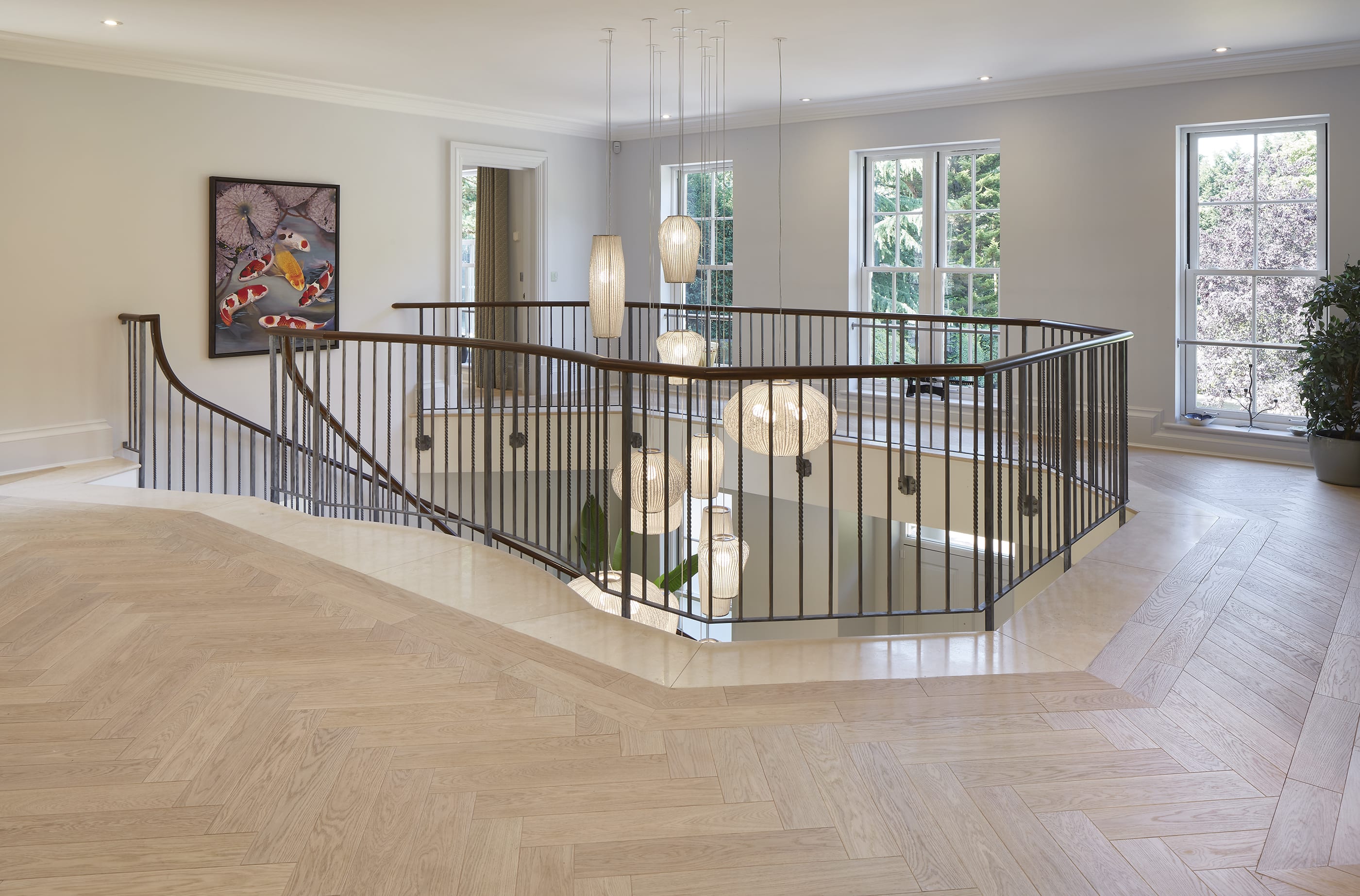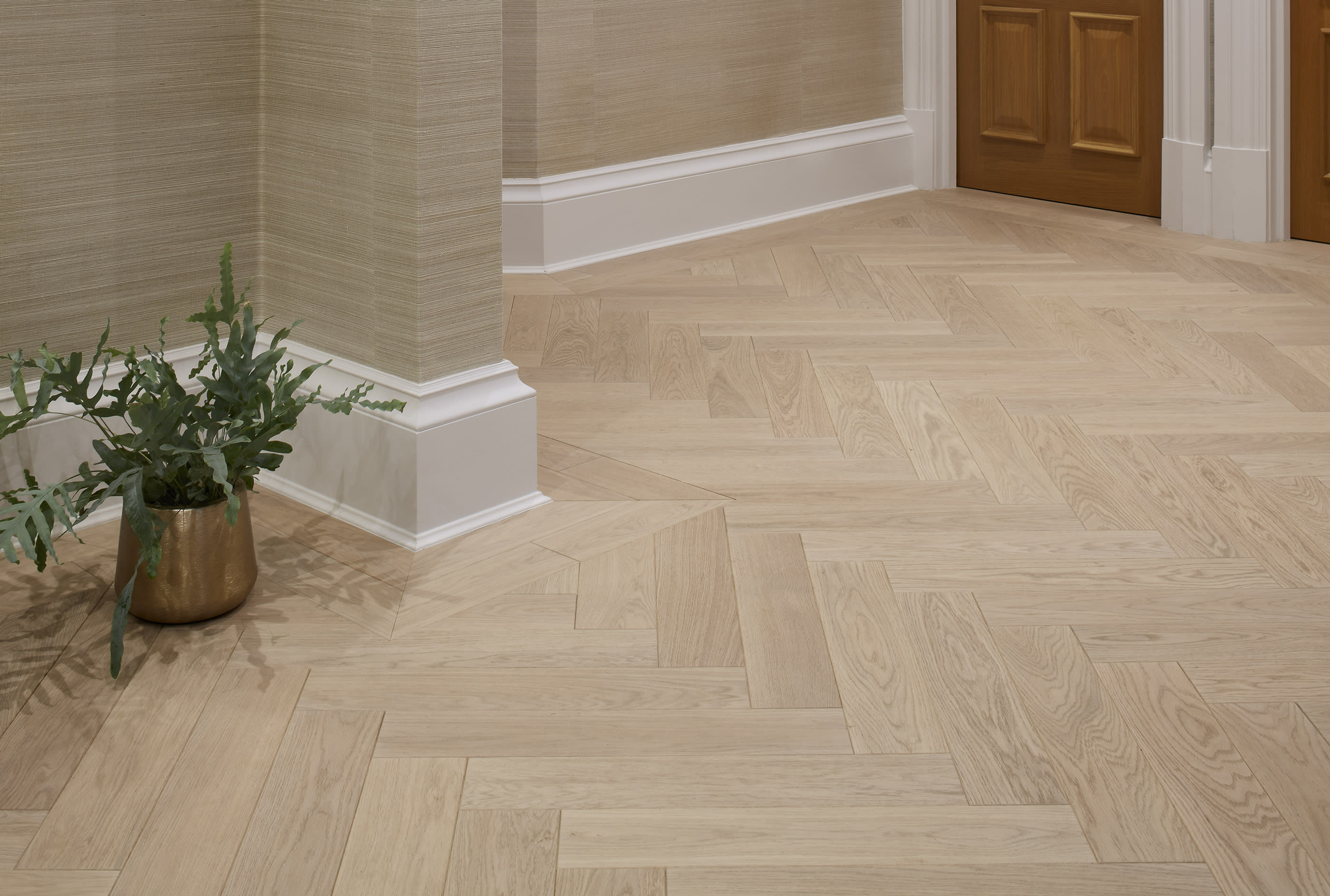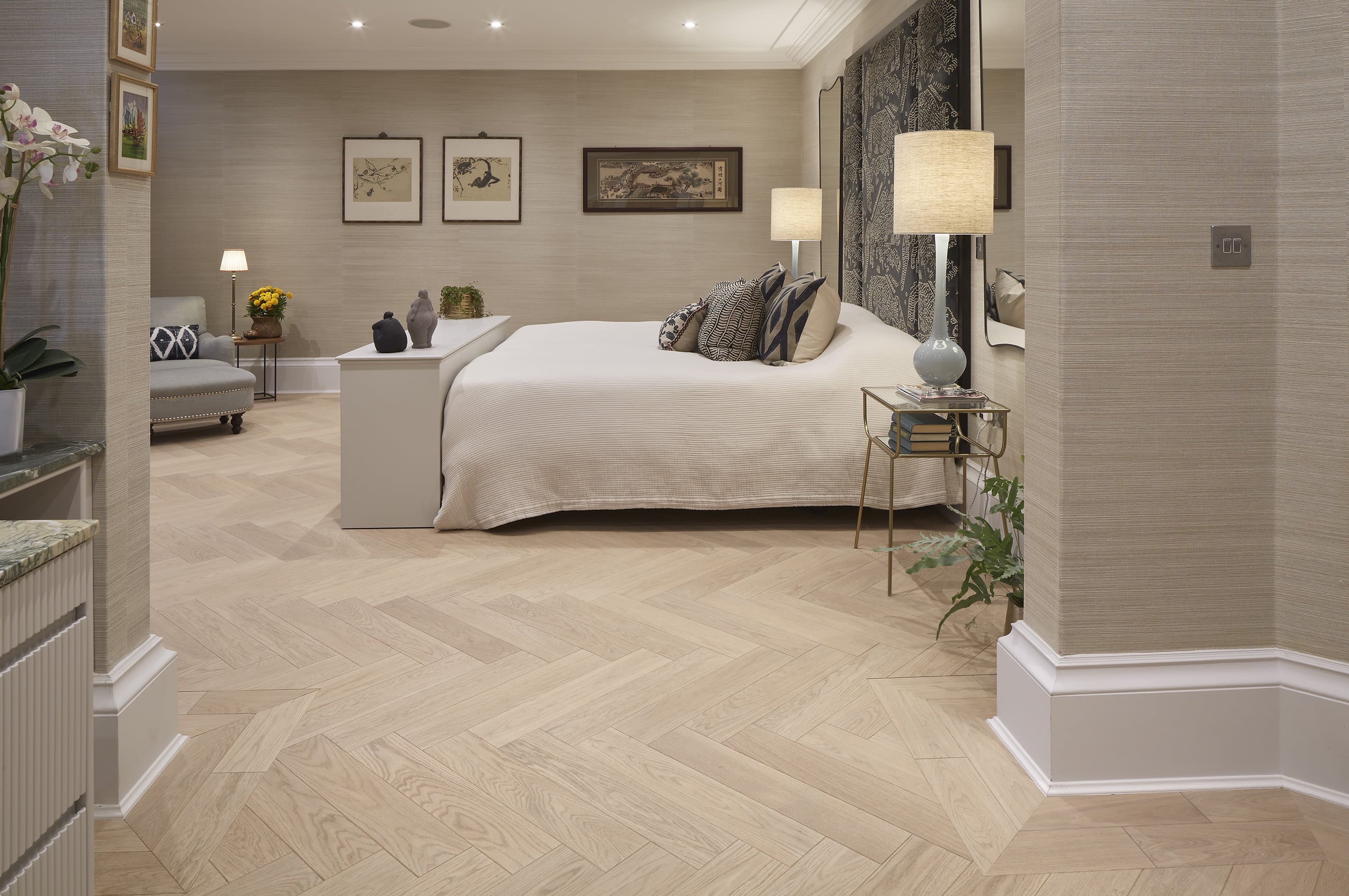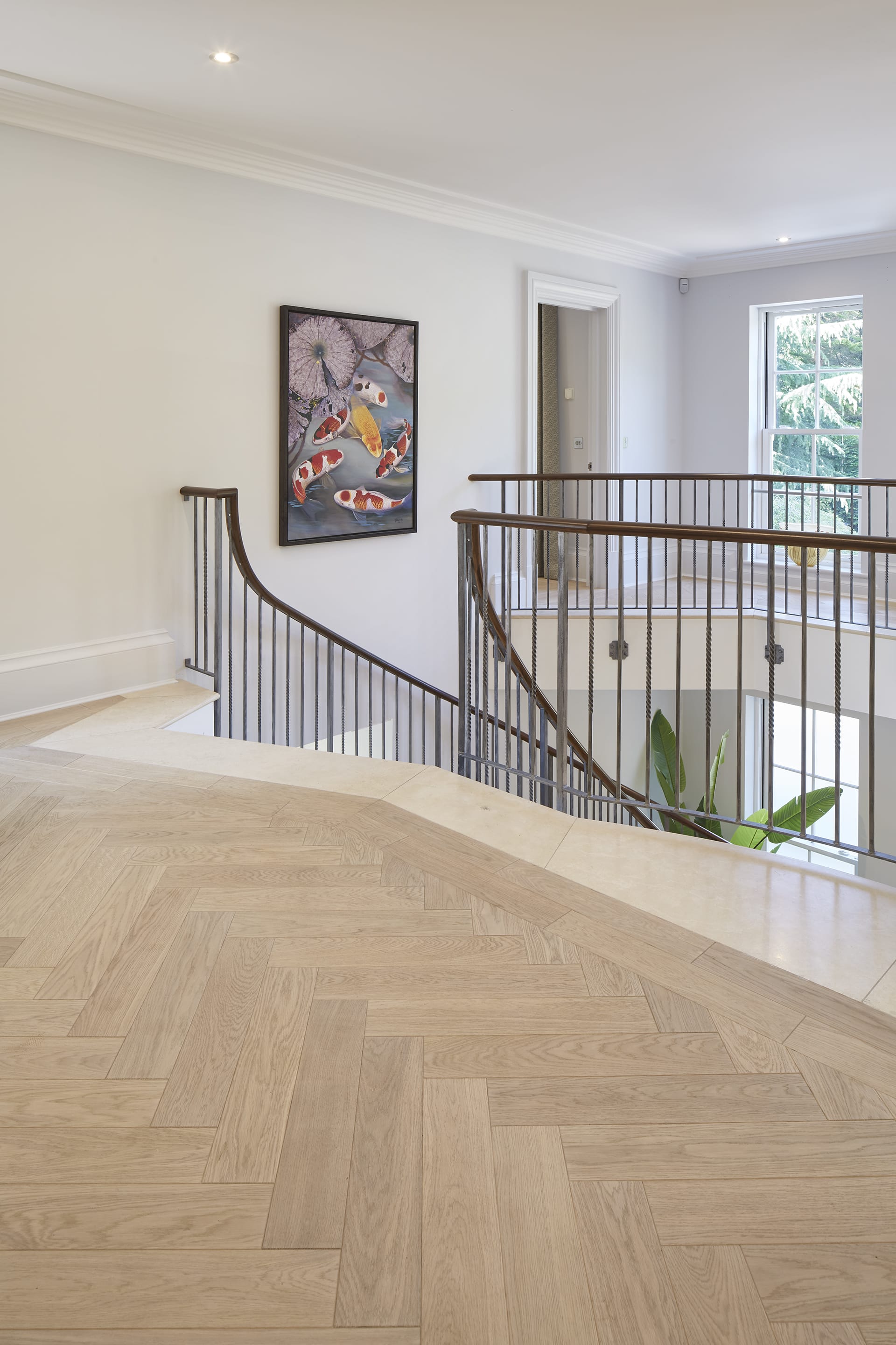 The light washed boards have been placed in a herringbone format with the wider Blanco Prime panels bordering the Corniga planks for a unique aesthetic.