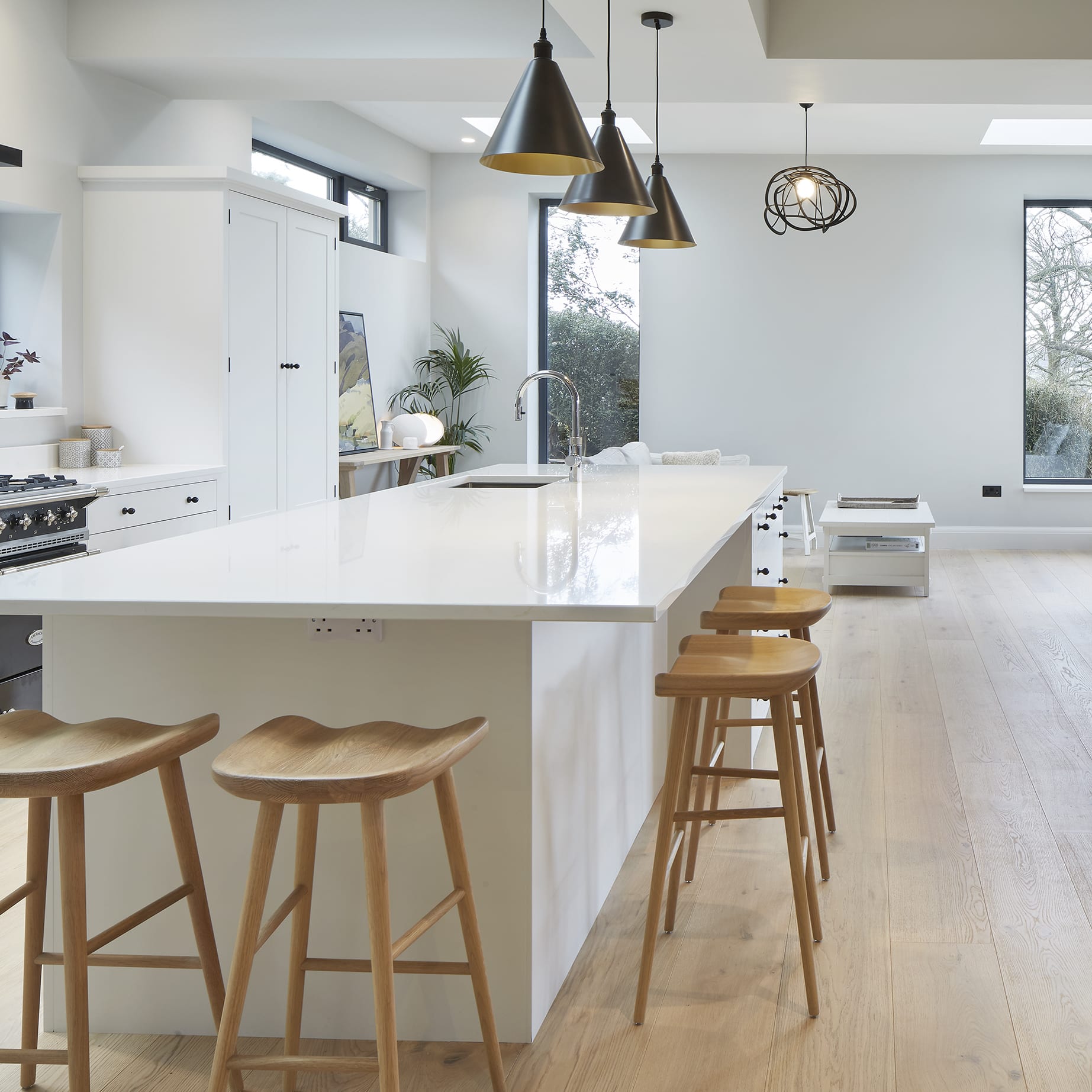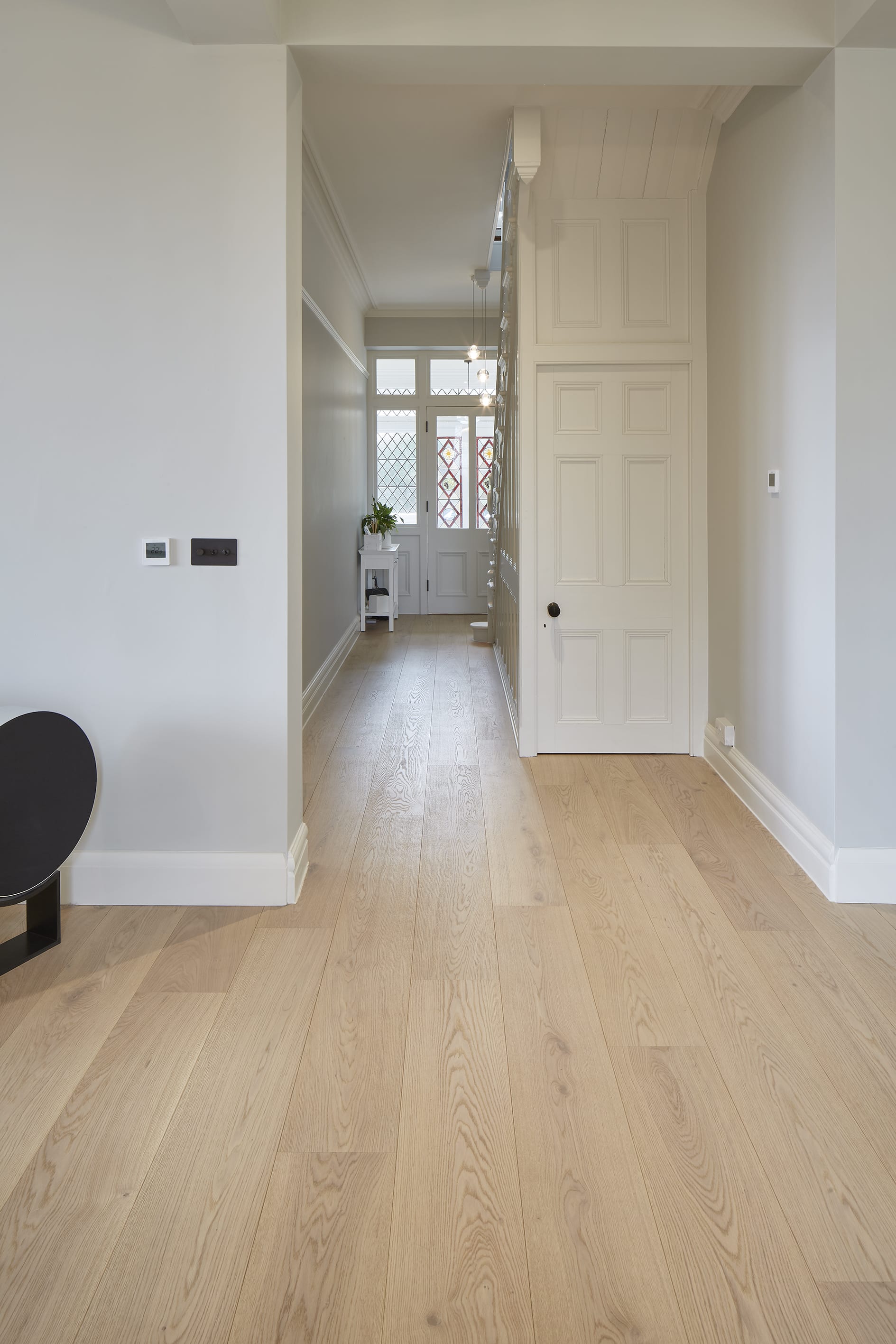 With a wet underfloor heating system planned, an engineered wood floor was essential for durability and stability. A high-quality wood layer ensured it could be sanded and refinished over time.