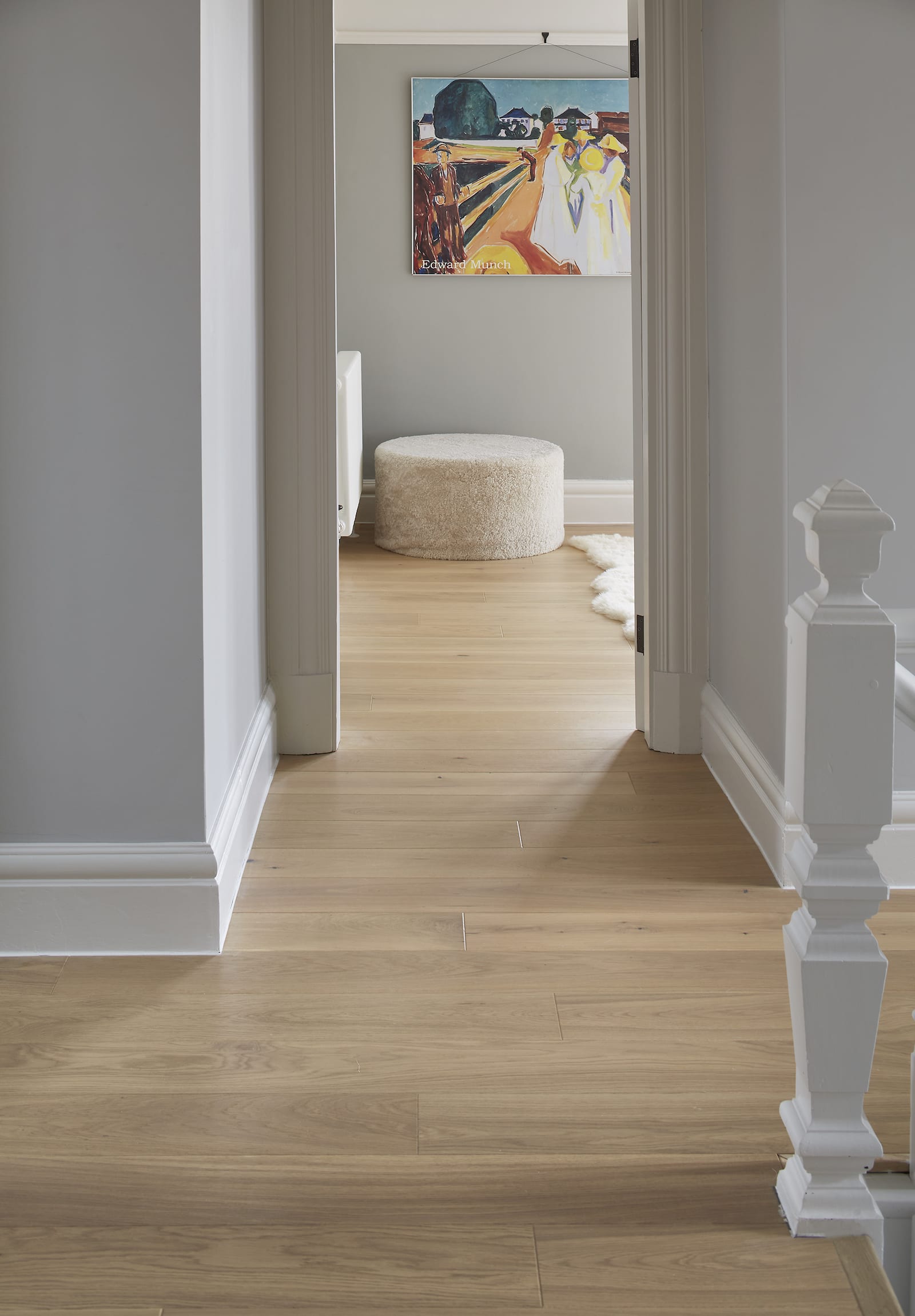 For the upper floors, a similar style was chosen to maintain continuity throughout the home. The Azur flooring provided a complementary look, with its slightly narrower boards suiting the proportions of the smaller rooms upstairs.