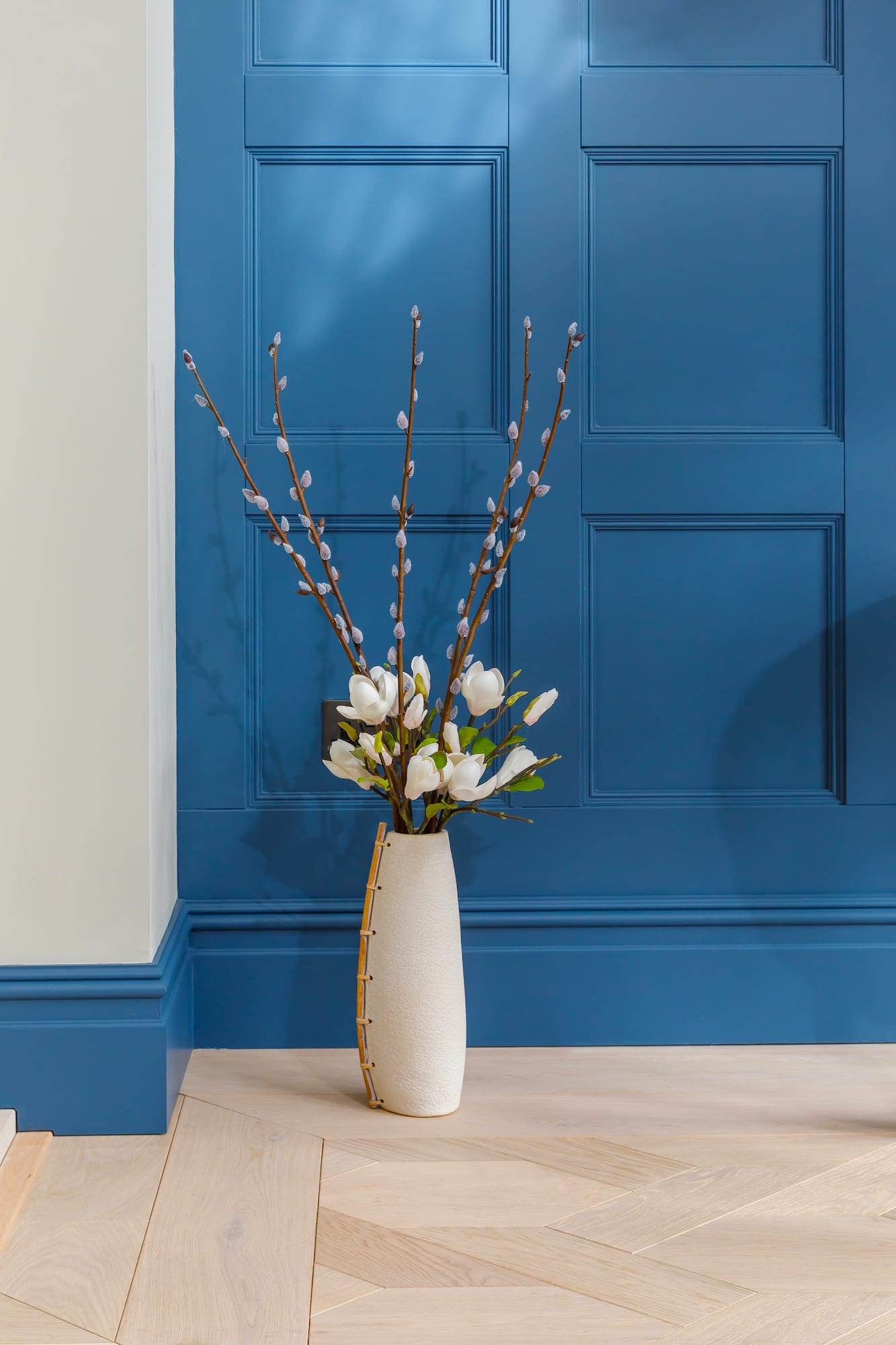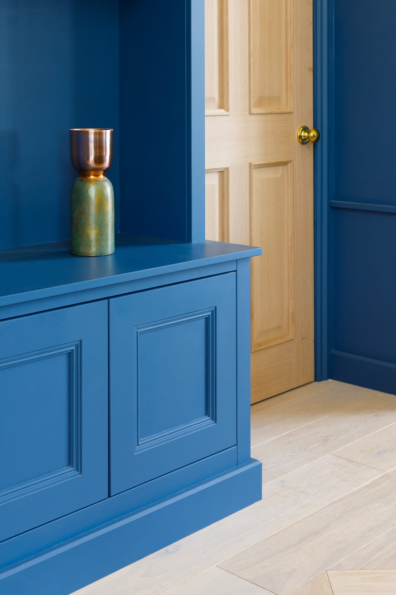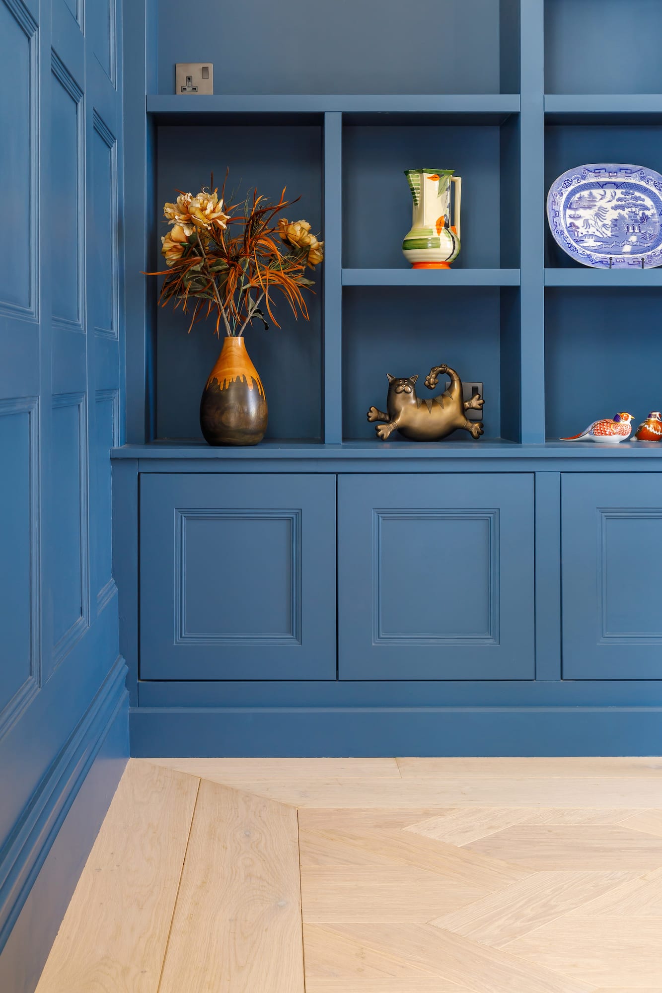 The transformation of the room was remarkable. The introduction of a bookshelf along the south wall grounded the space and balanced the proportions. New wall panelling in a vibrant blue by Lick paint responded beautifully to the changing light and made the room feel more intimate. The calming off-white walls provided a neutral backdrop for the clients' art and sculpture collections, and the striking fireplace and flooring from Havwoods added a touch of elegance and sophistication to the space.