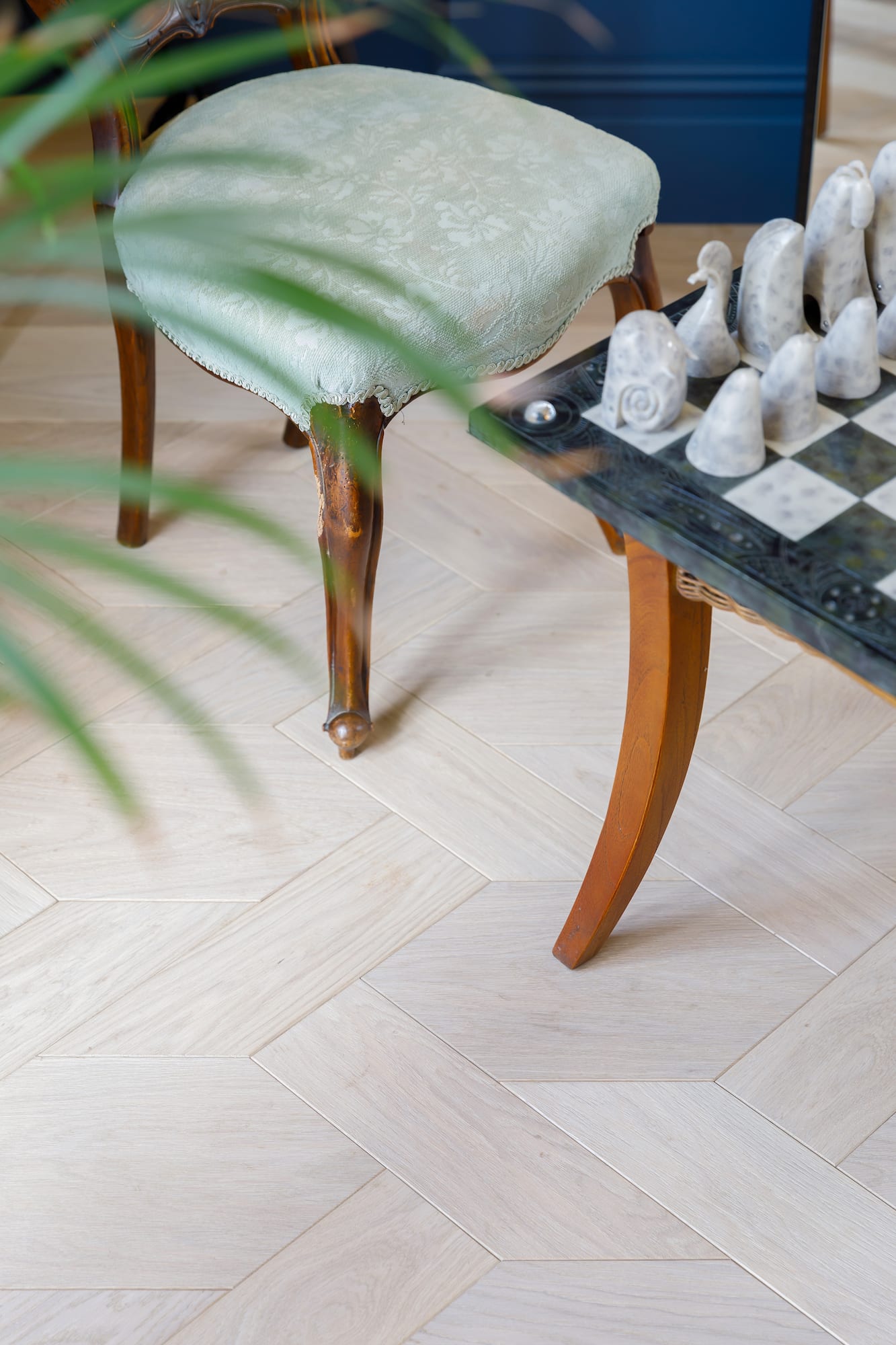 The designer chose to work with Havwoods, a flooring supplier they had previously worked with, due to their high-quality products and excellent technical support and sampling service. After considering various options Havwoods' Mansion Weave flooring was selected, which features a heritage-inspired pattern with a modern twist. The slightly whitened finish of the flooring softened the intricacy of the pattern and resonated with the clients' sense of style.