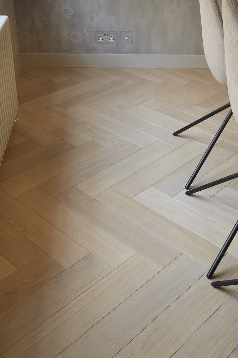 Beyond simply brightening the space, Laila aimed to infuse the design with her client’s personal taste in both colour and pattern. A defining product of the project was the use of Havwoods HW3005 Blanco Herringbone Prime flooring throughout.