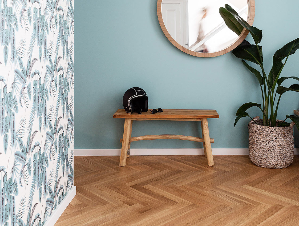 “Being in a apartment building, we were limited with the amount of windows down the side so you can tend to get darker areas. Pallido's colouring gives a beautiful, fresh, open feeling. When laid in the herringbone pattern, it delivers a sense of sophistication and a bit of a wow factor when you walk in."
