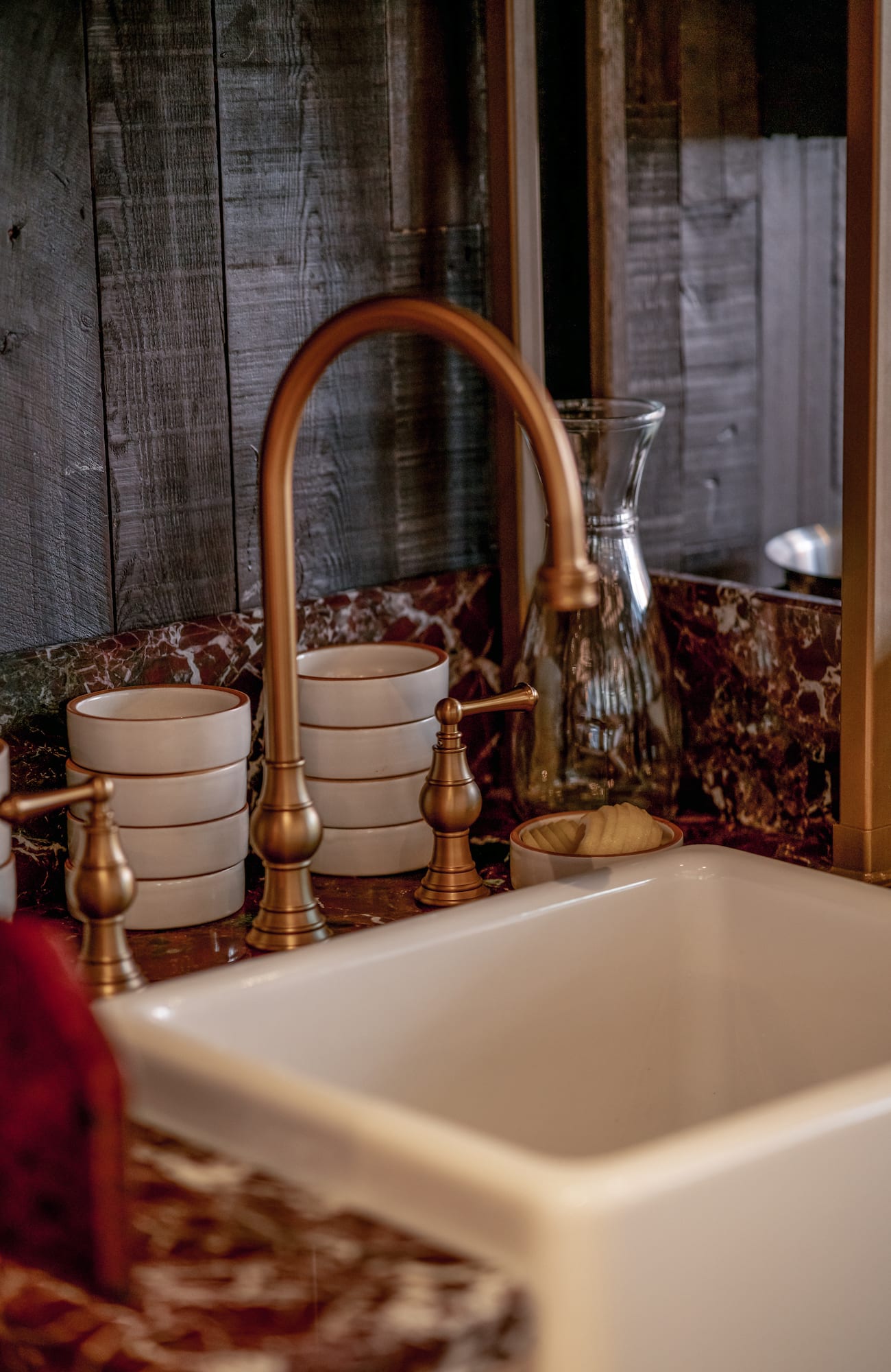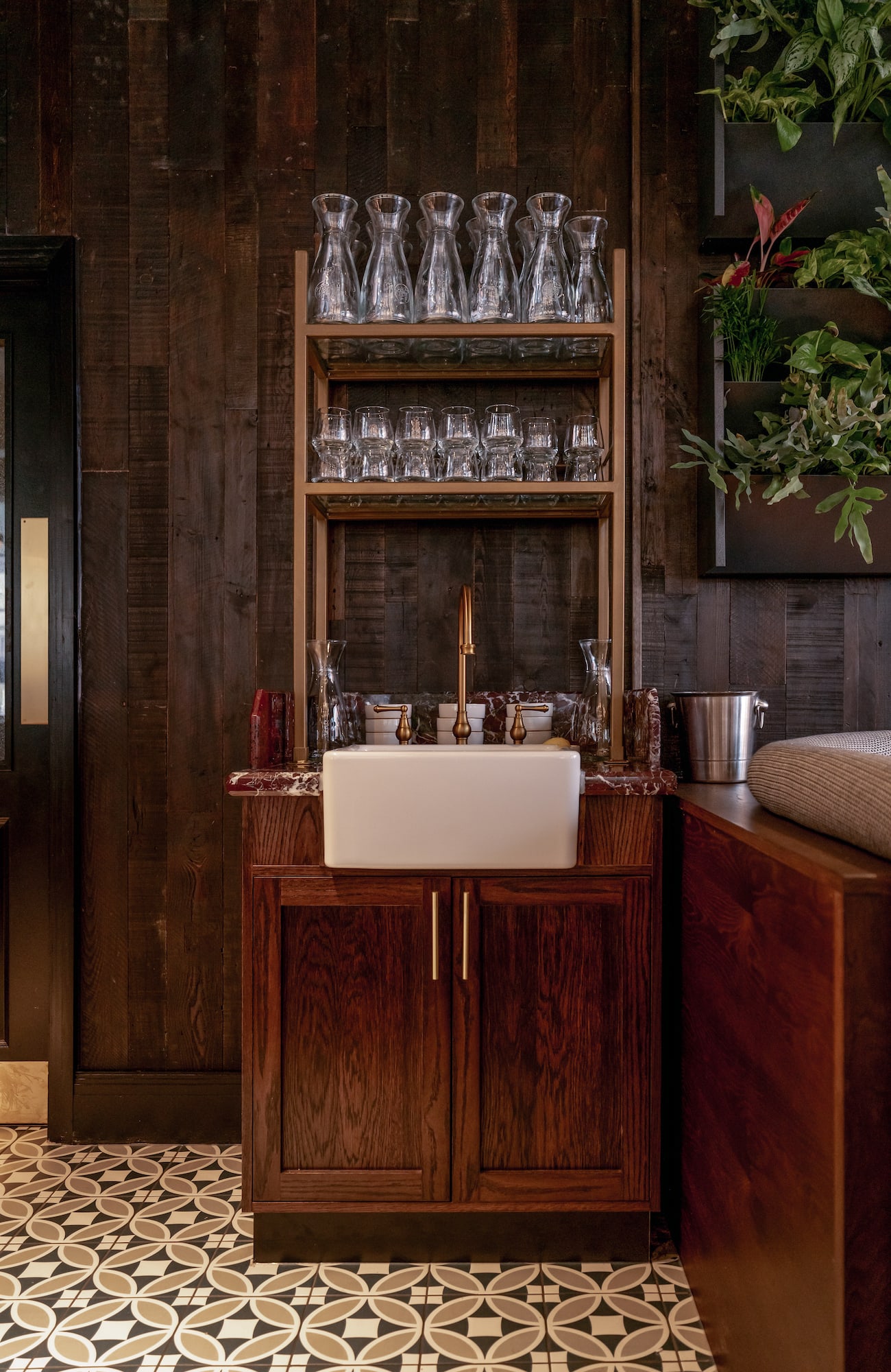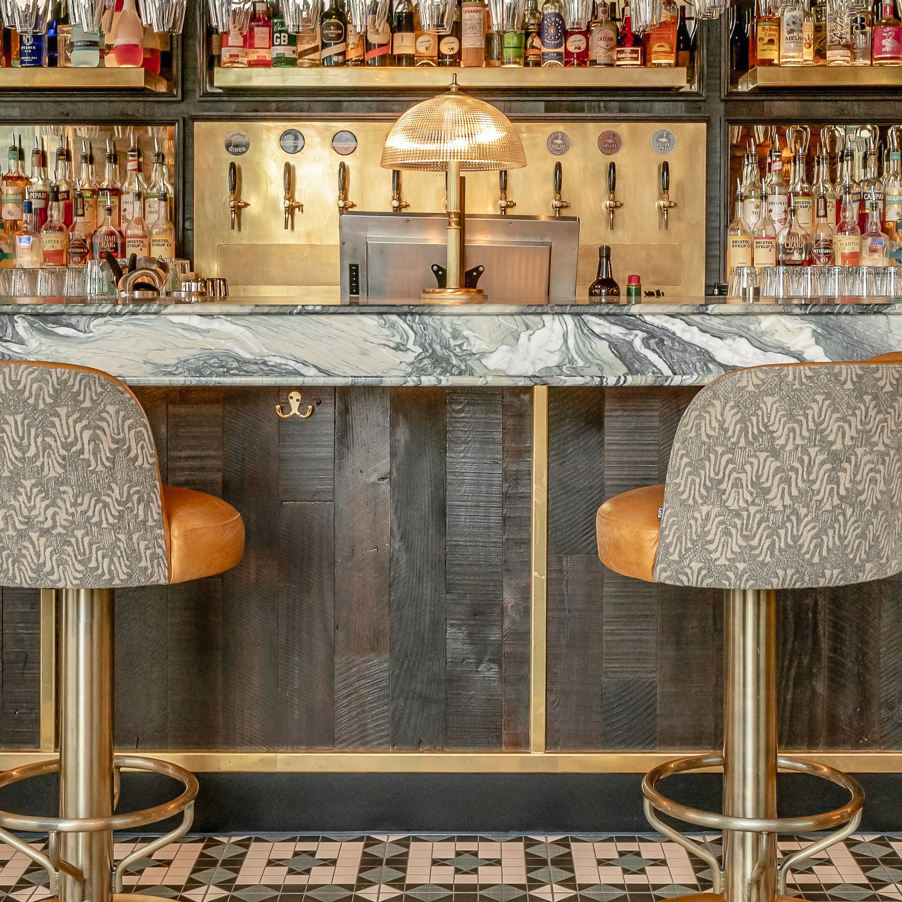 The oversized windows provide plenty of natural light to counterbalance the overall darker hues, while the building entrance is a feast for the eyes, offering a mix of textures, including wooden flooring and bold tiling. Elsewhere, mid-century-inspired velvet chairs and leather booths have been paired with a striking bar featuring hints of brass and an eye-catching slab of natural stone - which contracts beautifully with the dramatic tones of the timber wall cladding.