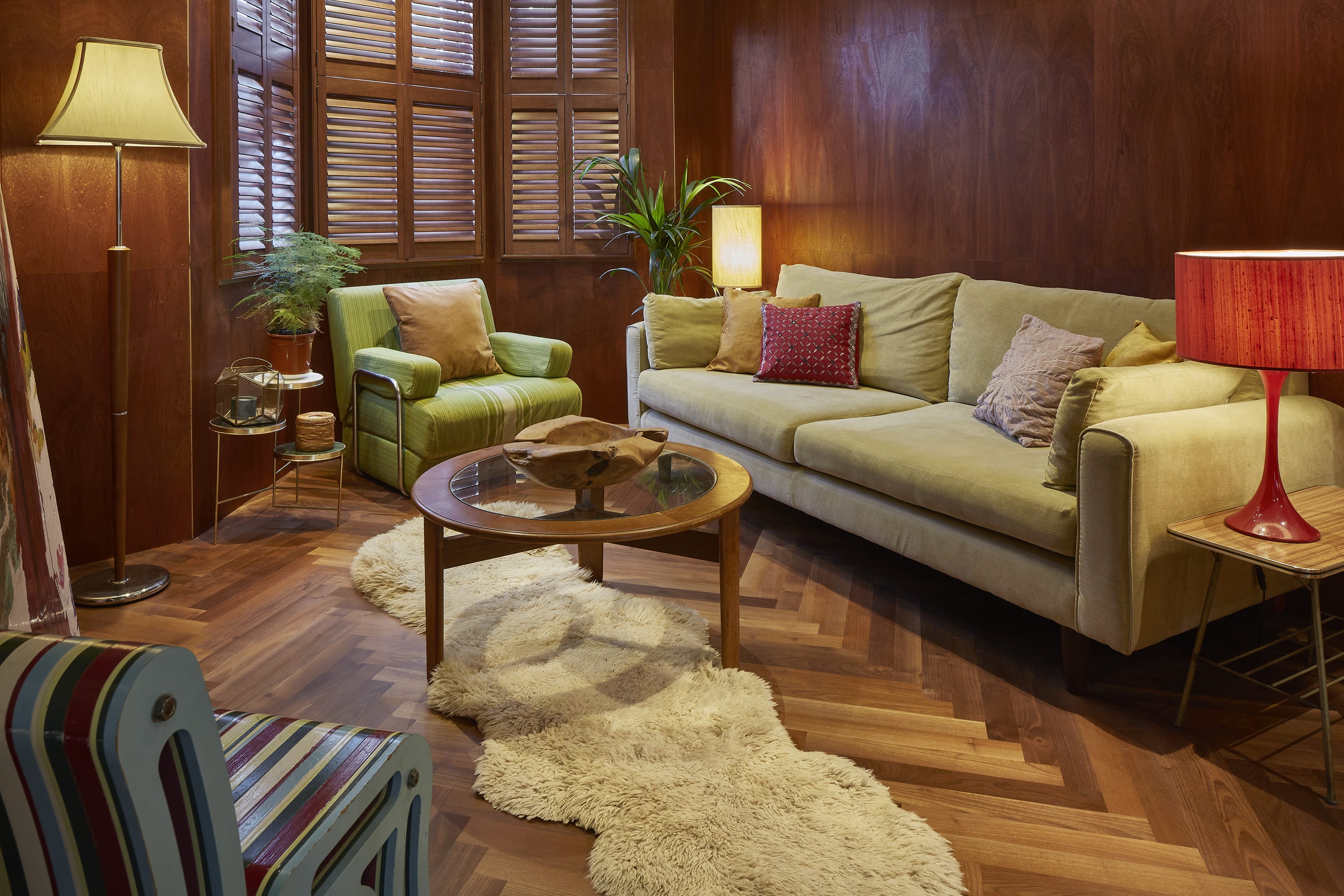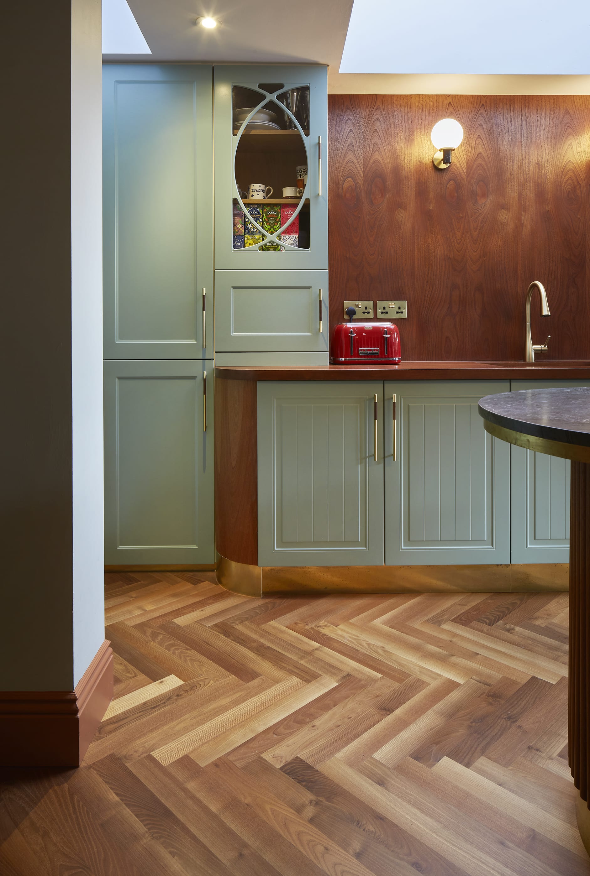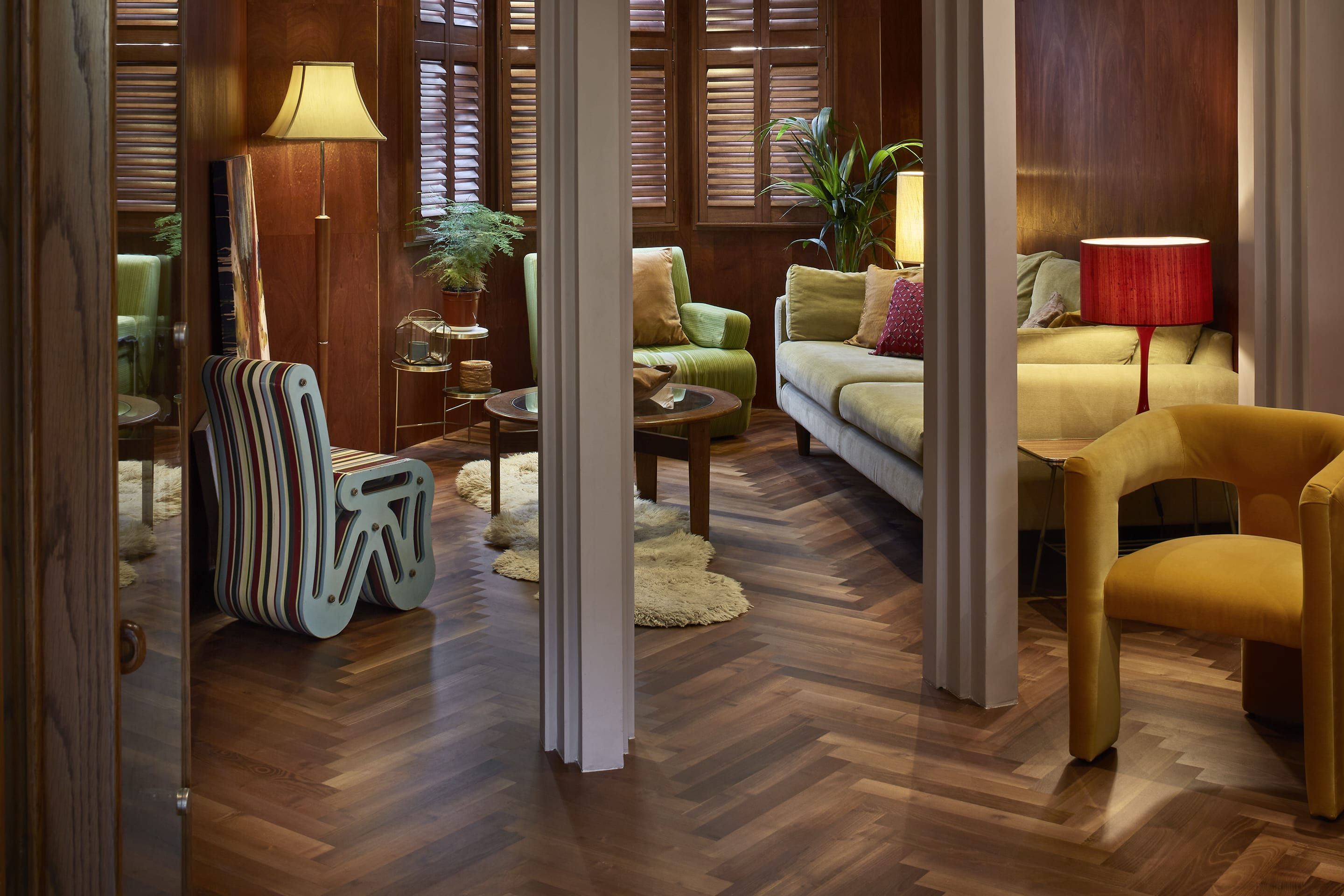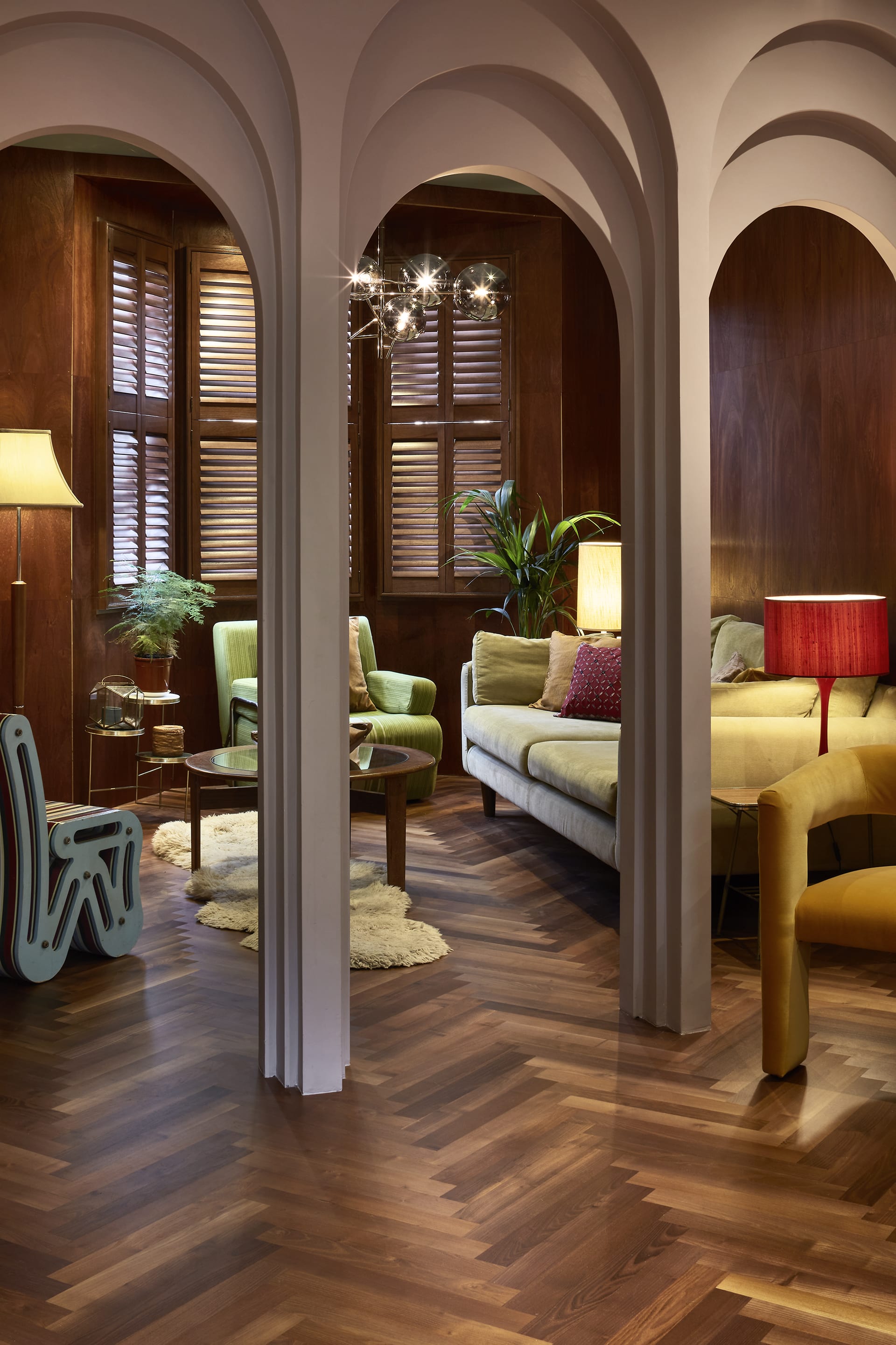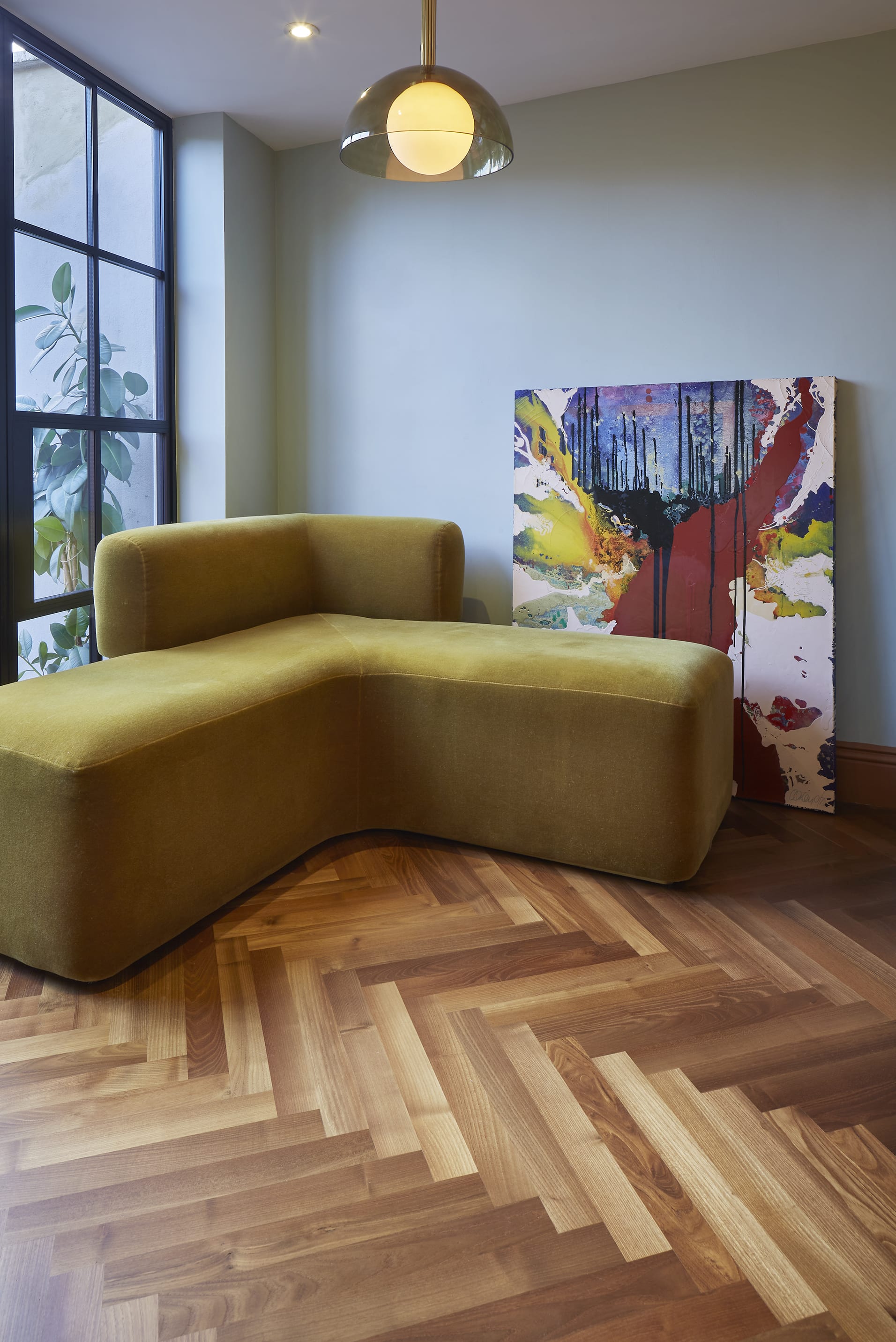 Chosen for its robust qualities, Havwoods' herringbone flooring adds a sophisticated appeal to the space and works beautifully next to the memphis-style arches and statement furniture pieces - providing the perfect mix of old and new.
