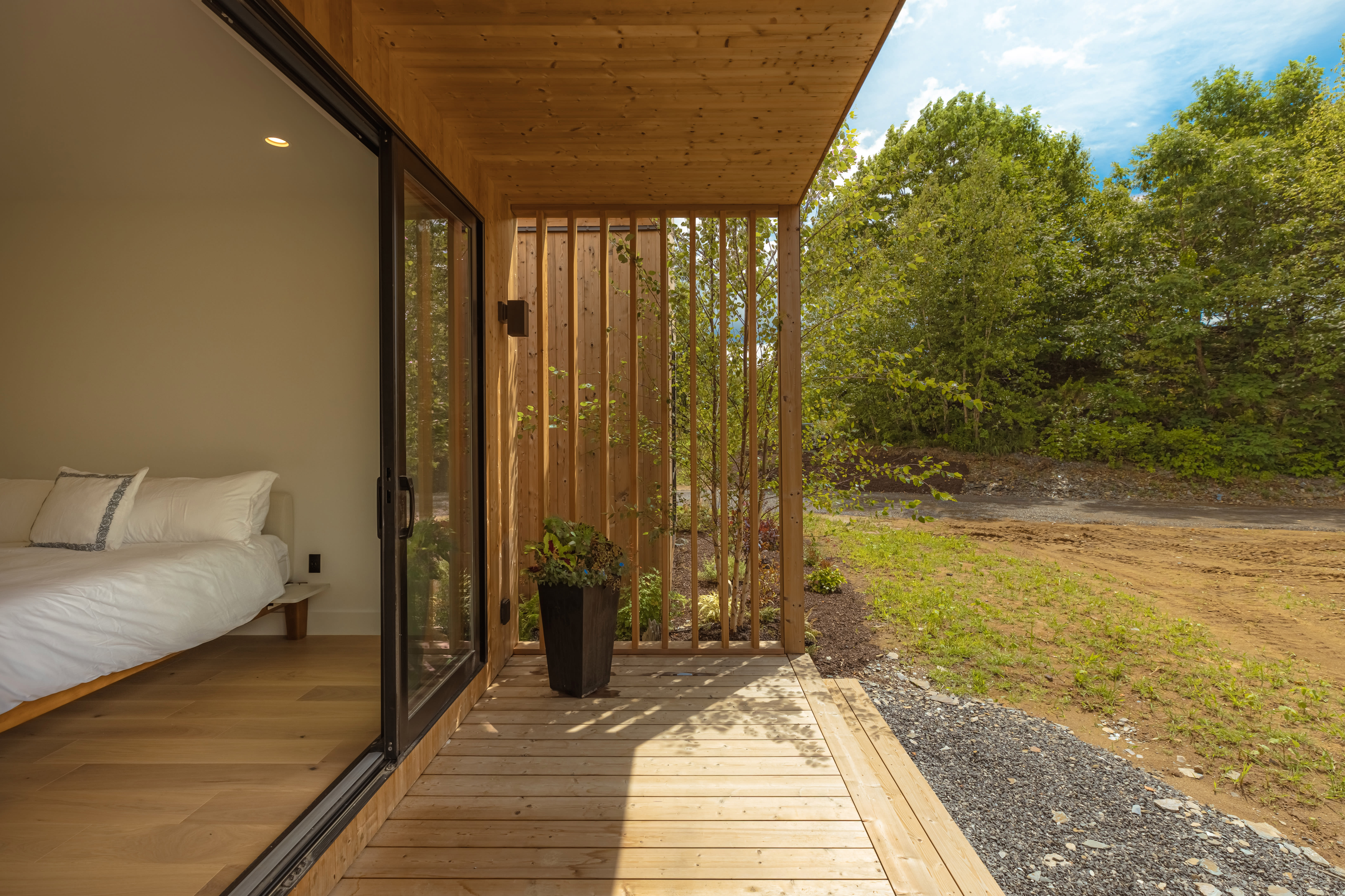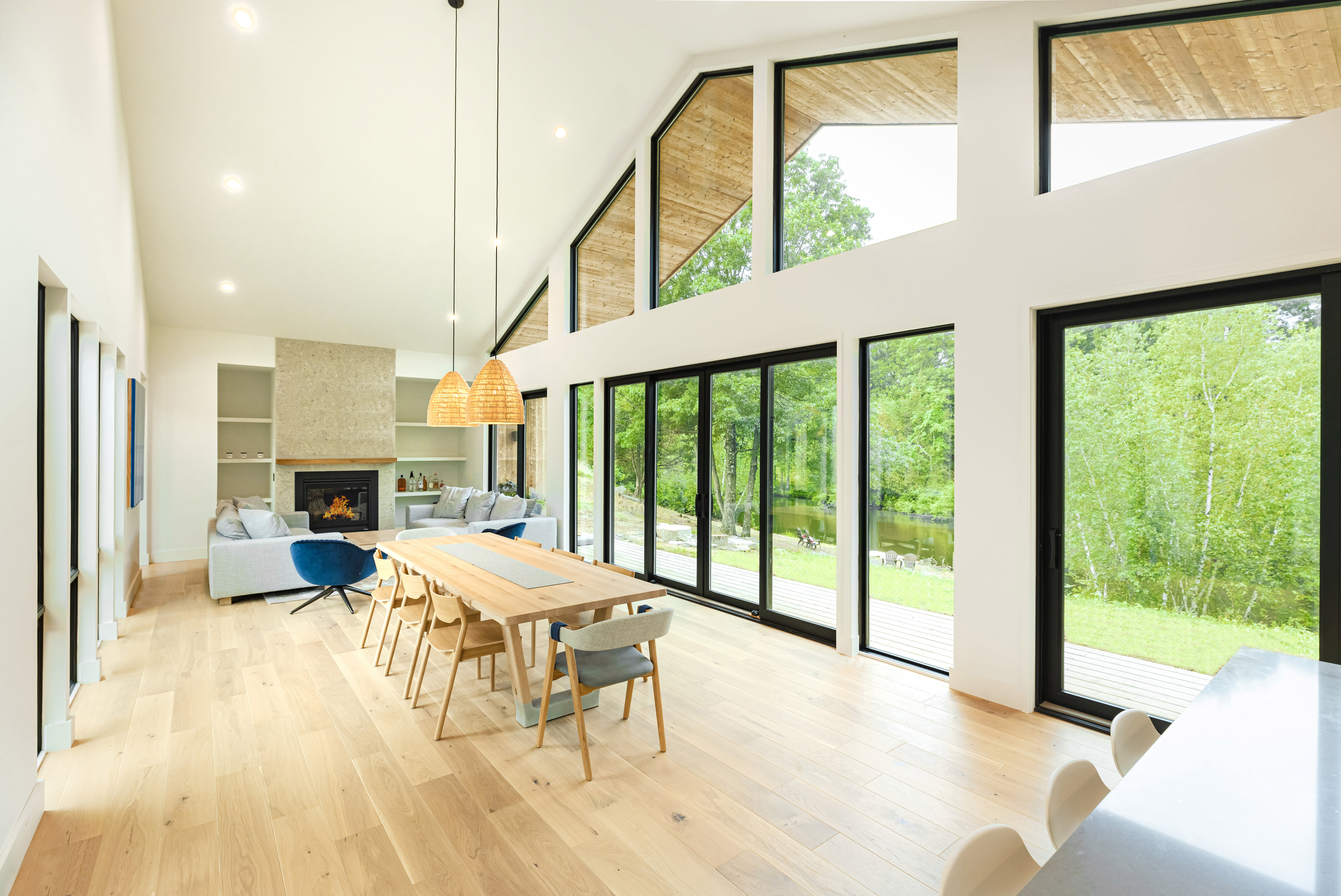 The light warmth of the wood floor marries the outdoor greenery and the natural light in a way that creates a calming and grounded space.