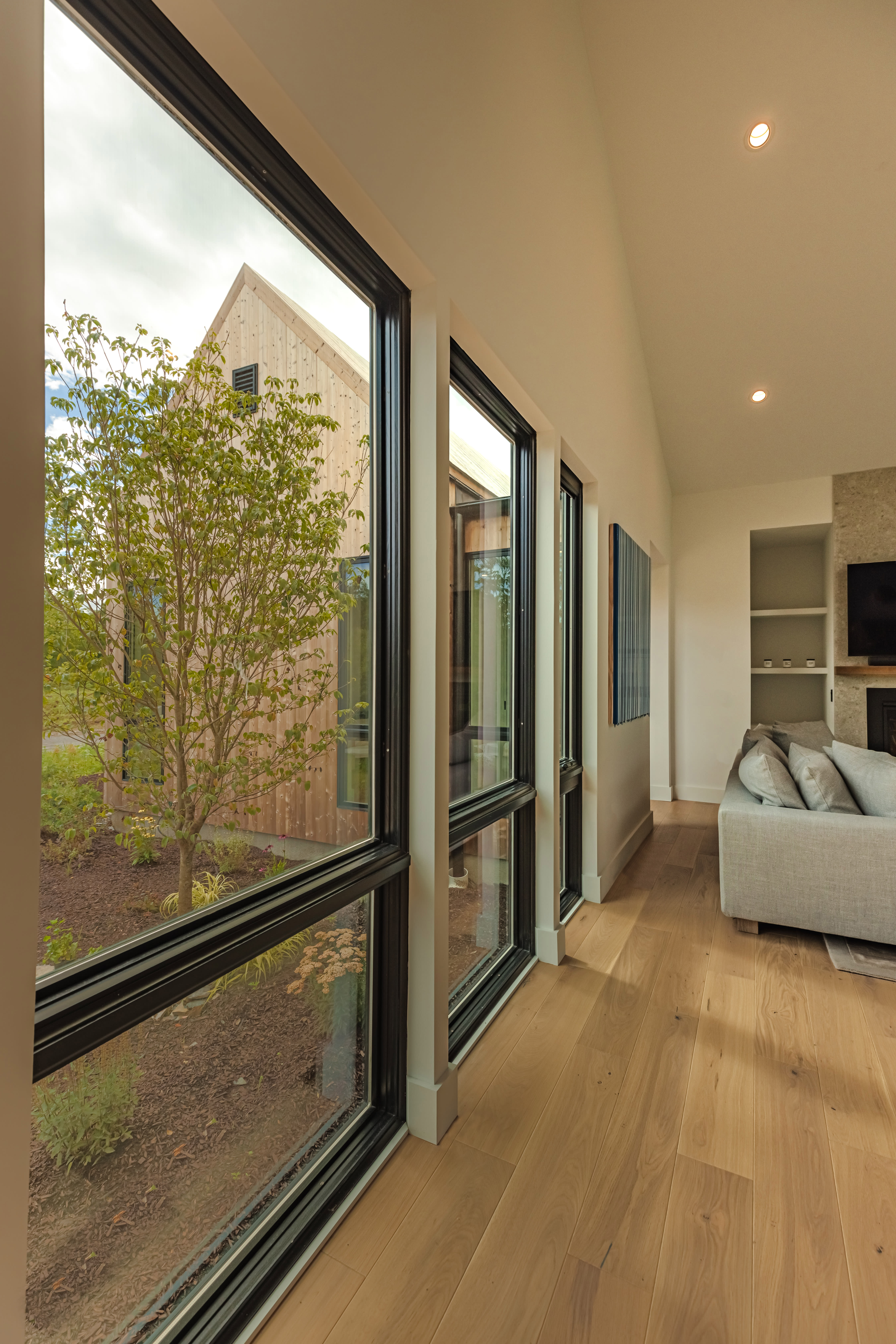 The entrance to the residence is via a central courtyard created by the multiple structures of the house. The separated volumes offer privacy to the master suite and bedroom areas and are connected via a linear glass breezeway, creating a dramatic interior element. Featuring our oak hardwood Provence flooring throughout, an open plan living, kitchen and dining space.