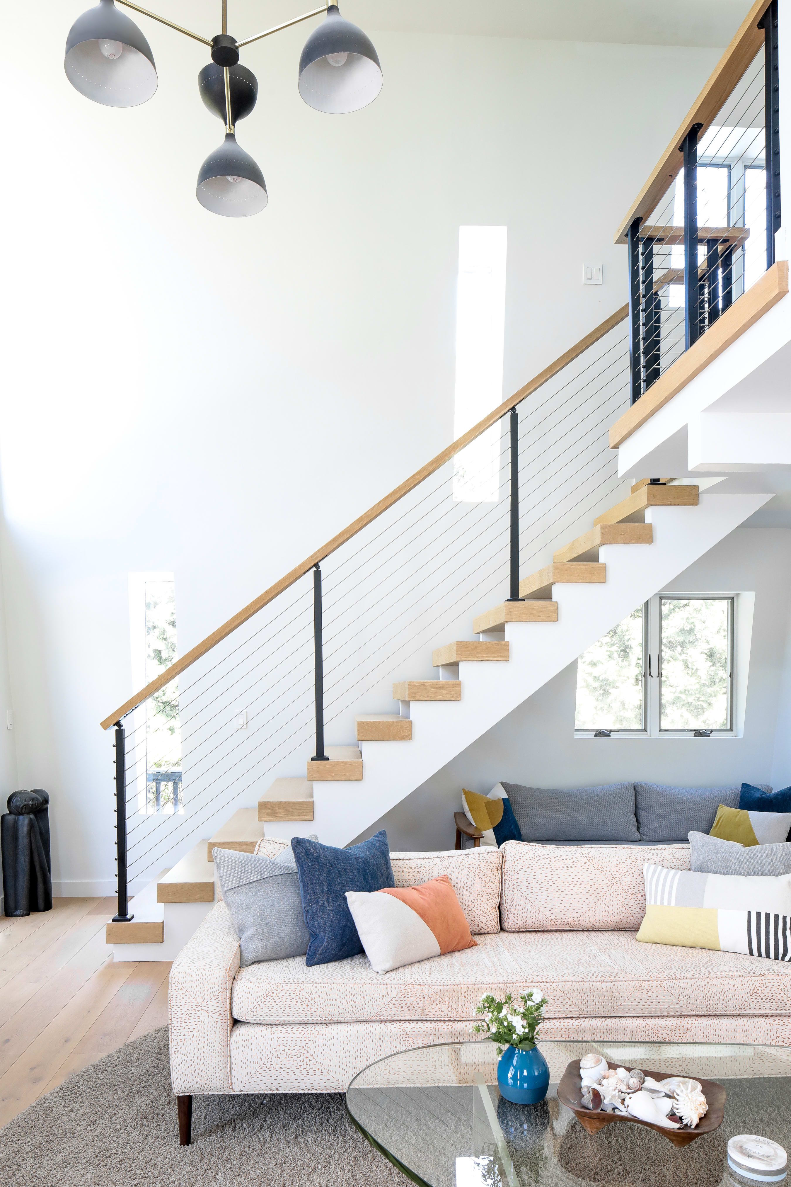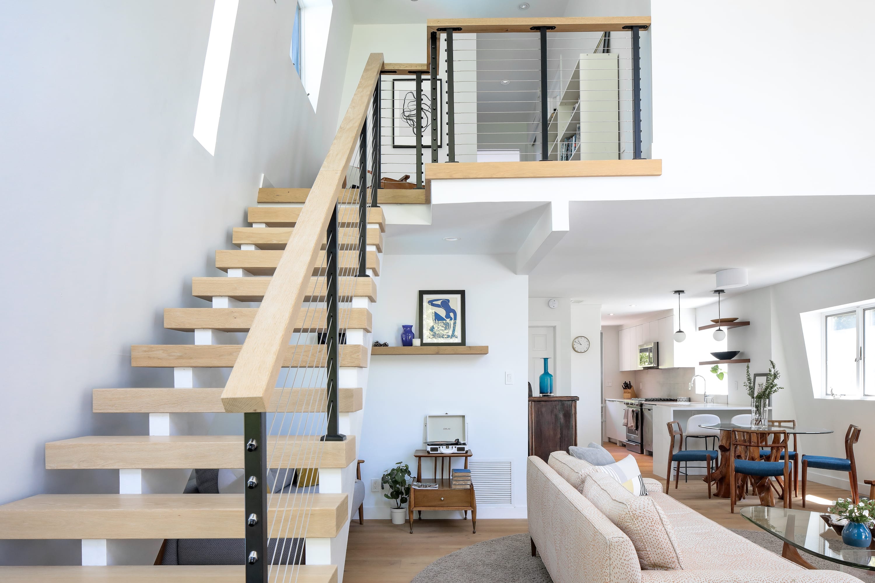 This update incorporated a healthy mix of new and old; the old stairs were replaced with a more robust floating stair with overlapping wood treads, and paired with a cable suspension railing system and wood handrail to match the flooring.
