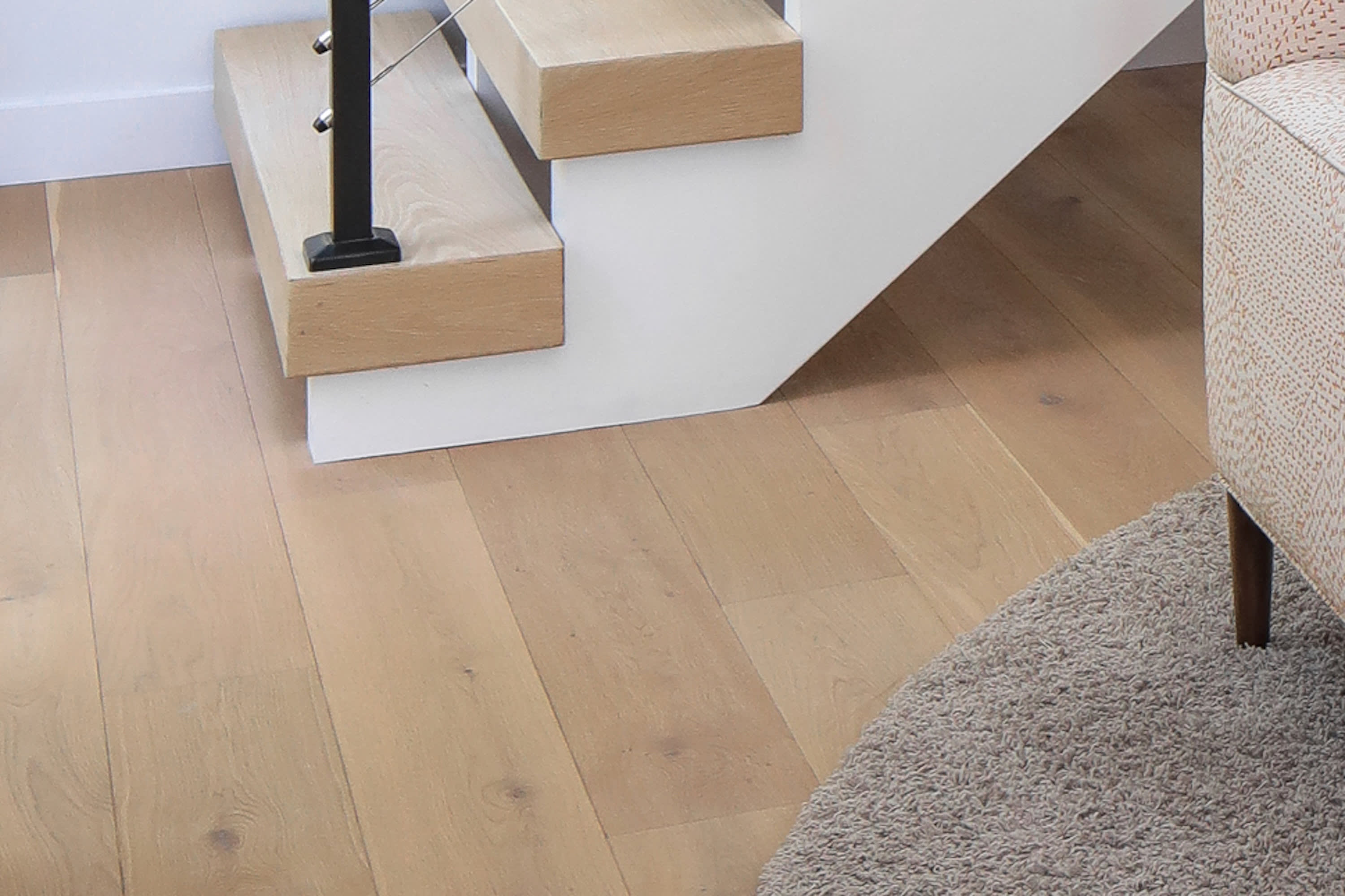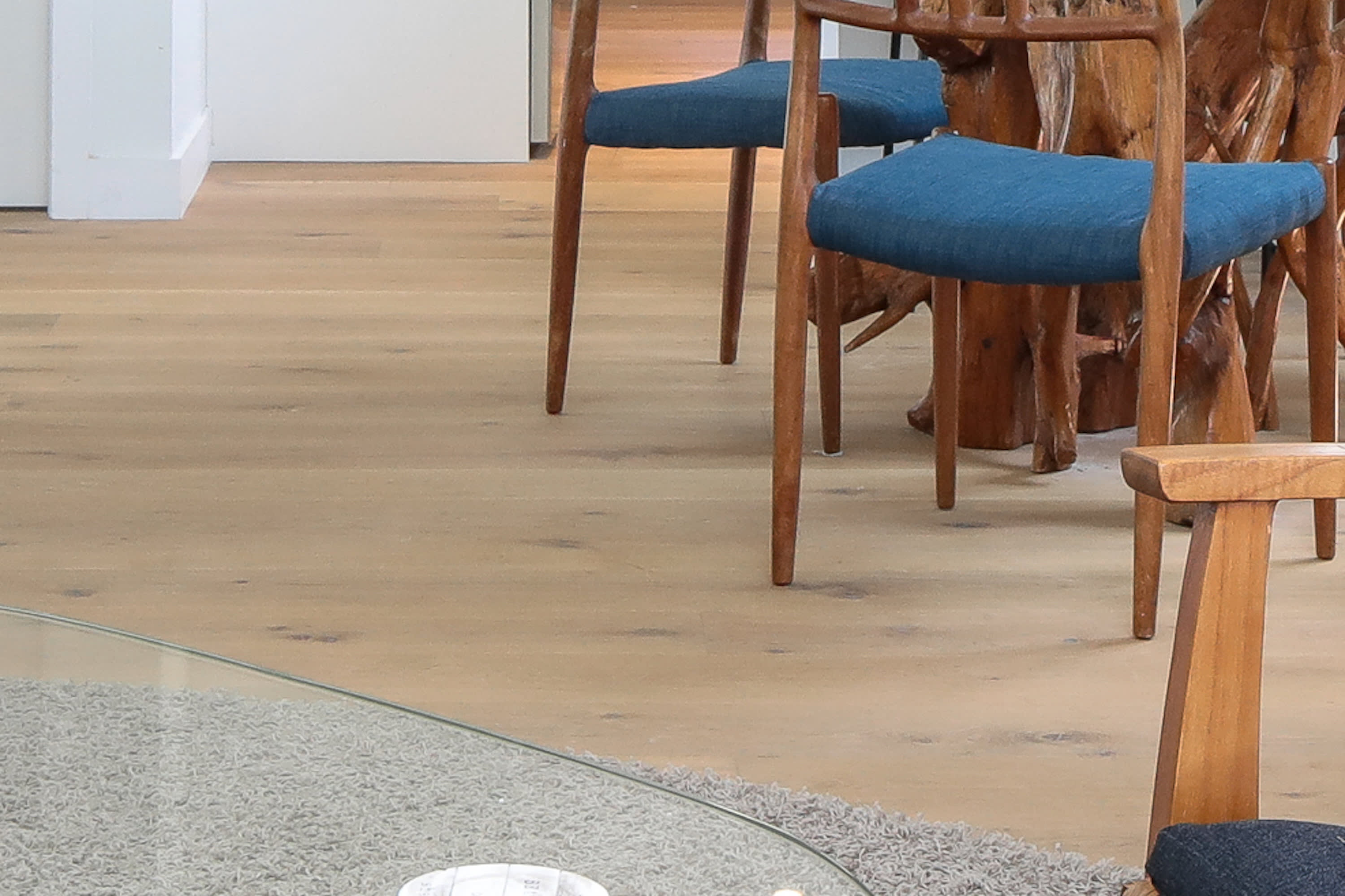Aspen Raw floors, from Havwoods’ Boutique collection, were selected to complement the aesthetic of the home, leaning into its mid-century characteristics. The blonde colour of the floor, with subtle shades of brown, perfectly complemented the coastal blue décor and whitewashed walls, creating a beautiful natural honey dew blend.