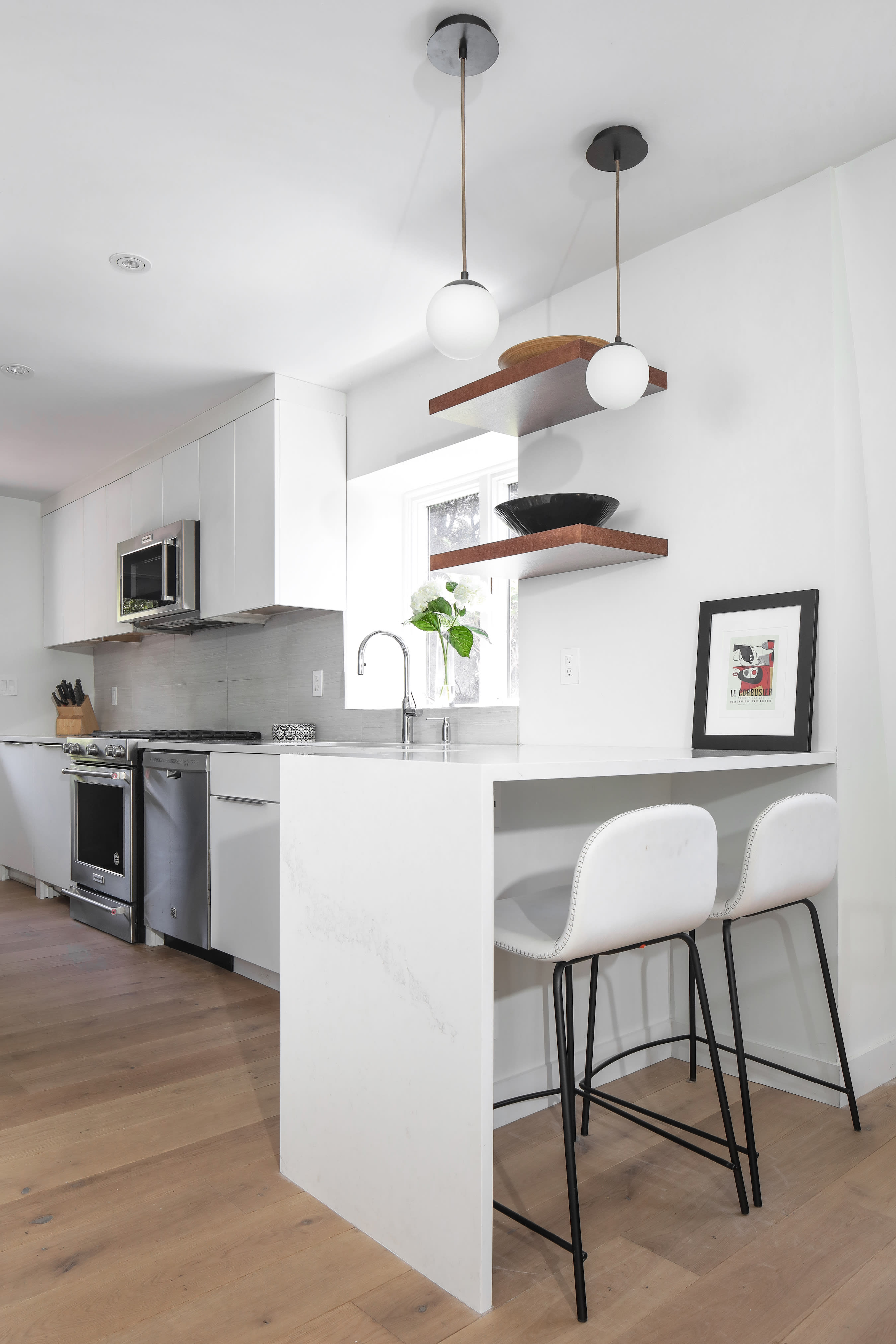 One of the biggest challenges during the renovation was to unite the kitchen, dining, and living room in a ‘layered program’ open plan that wouldn't compete with the ‘mid-century’ look of the angled walls on either side of the house. EXD Architecture successfully tackled this challenge by carefully selecting finishes and colors that complemented the style of the home.
