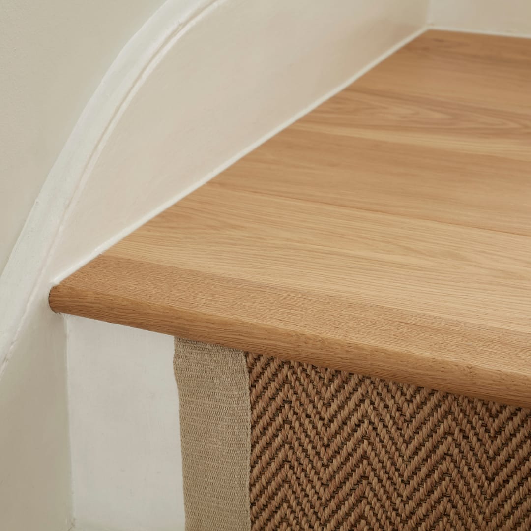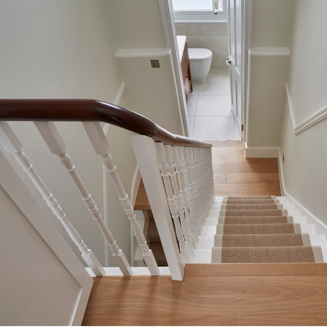 On the landings, HW14306 Basque planks were used, along with bespoke bullnose stair nosings that matched the timber precisely, ensuring a clean and considered transition between levels.