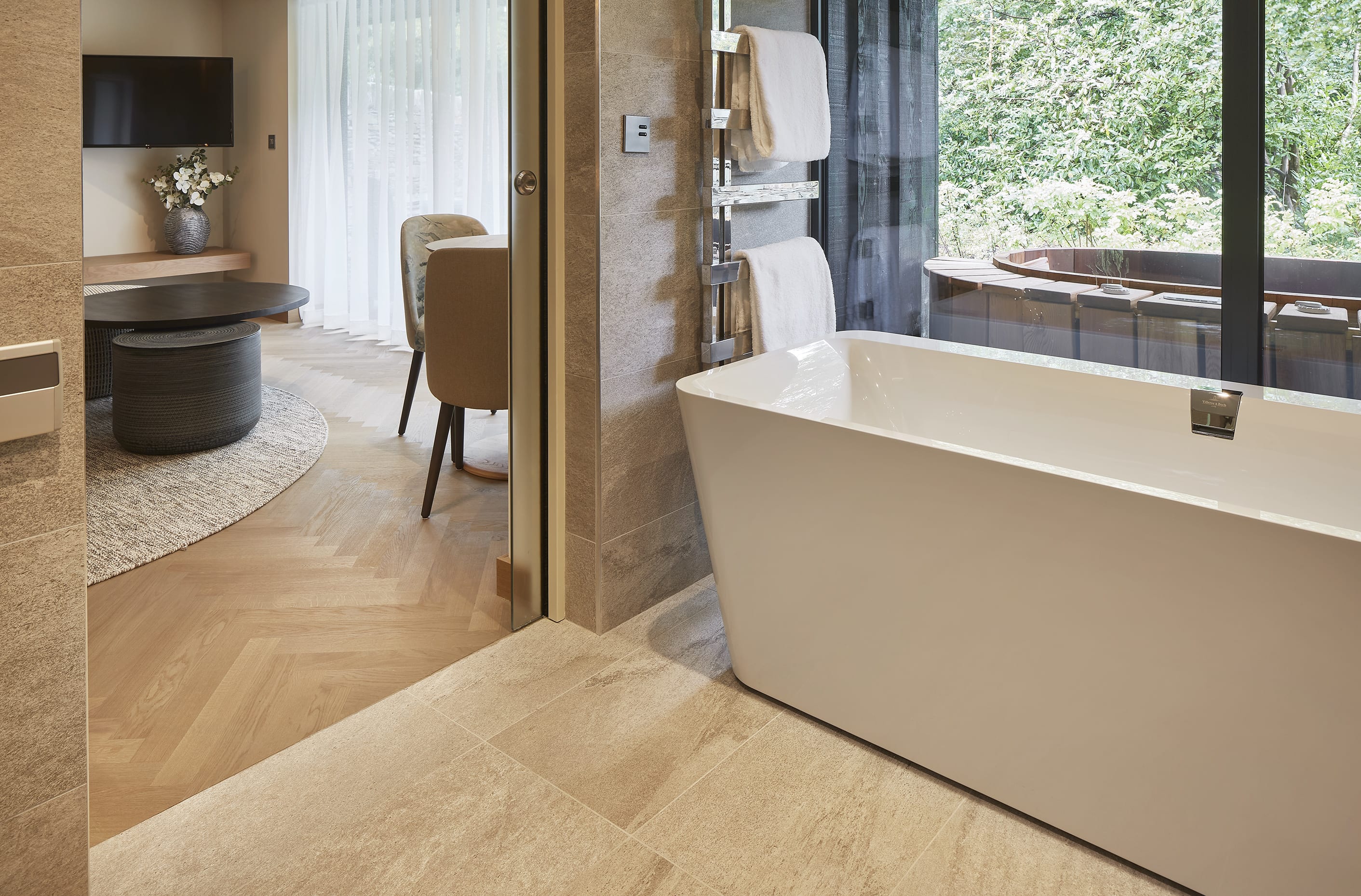 Now, each self-catering suite provides a luxurious retreat with its own private terraces and cedar wood hot tub, floor-to-ceiling glazed walls and underfloor heating – finished to perfection with Havwoods wood flooring.