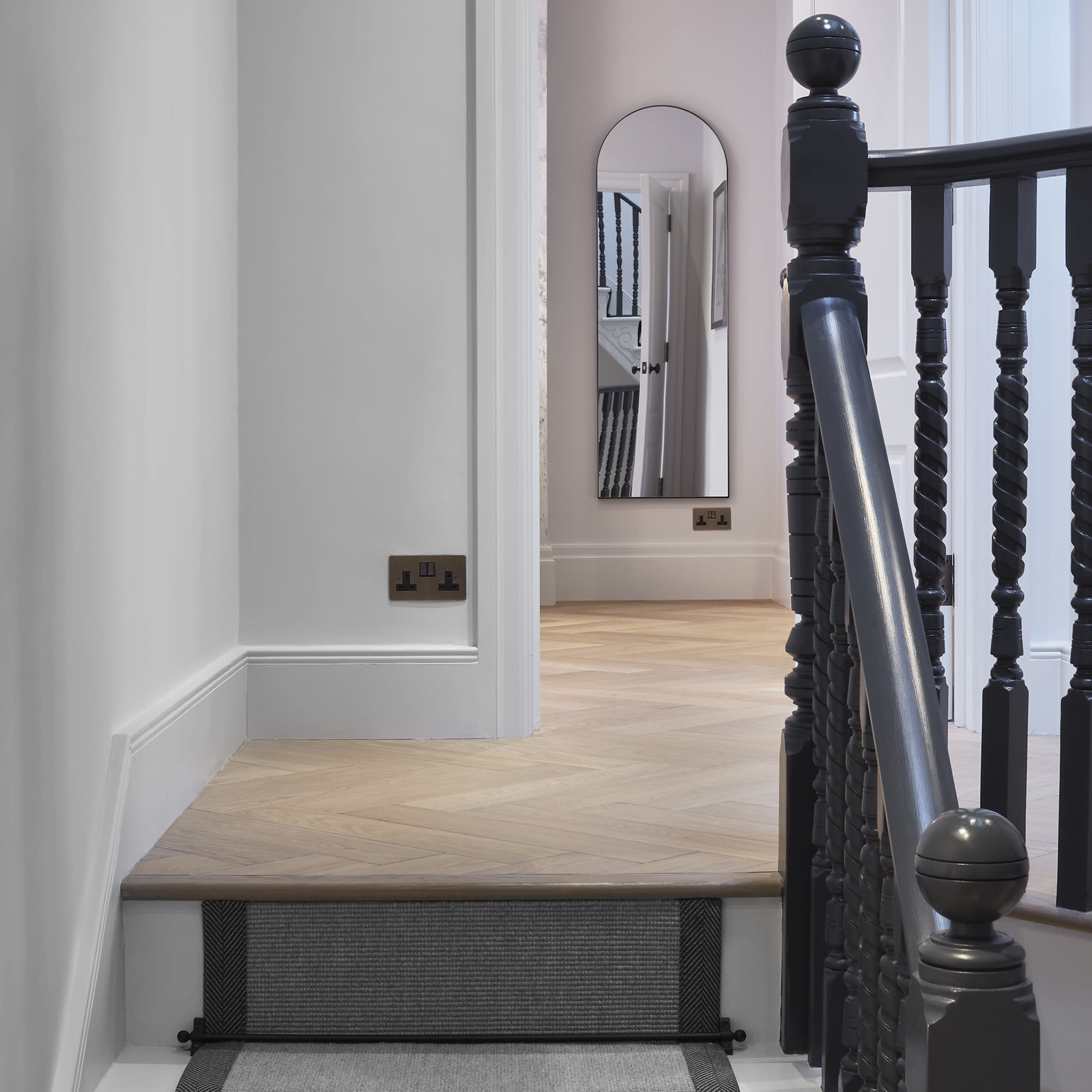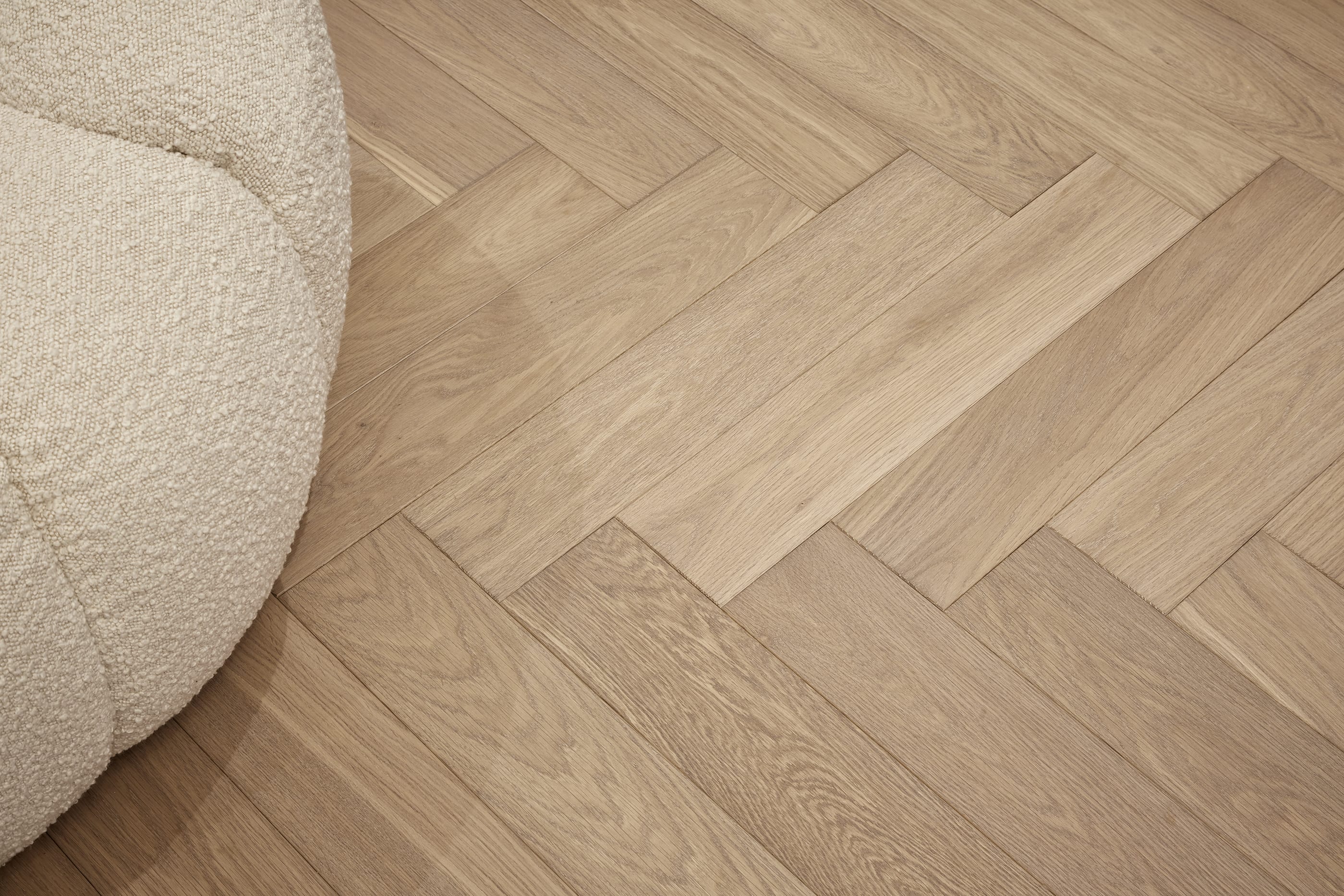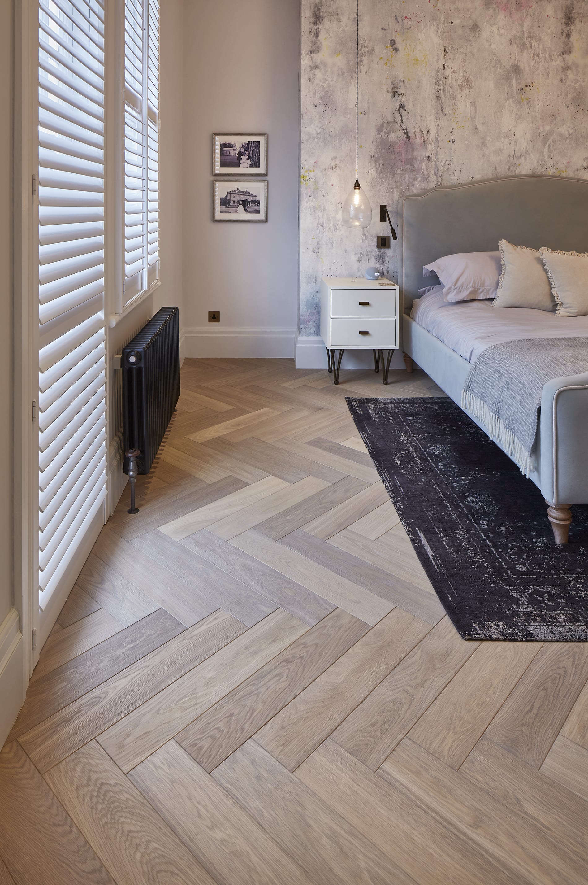 Havwoods flooring was chosen and used throughout the main areas of the property including the open-plan kitchen diner, living room, bedrooms, upstairs landing, cinema room and home gym. The Fendi Prime Herringbone flooring provides plenty of character with interesting graining that varies from plank to plank, along with cooler grey undertones which perfectly accompany the wall colour – especially in the bedroom which puts lavender centre-stage.