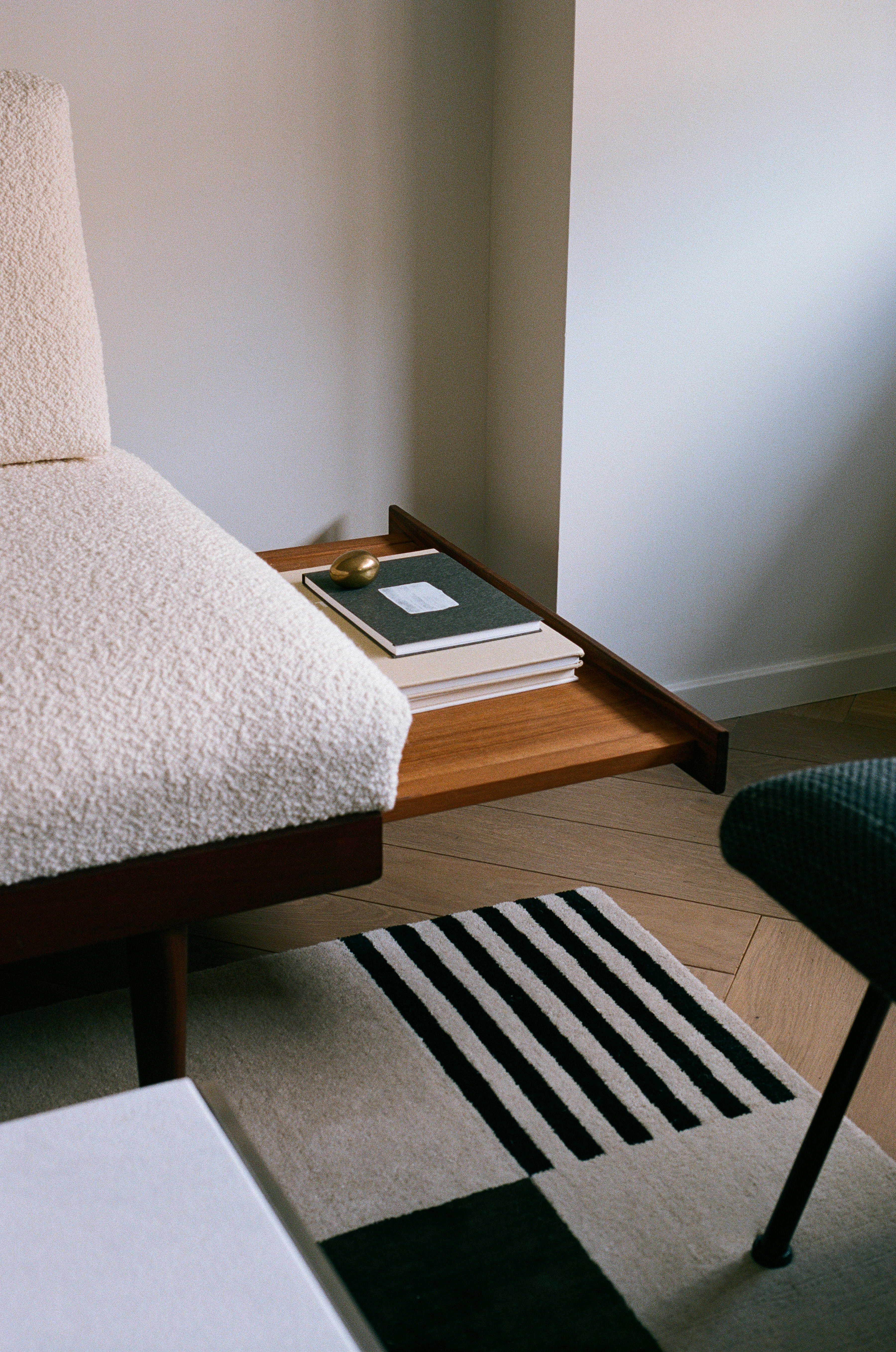 A: As much hidden storage as possible so the space appears clean and simple! If closet space isn’t an option, make built-in cabinets where possible, like in any niches that would lend themselves well to that kind of thing. But along with that, also just being extra considerate when bringing in new pieces to the space. Less is more.