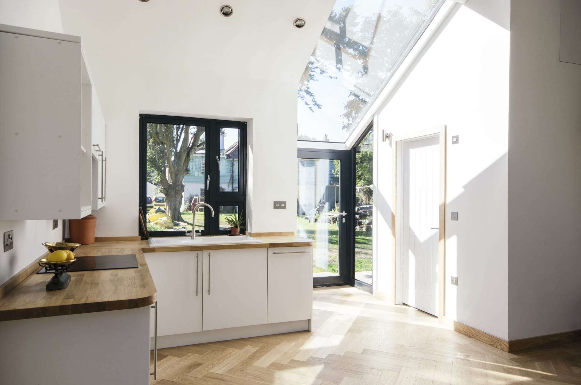 Shrouded in charred Larch wood cladding, the dark architectural exterior is contrasted with the structure’s bright and inviting internal scheme, featuring crisp white surfaces, industrial fixtures and Havwoods flooring.