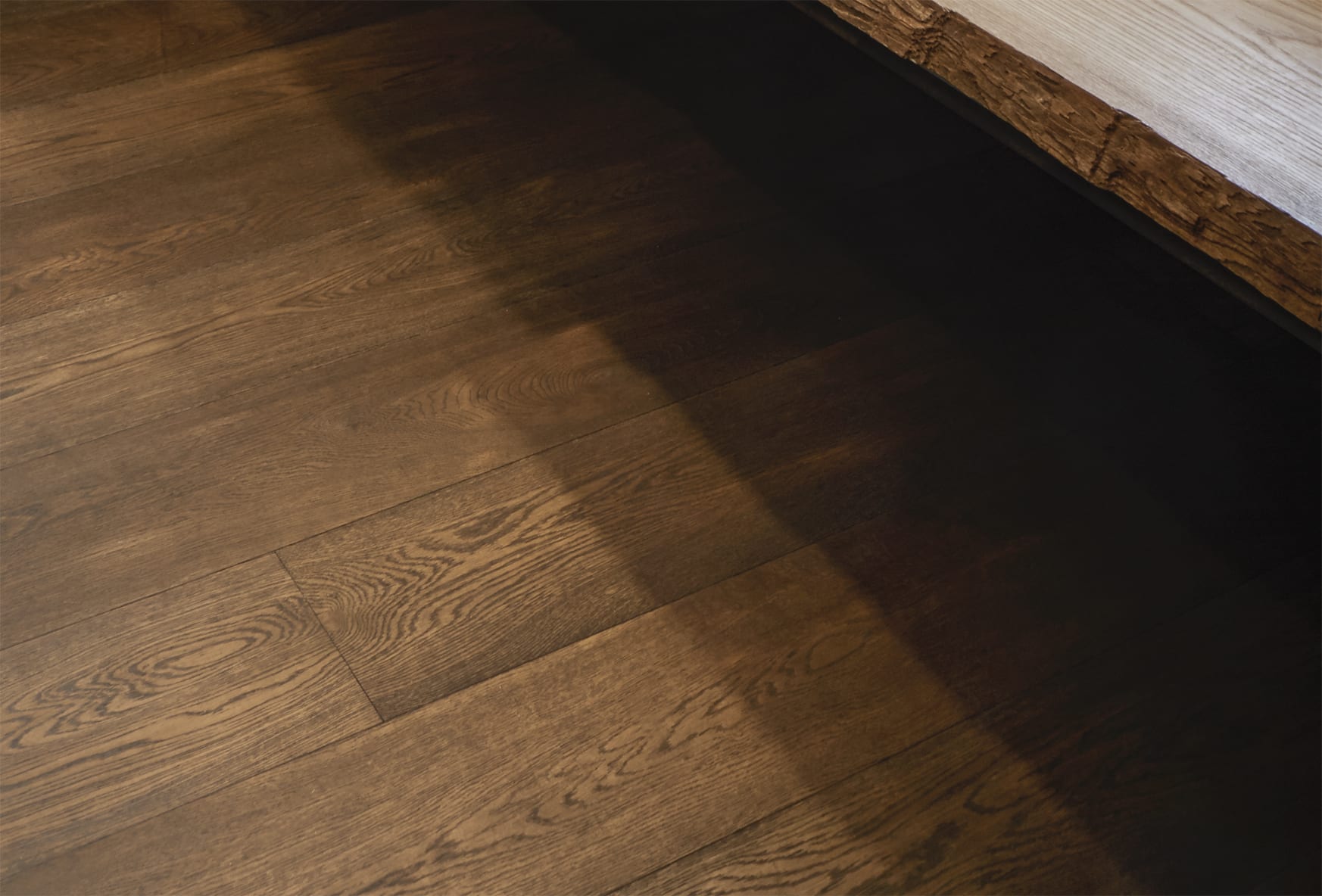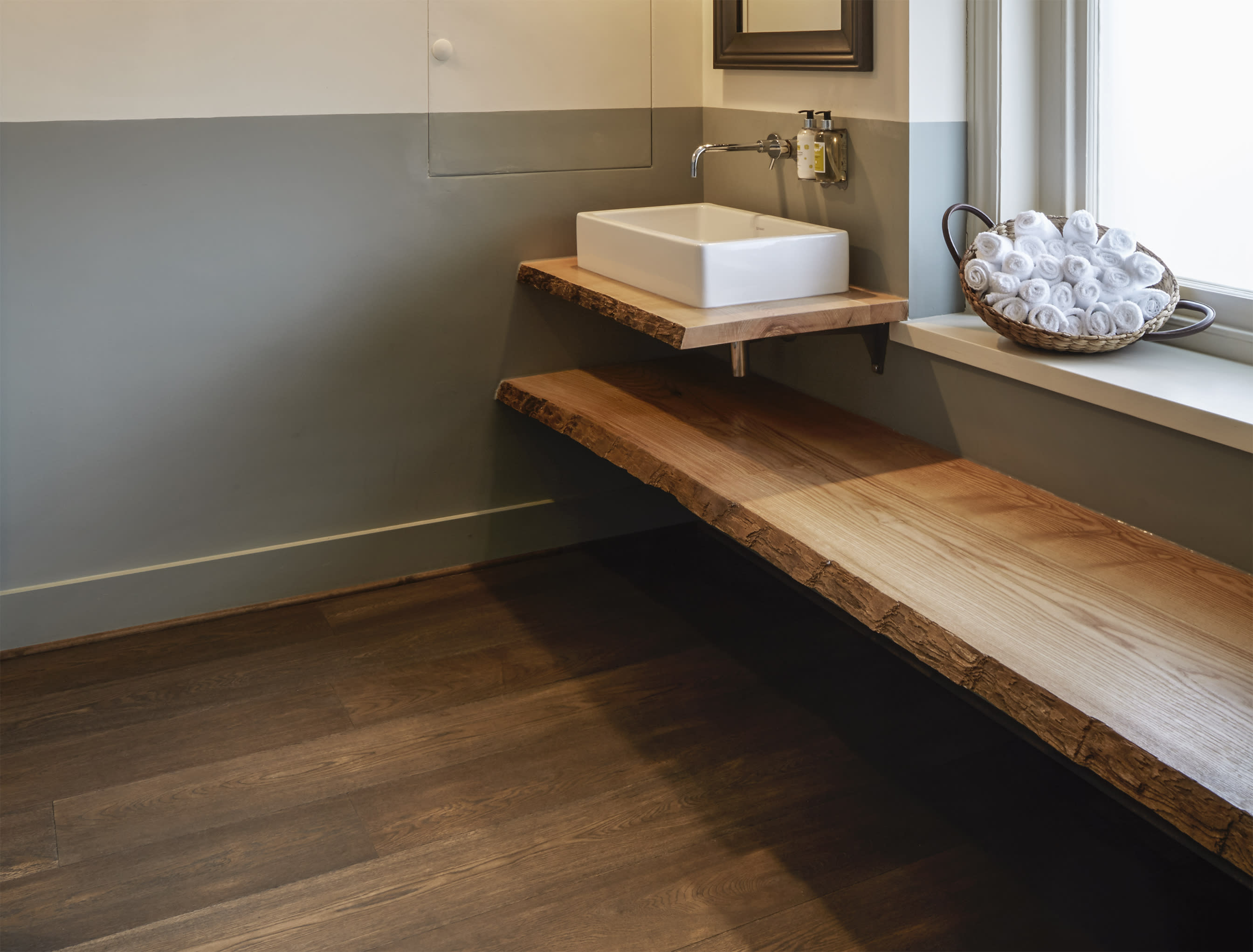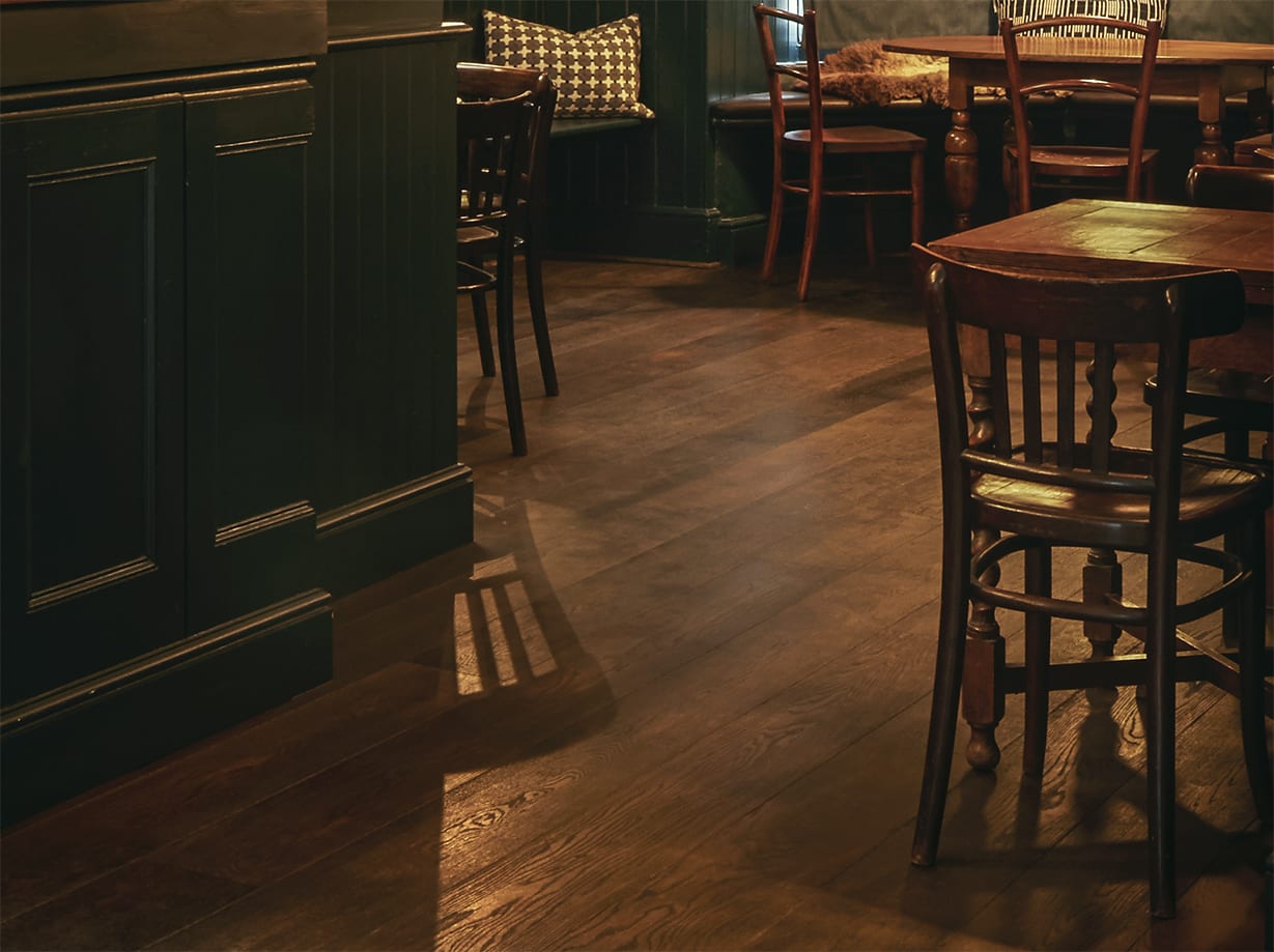 The cosy bar area, however, is an altogether more traditional affair, with old pub tables, classic chairs and a smoked oak plank floor from our Venture Plank range.