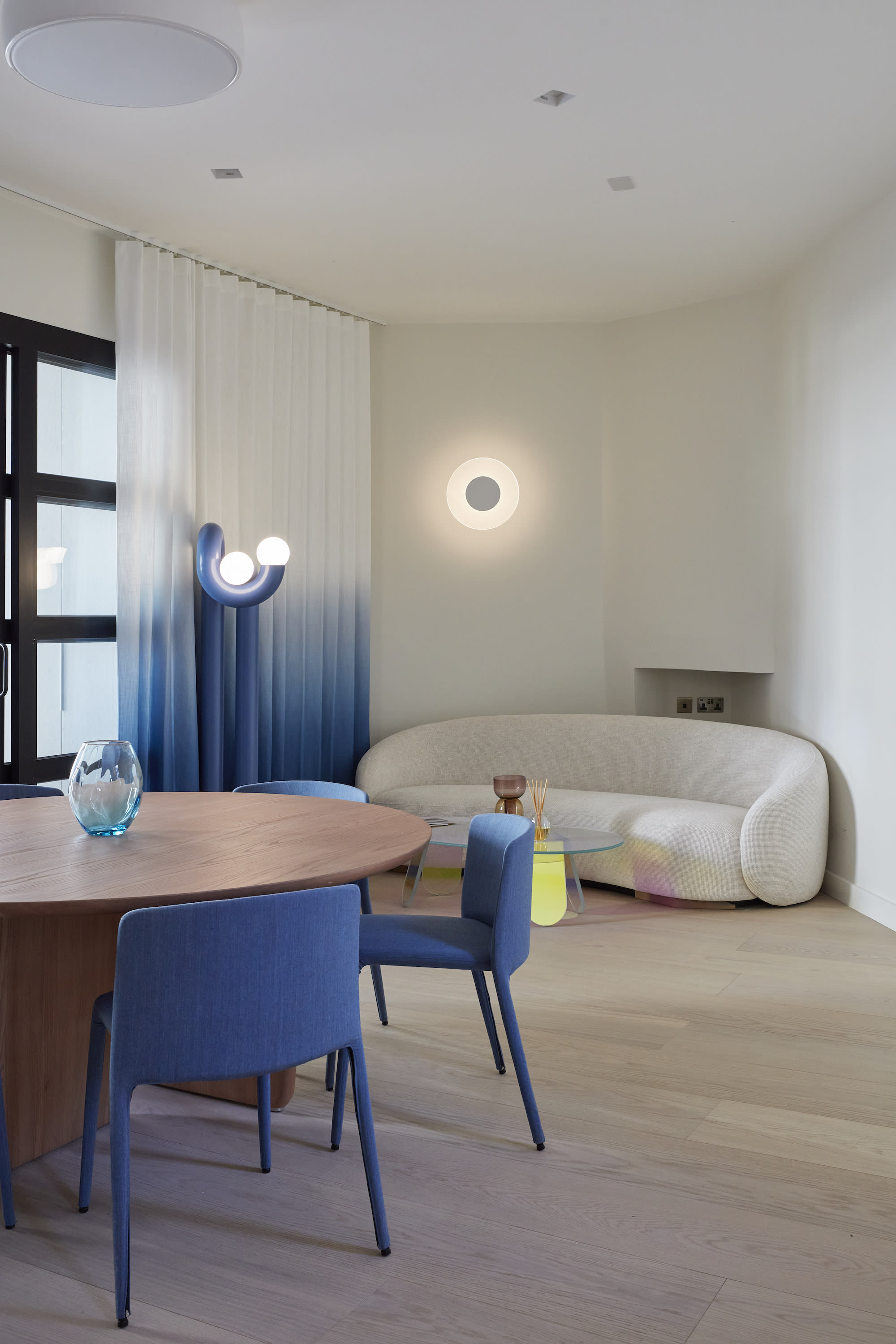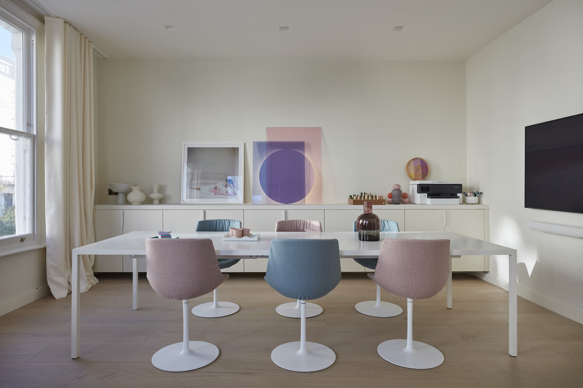 The design concept cantered on injecting vitality and character into the space using colour, drawing inspiration from the company's brand identity to subtly reintroduce elements of playfulness and brightness. By blending modern colour palettes with a nod to 80s aesthetics, the objective was to cultivate a dynamic ambiance while retaining a contemporary sensibility. Featured across the open-plan workplace, Havwoods’ Serres Prime 1-Strip flooring in Platinum complements the high-end boutique ambience, creating a feeling of brightness throughout. A light yet warm colourway, the flooring is the ideal choice for this revamped space, combining beautiful aesthetics with practicality.