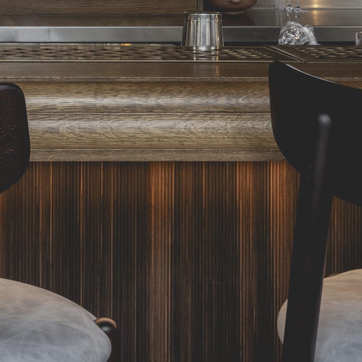 Taking inspiration from the vibrant cicchetti and pintxos bars of Italy and Spain, the heart of the wine bar’s design is the Ebony Costato veneer from Havwoods' Elegante range—a striking choice that enhances the space with its rich, dark tones.