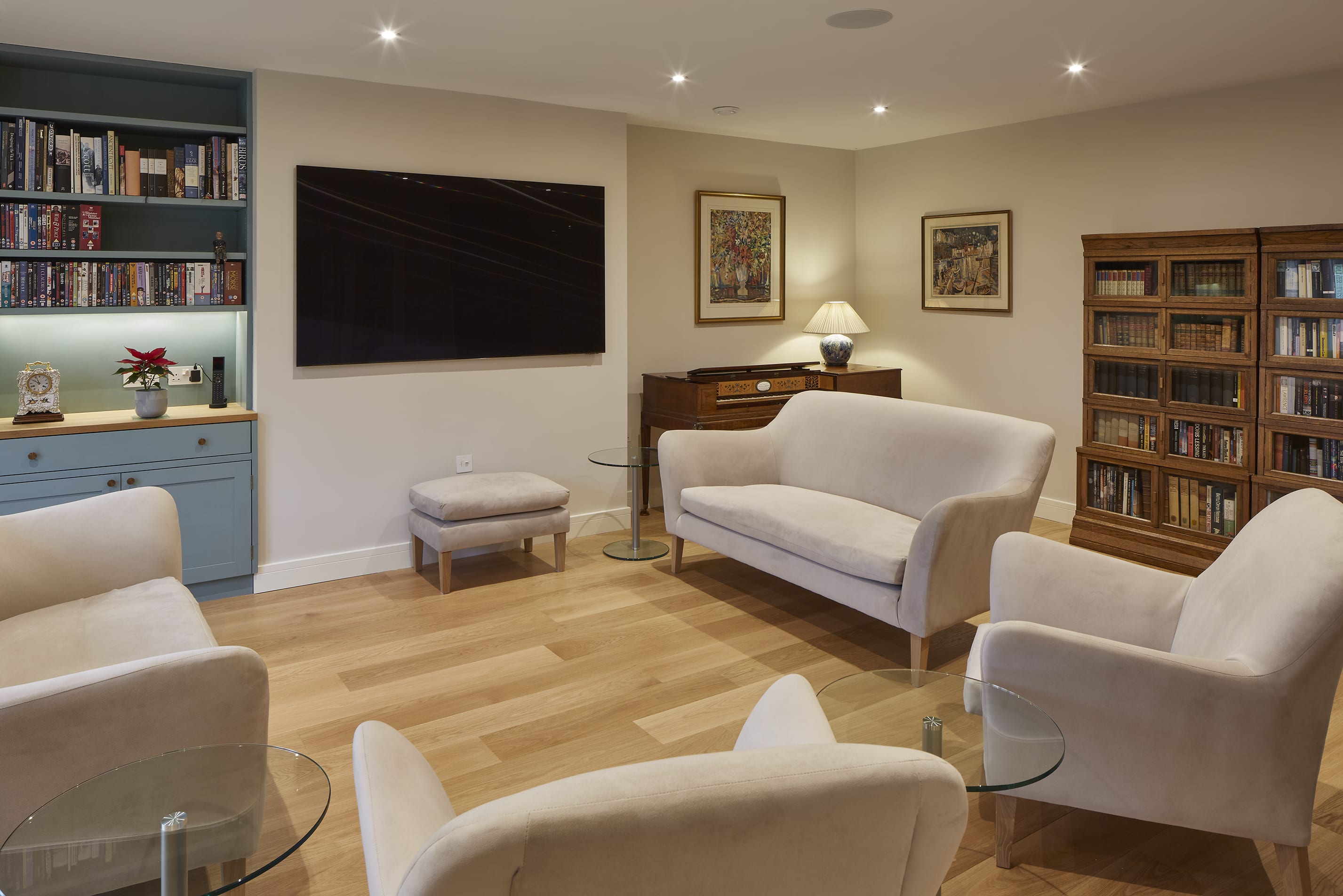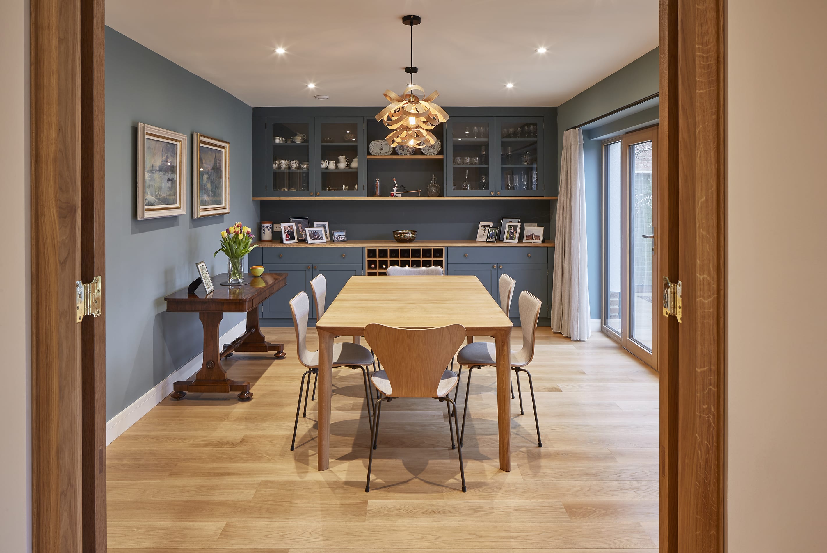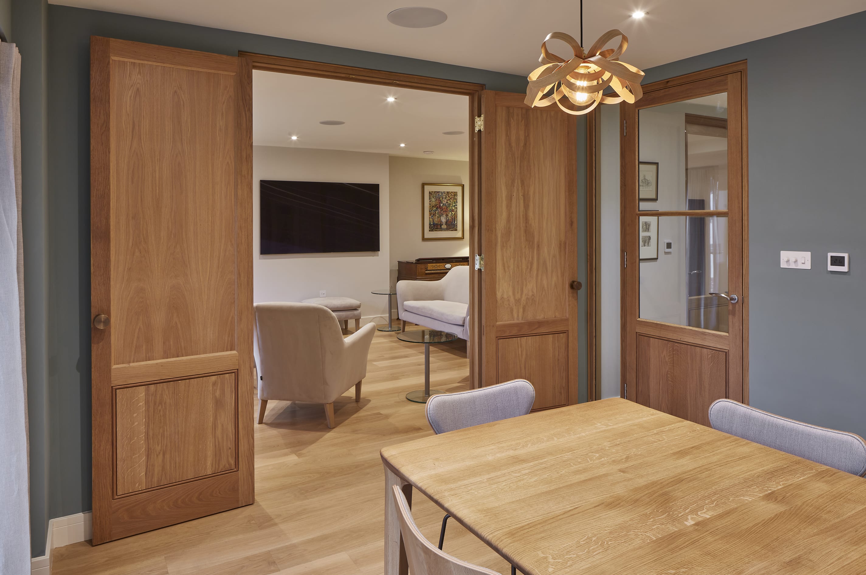 The glass internal doors contribute to the spacious feel of the home, whilst the bifold external doors provide ample natural light. The choice of spotlights offers great accent lighting, and the positioning of the accent lamps adds a cosy, warm element.