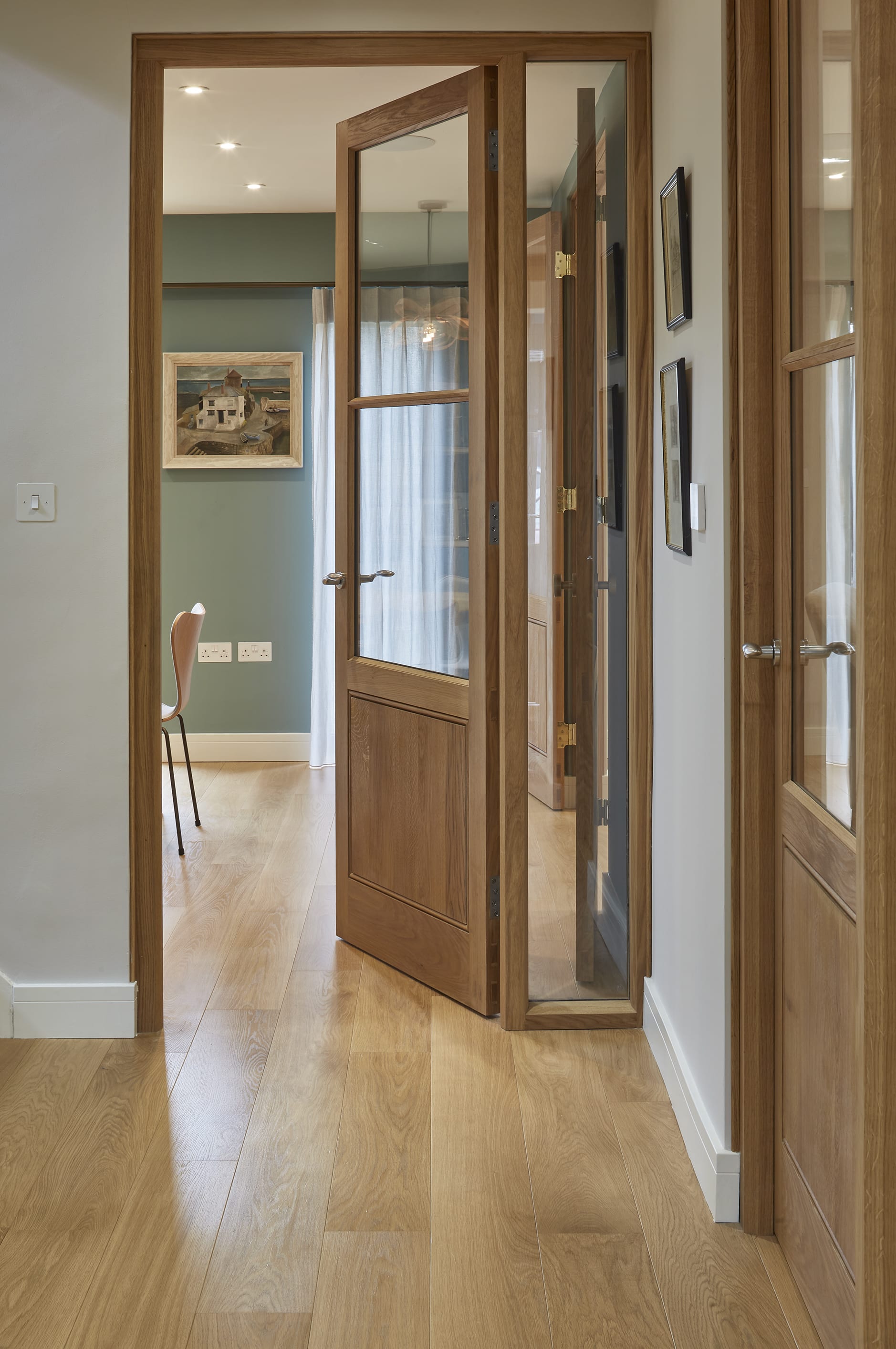 Natural materials take centre-stage in the home, with wood used throughout – from the flooring to the furniture. This continues through to the wooden internal doors and door frames, with the cream sofa and armchair encouraging the overall neutral and minimalist design.