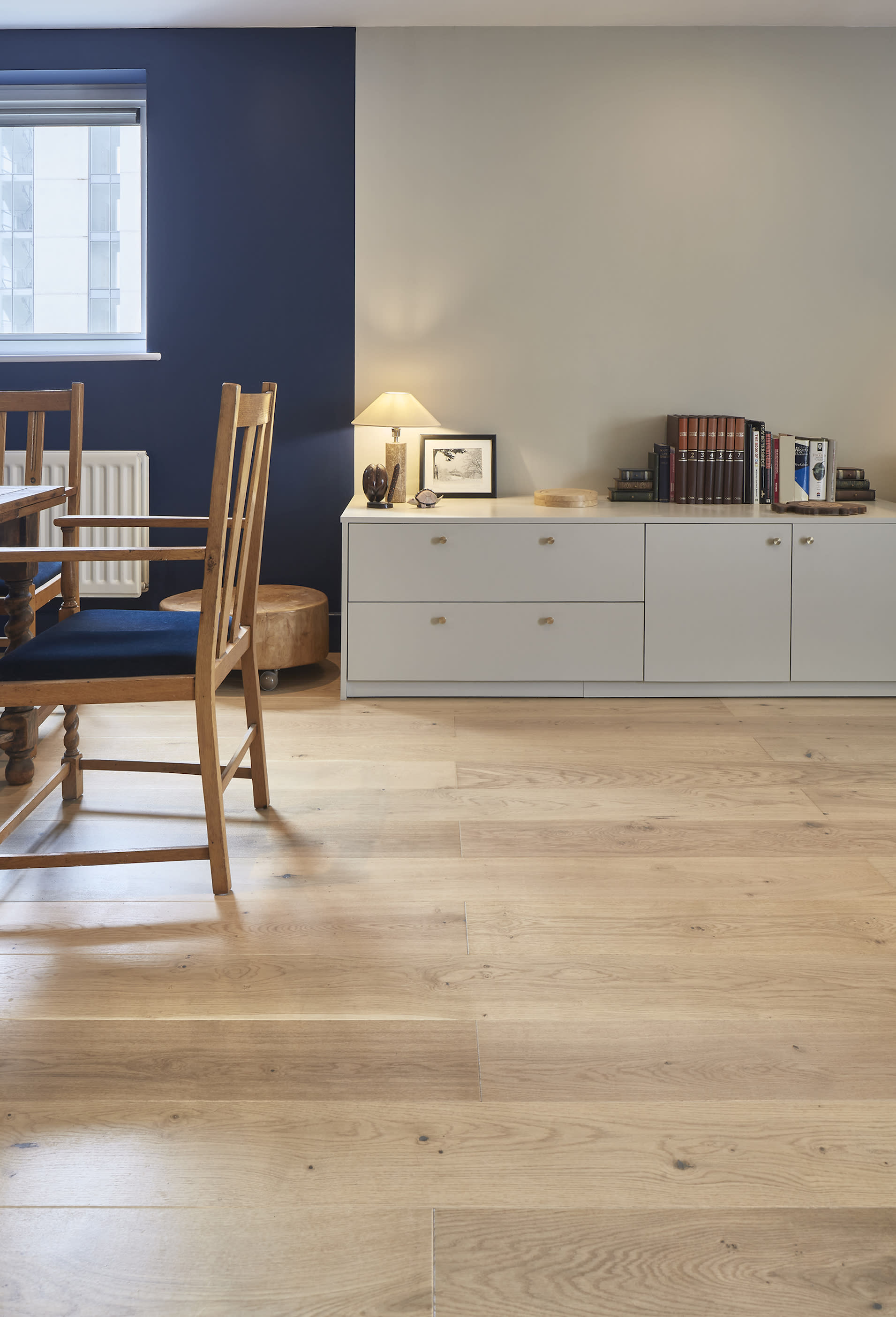 The FSC-certified timber engineered bards are robust, timeless and easy to maintain. The planks have been laid spanning the longest length of the room, helping to elongate the feeling of space within the apartment and adding warmth to the cooler colour palette of grey and navy blue - whilst complementing the existing wooden furniture.