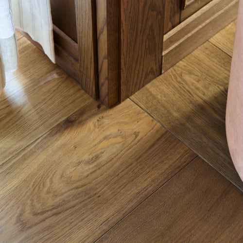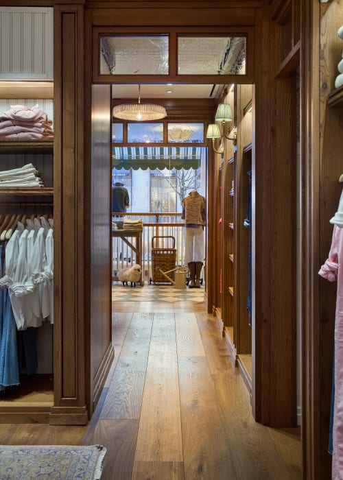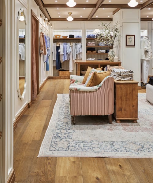 Portland from the Henley collection plays a pivotal role in shaping the store’s identity. This auburn toned, character grade plank introduces rich variation and natural detailing, reinforcing the lived-in, countryside aesthetic. The warmth of the wood grounds the space and complements the tactile finishes and soft textiles throughout.