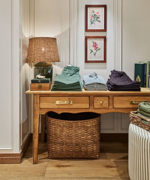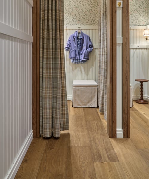 Portland from the Henley collection plays a pivotal role in shaping the store’s identity. This auburn toned, character grade plank introduces rich variation and natural detailing, reinforcing the lived-in, countryside aesthetic. The warmth of the wood grounds the space and complements the tactile finishes and soft textiles throughout.
