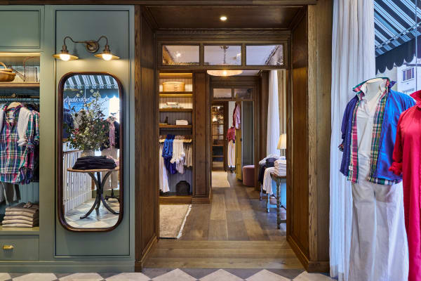 Key spaces within the store reinforce this residential concept. A kitchen style checkout creates a welcoming, informal point of connection. A thoughtfully designed mudroom adds a practical yet charming transition space, while a fireplace lounge with couches invites customers to slow down and linger.