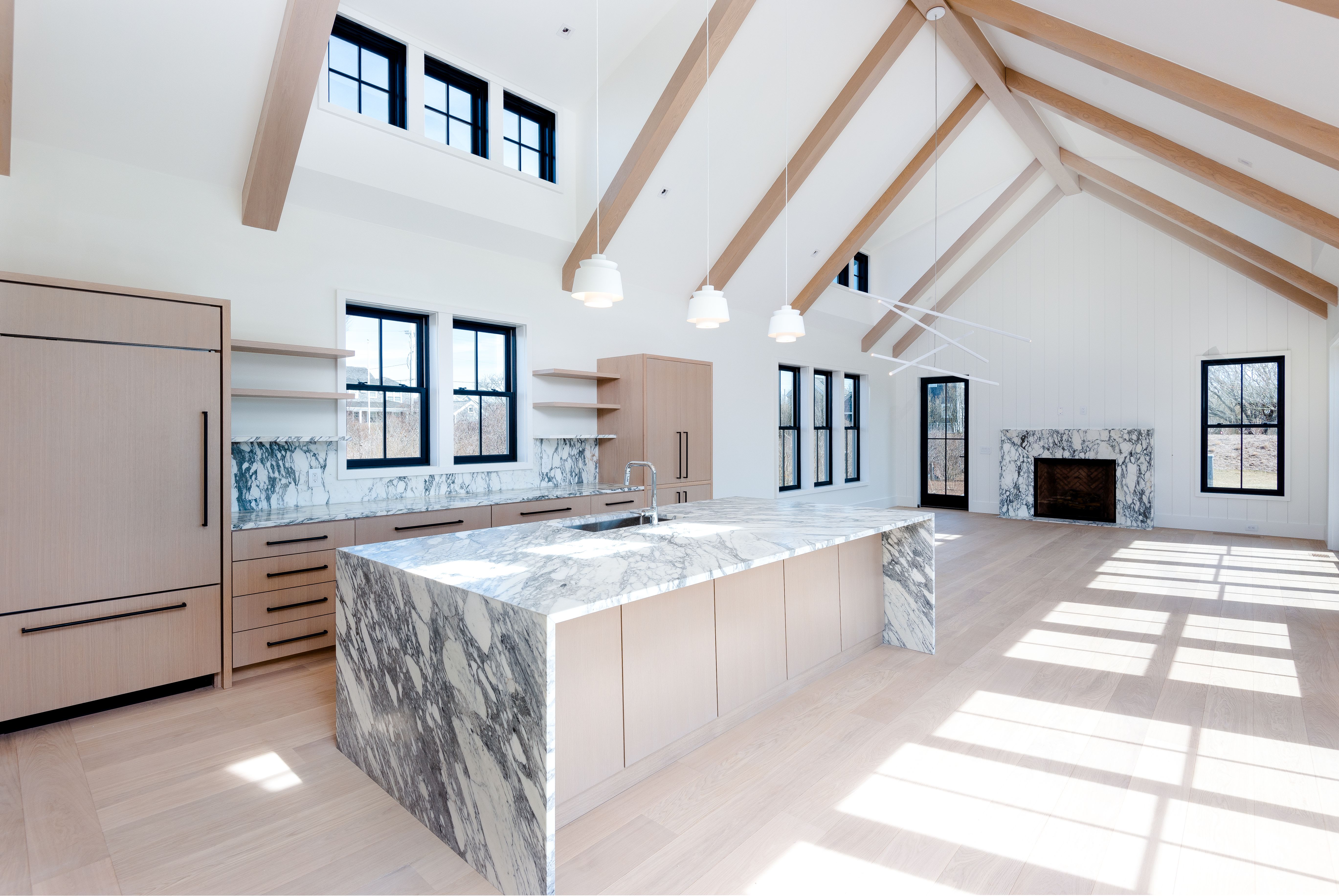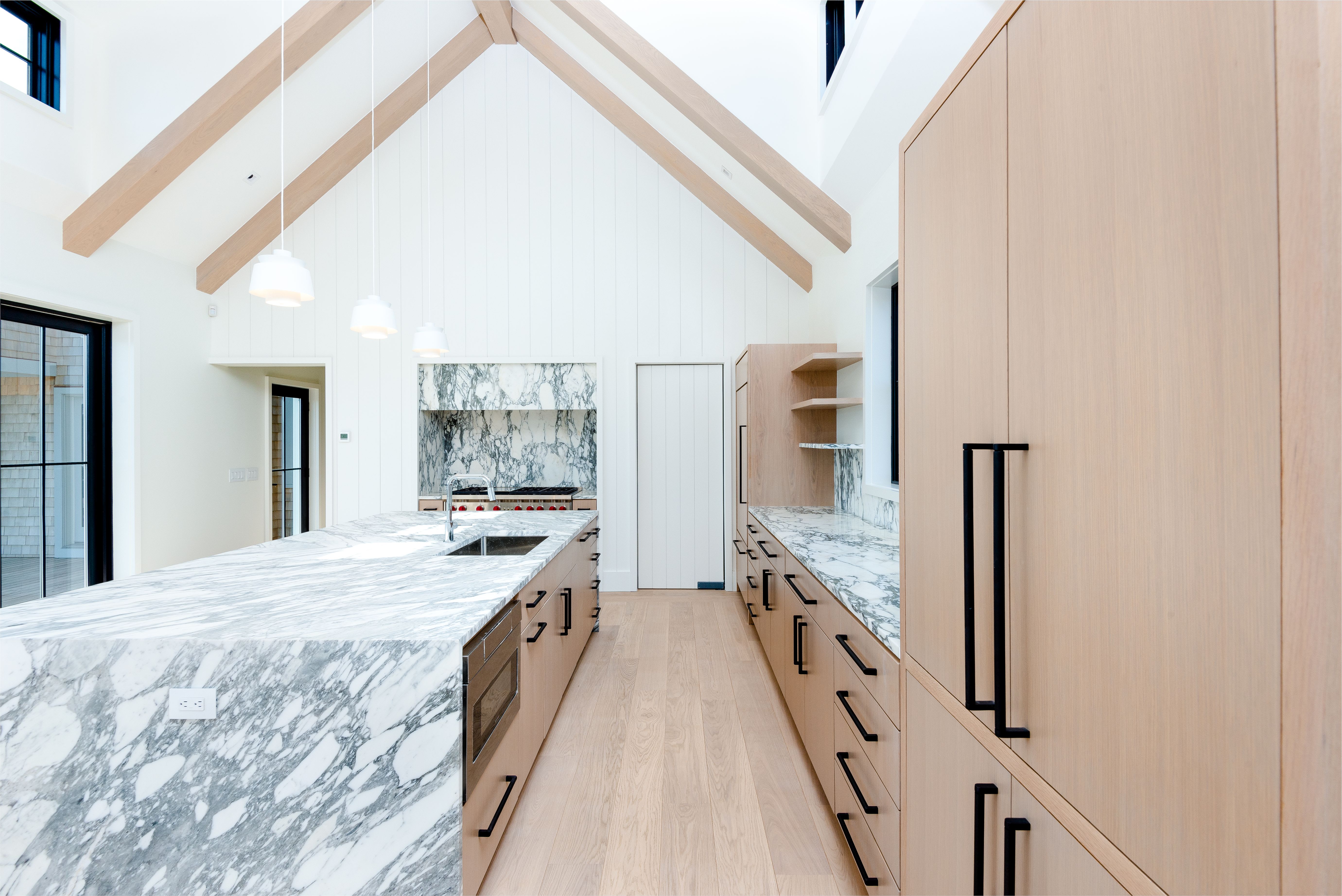 In harmony with the European oak flooring, solid white rift oak beams were incorporated to create symmetry and balance within the space. The kitchen design follows a robust and minimalist approach, while providing high functionality. The waterfall island marble countertop beautifully contrasts with the long straight floor panels, allowing it to stand out while maintaining a sense of warmth from the floor color. The cooler undertones of the Columba floor prevent the overall aesthetic from becoming too overpowering, resulting in a clean and harmonious look.