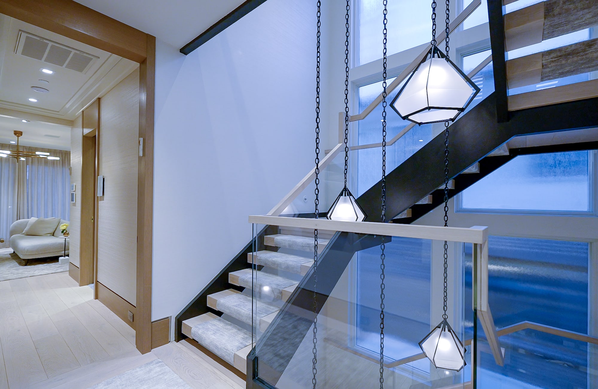 A true highlight of the home is the awe-inspiring three-story staircase, seemingly floating at the heart of the residence. The staircase features Blanco white oak flooring from Havwoods, its color perfectly complementing the surroundings. Moving upward to the second and third floors, guests encounter custom-built chandeliers by Gabriel Scott, each meticulously crafted to perfection.