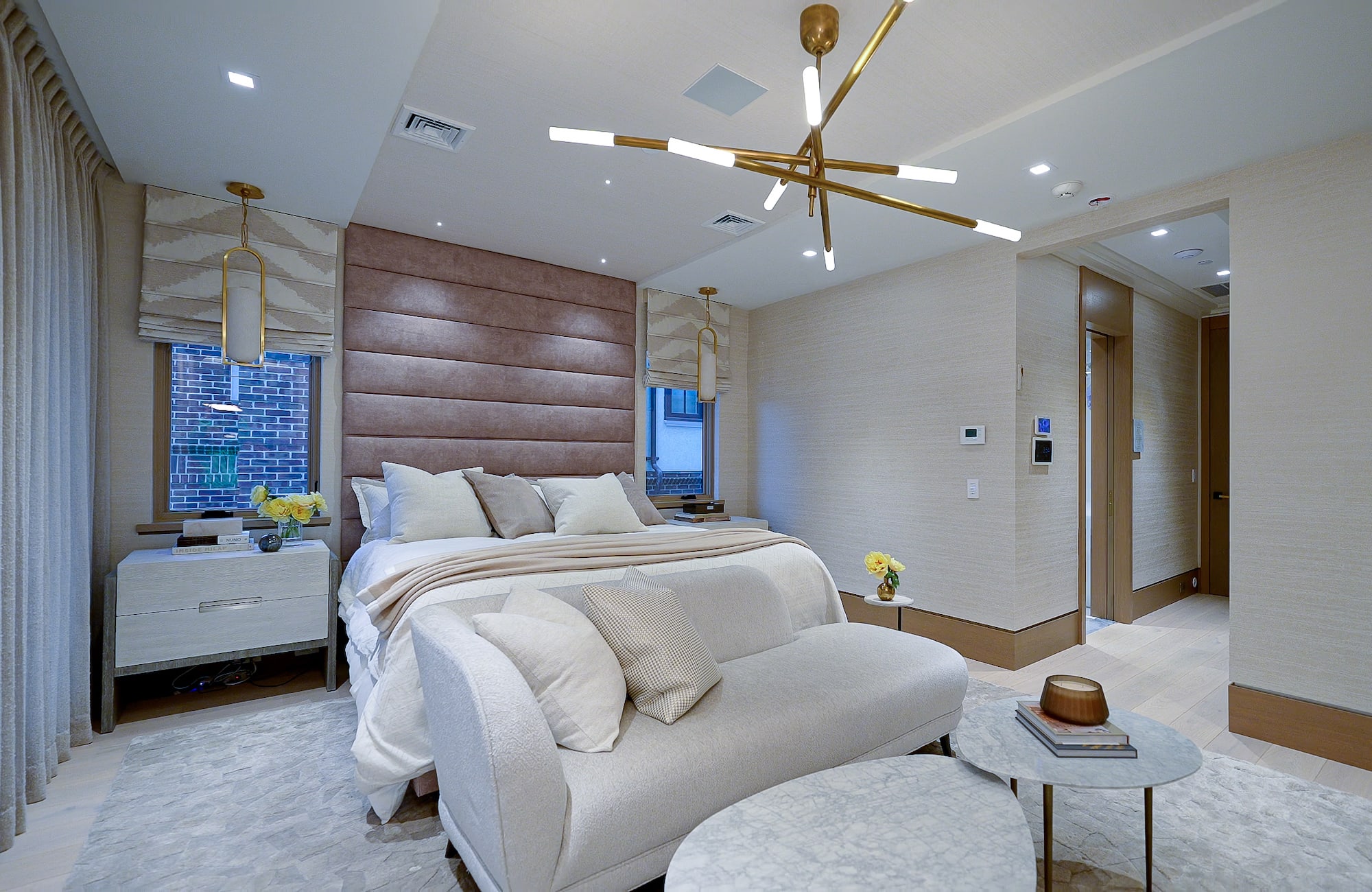 The fourth floor unveils a bespoke library and home office, complete with an impressive dividing wall. Two bedrooms on this level feature tailor-made wallpaper, custom-built beds, and a lounge area. Throughout this breathtaking home, Havwoods flooring seamlessly extends into the master bedroom, adding to the overall sense of elegance.