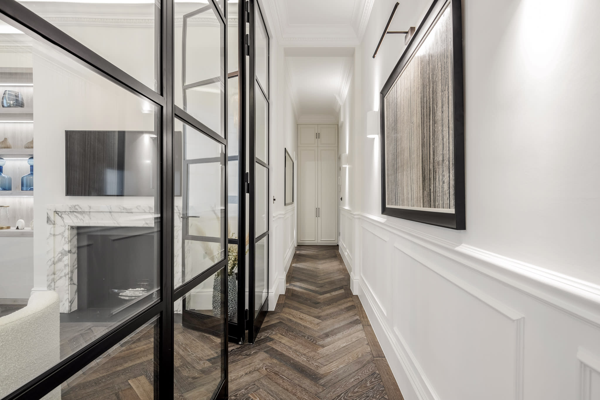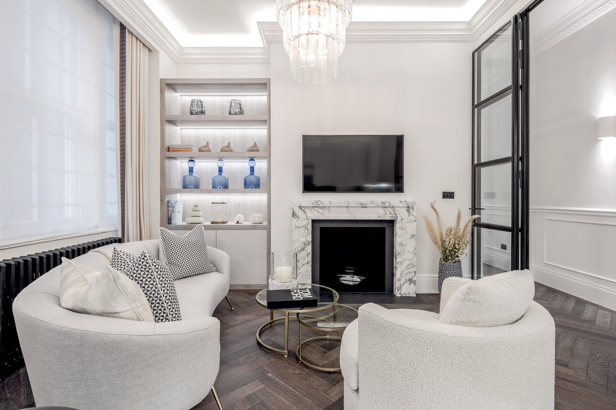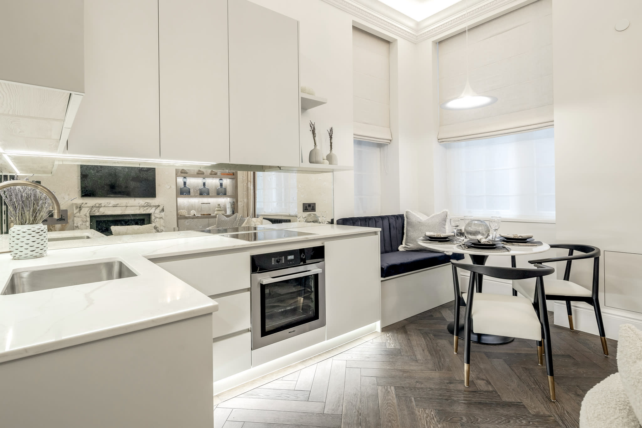 The design brief was to create a luxurious and minimalist feel to the space, whilst maintaining and highlighting the period features within the home such as the marble fireplace and wall panelling. Given the smaller footprint, the aim was to optimise light and space, which has been done with a monochrome colour palette throughout the open plan kitchen / diner and living room. From the pristine white walls that blend beautifully with the high ceilings, to the grand Crittall doors, each element assists in creating a clean and seamless look - perfect for the homeowners ahead of re-selling.
