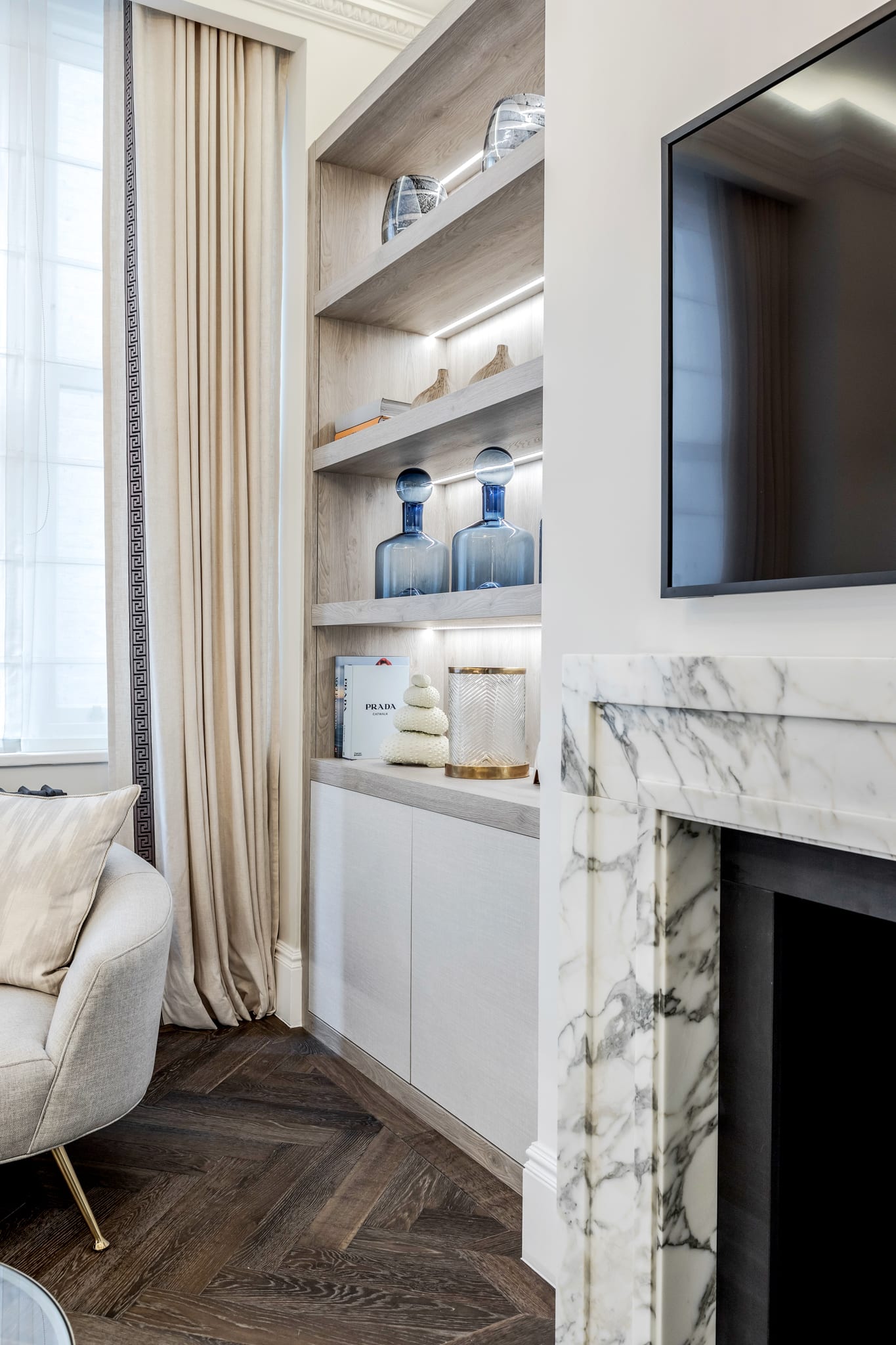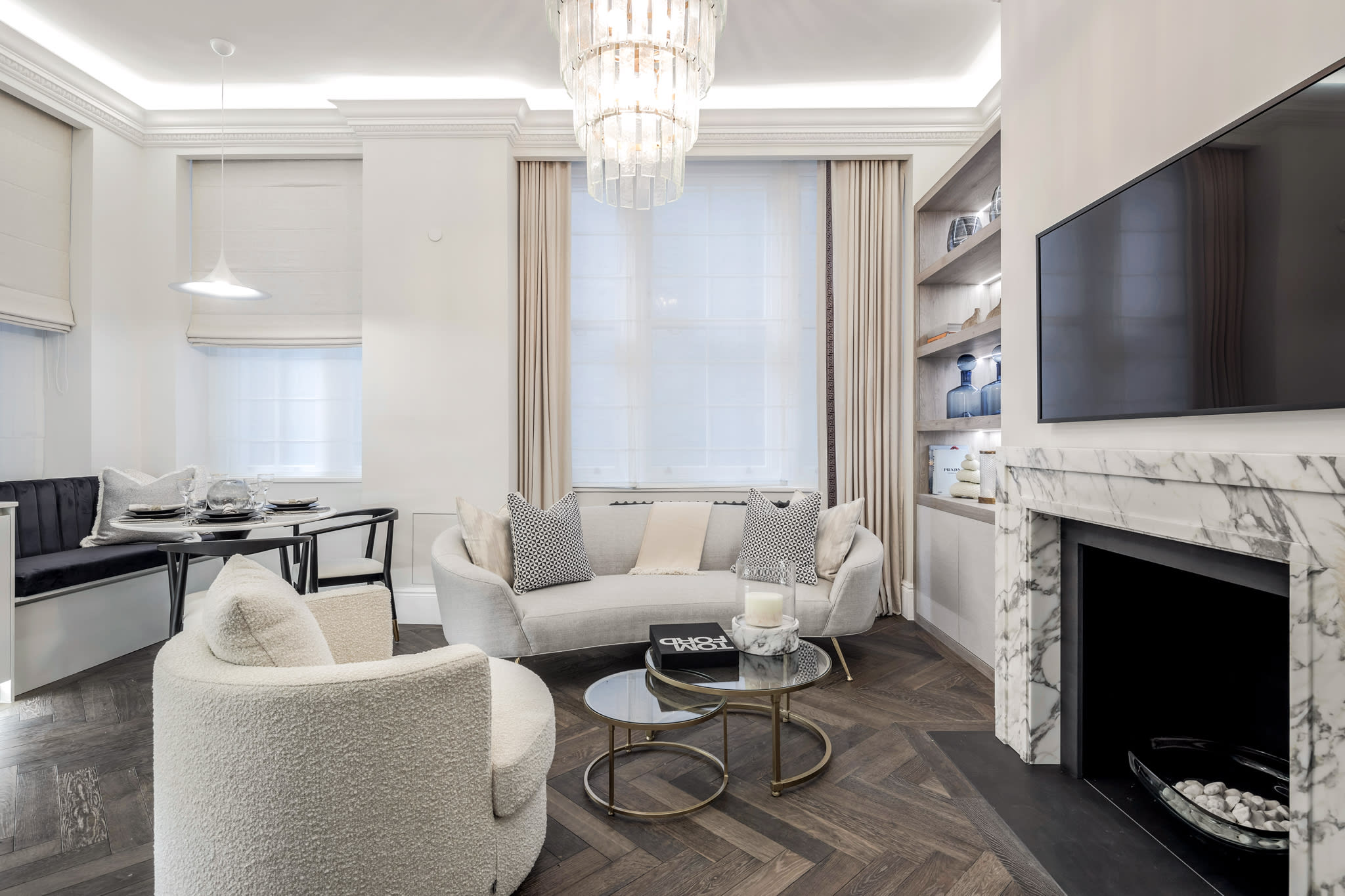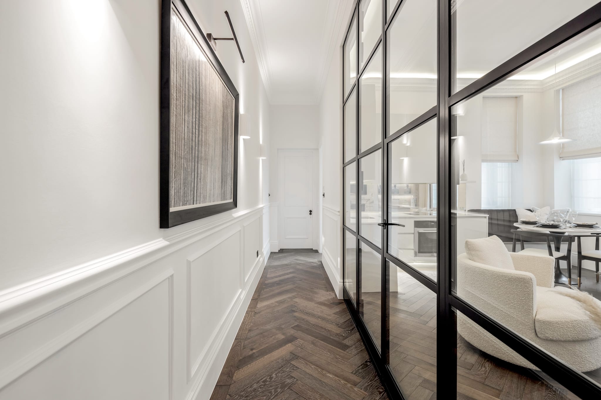 The design brief was to create a luxurious and minimalist feel to the space, whilst maintaining and highlighting the period features within the home such as the marble fireplace and wall panelling. Given the smaller footprint, the aim was to optimise light and space, which has been done with a monochrome colour palette throughout the open plan kitchen / diner and living room. From the pristine white walls that blend beautifully with the high ceilings, to the grand Crittall doors, each element assists in creating a clean and seamless look - perfect for the homeowners ahead of re-selling.