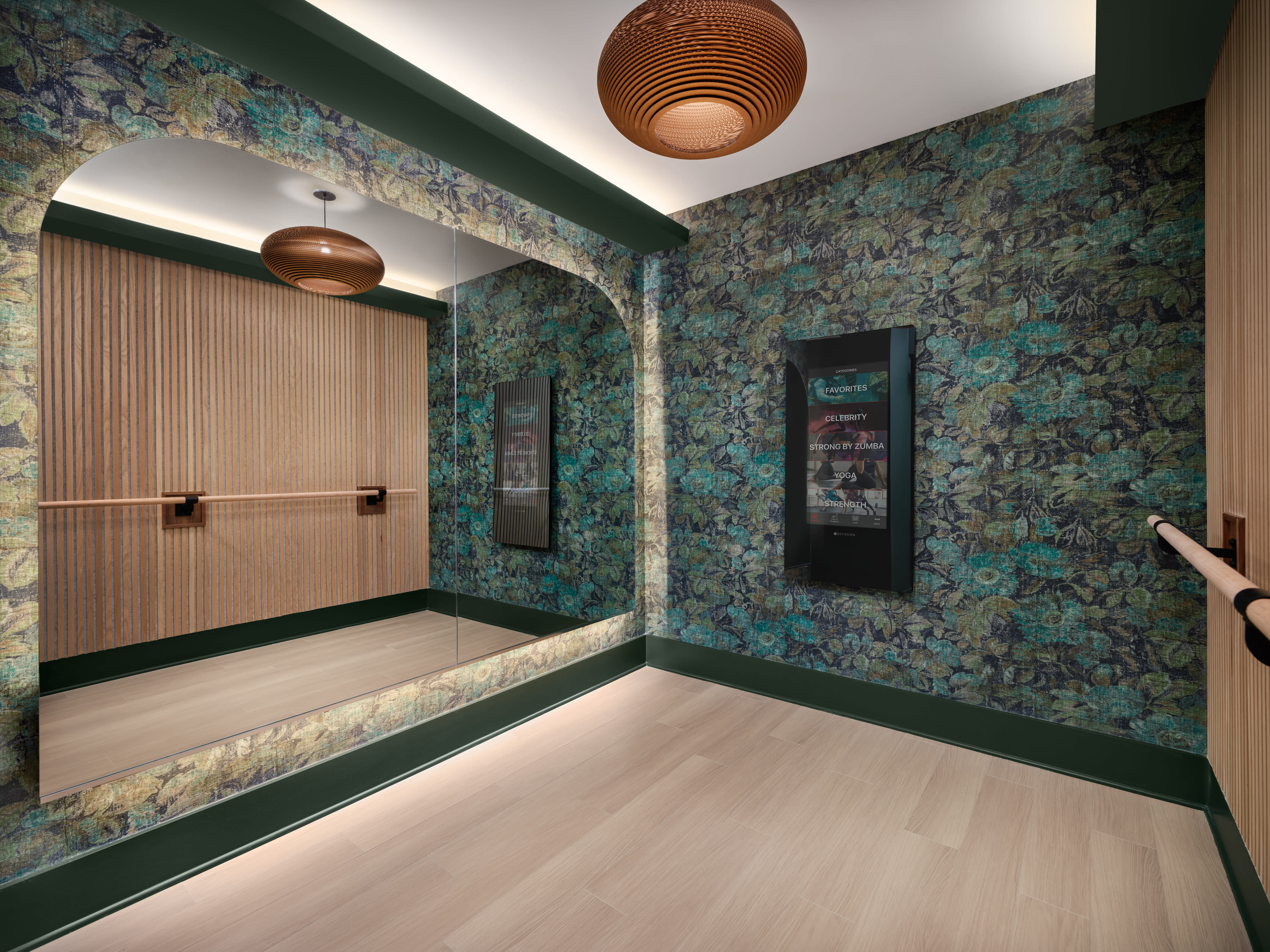 By specifying both plank and chevron formats in the same platinum tone, the design achieves visual harmony while allowing each space to maintain its own identity. The result is a cohesive amenity experience that supports productivity, relaxation, and daily living.